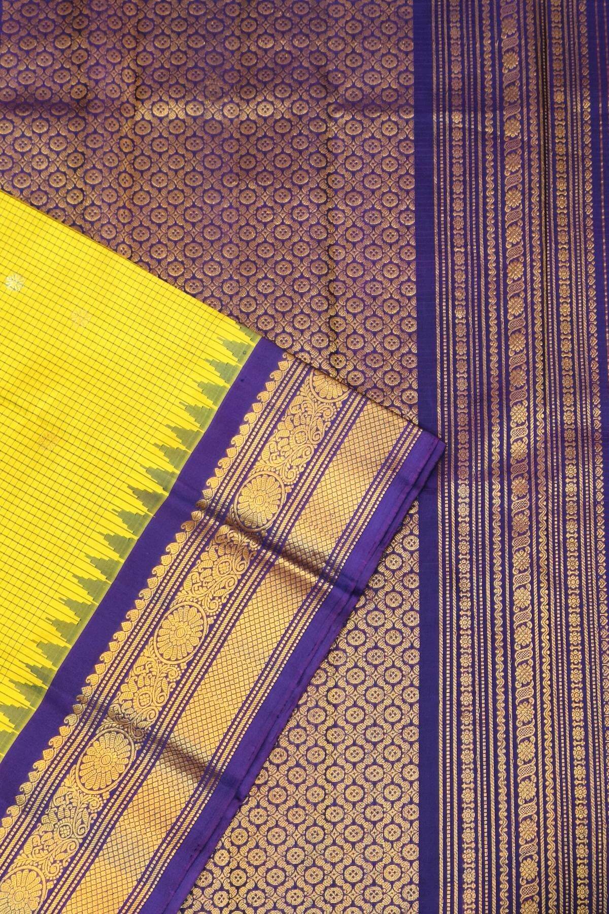 Description : Gadwal pure silk saree in lemon green yellow in checks with gold & silver buttis and a rich contrast pallu with temple border.