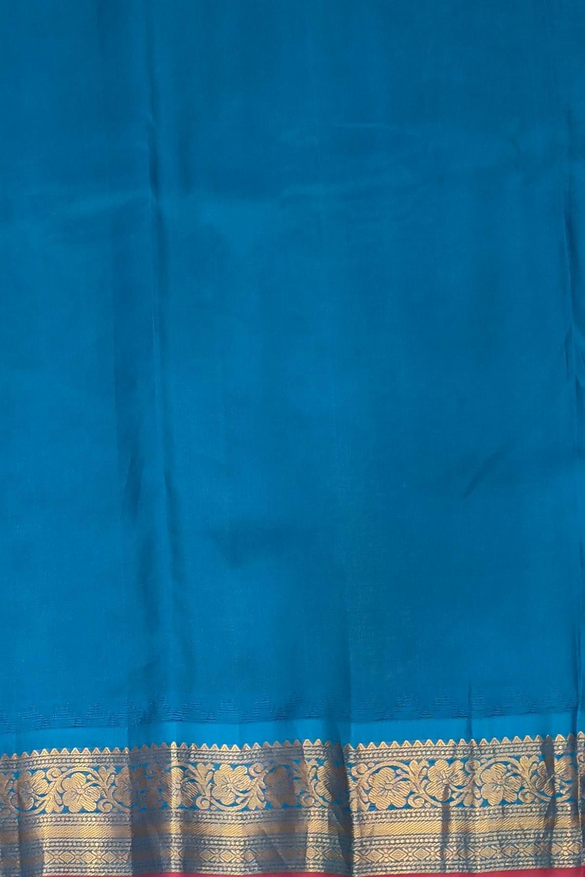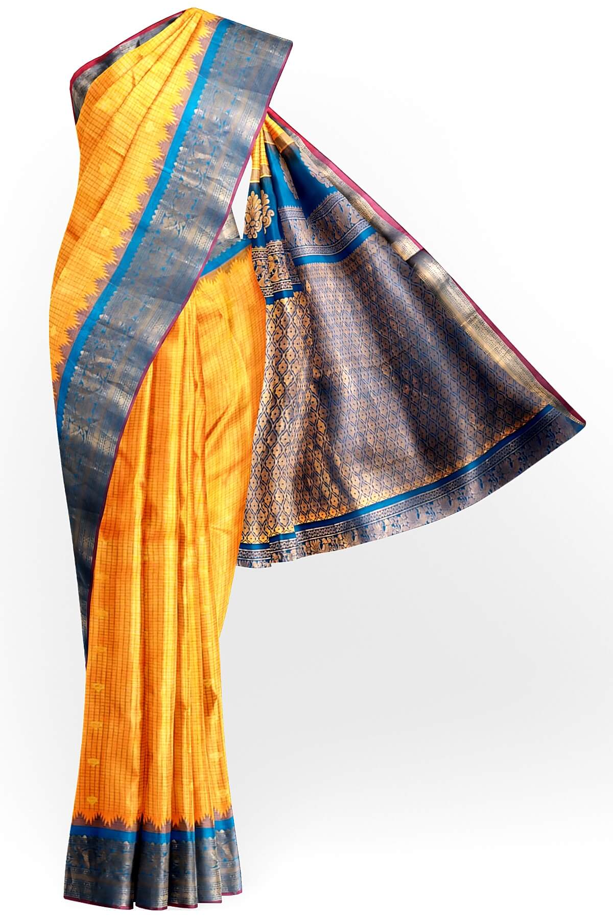 Description : Gadwal pure silk saree in mango yellow & teal blue with checks & buttis. This is enhanced with a rich pallu and a temple border.