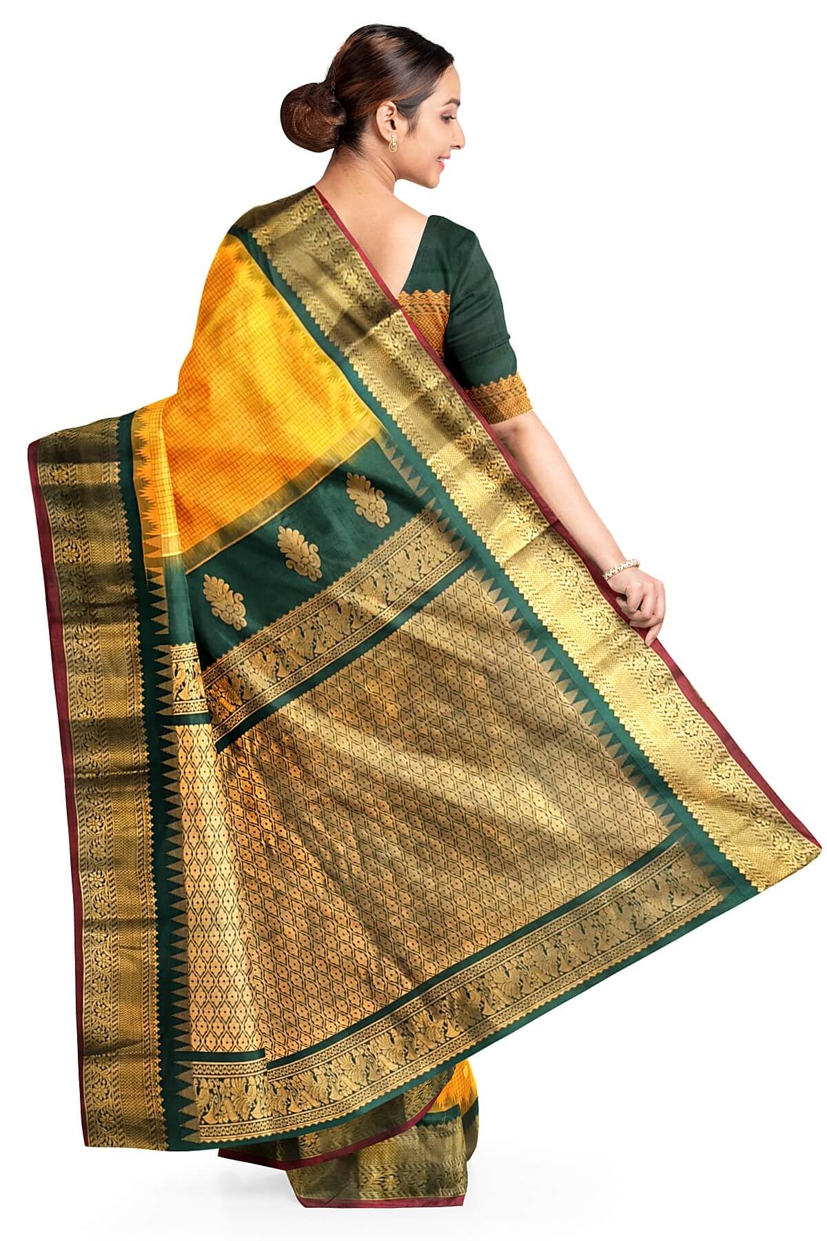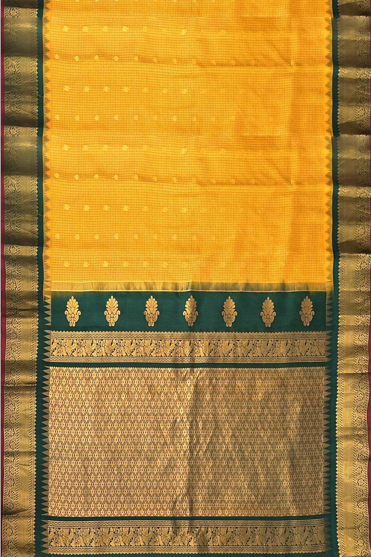 Description : Gadwal pure silk saree in mustard &  green with checks & buttis. This is enhanced with a rich pallu and a temple border.