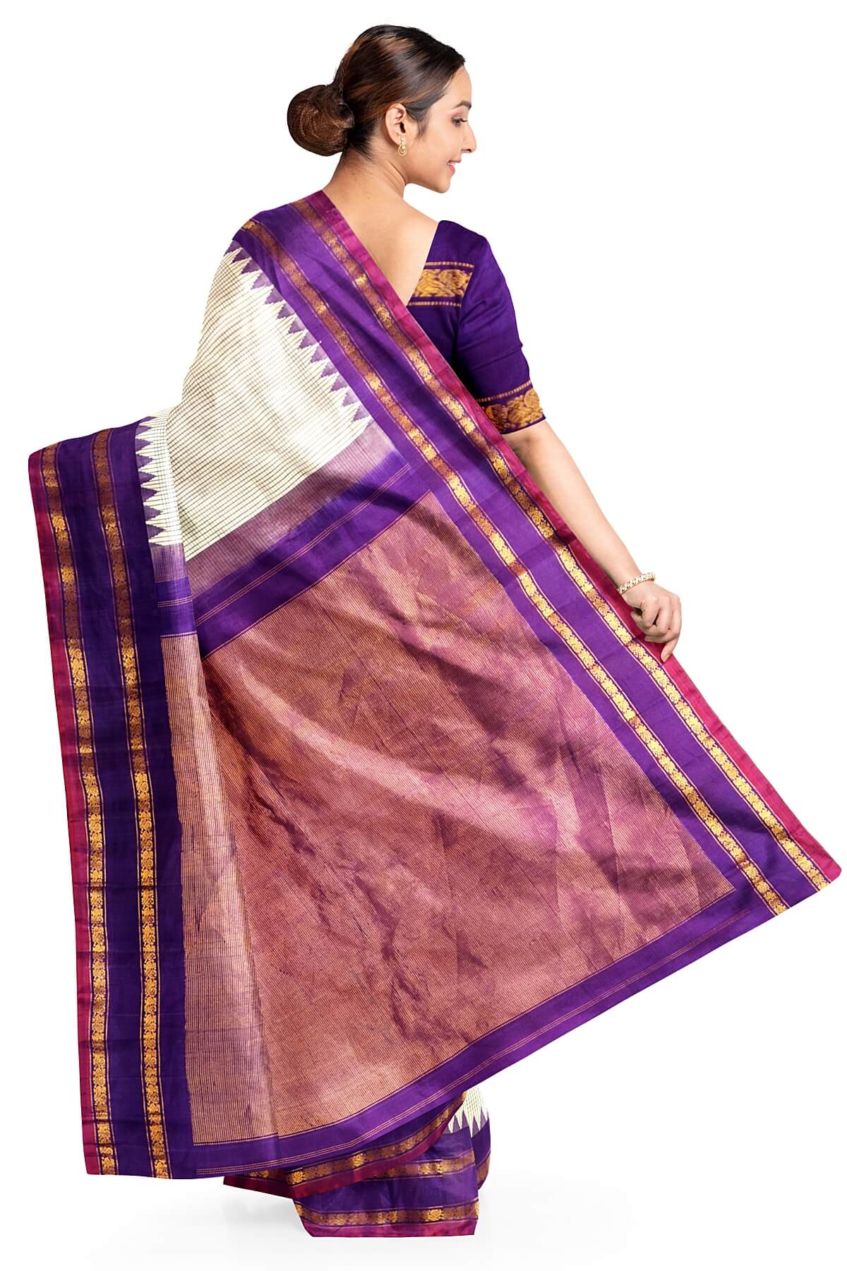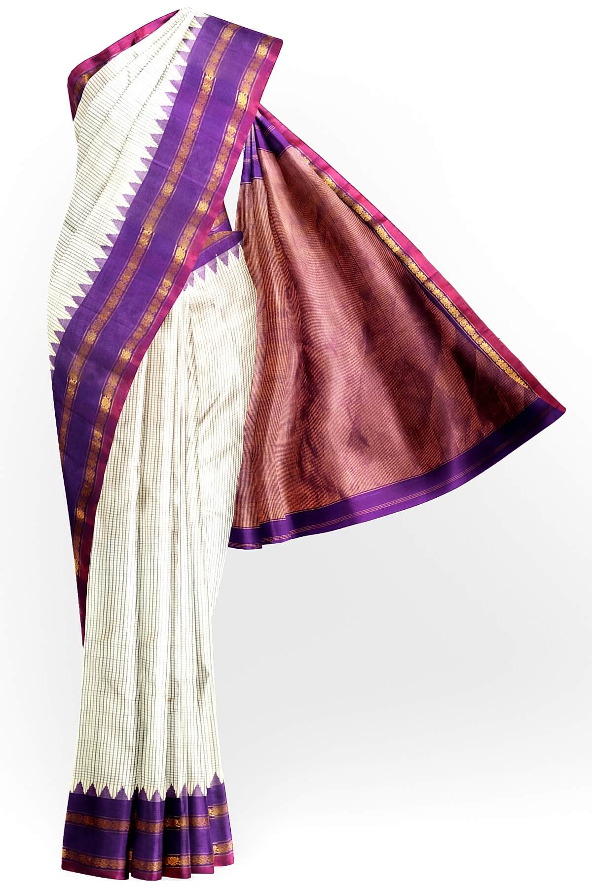 Description : Handloom Gadwal pure silk saree in off white with fine checks. The contrast pallu in purple and a gap border with temples..