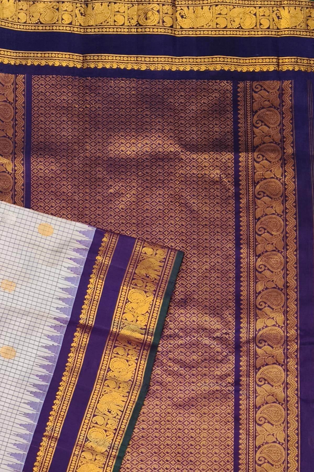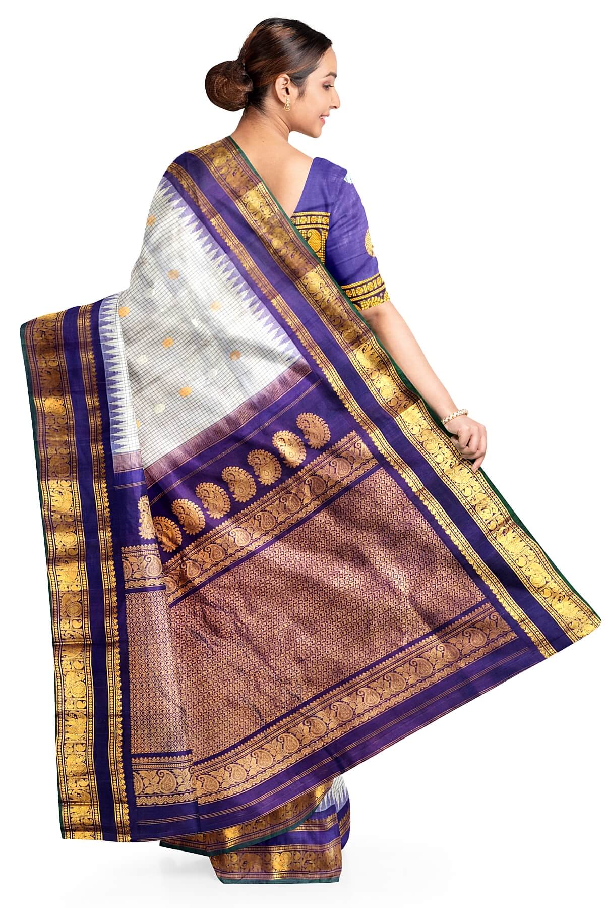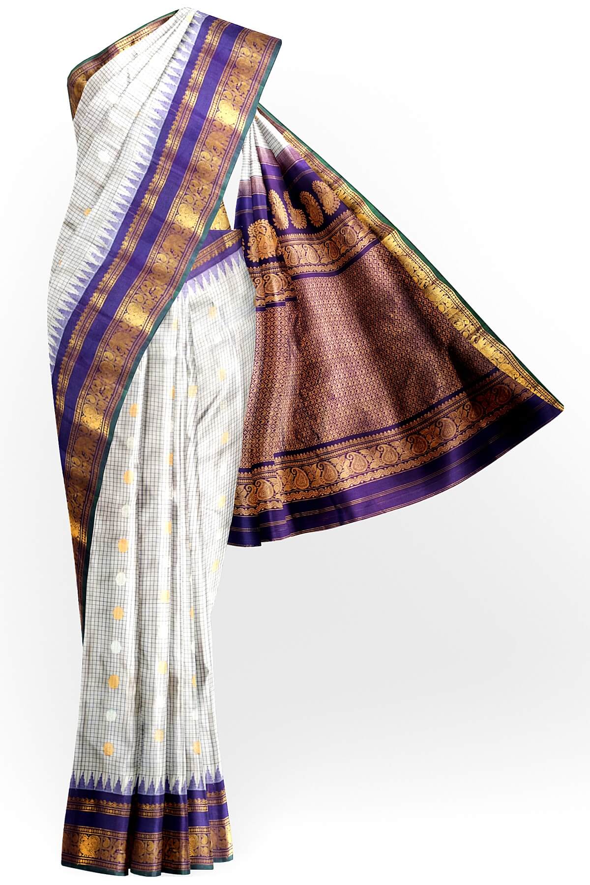 Description : Gadwal pure silk saree in off white in checks with gold & silver buttis and a rich contrast pallu with temple border.