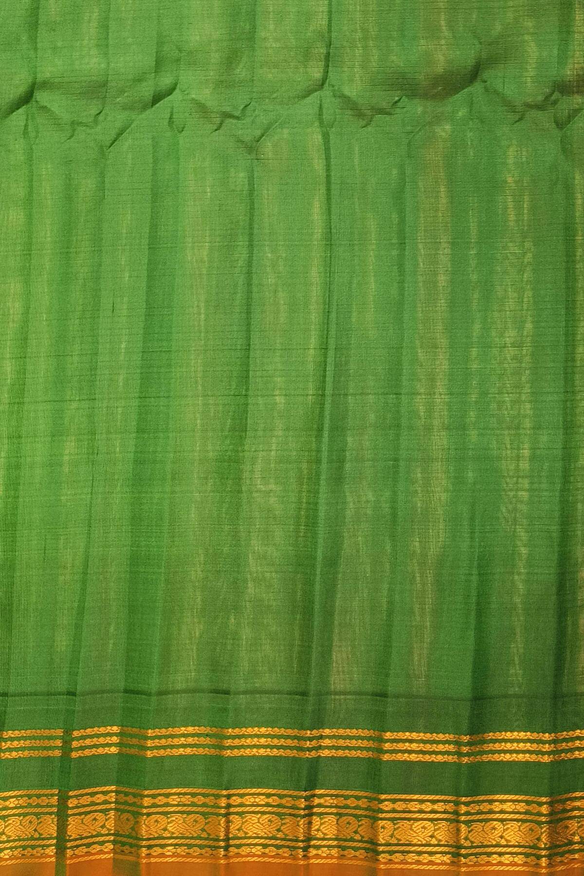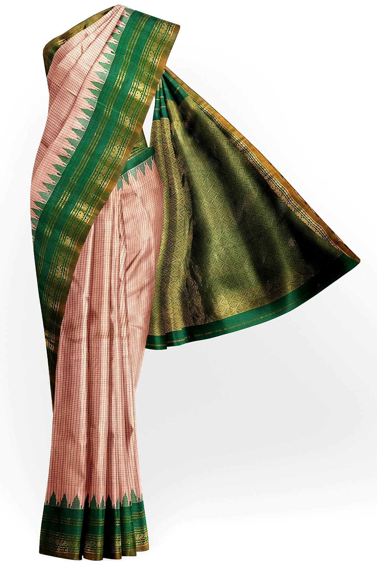 Description : Handloom Gadwal pure silk saree in peach with fine checks. The rich contrast pallu in green and a temple border.