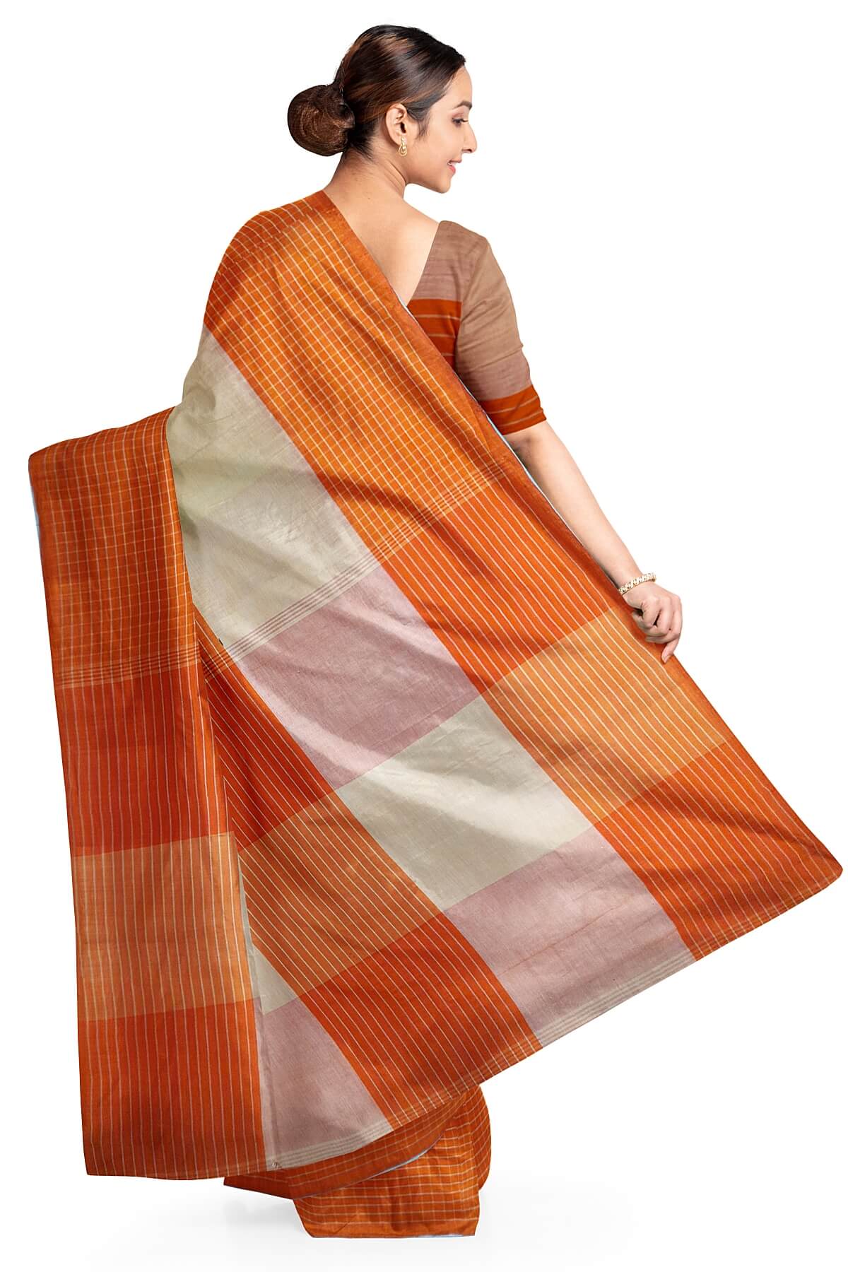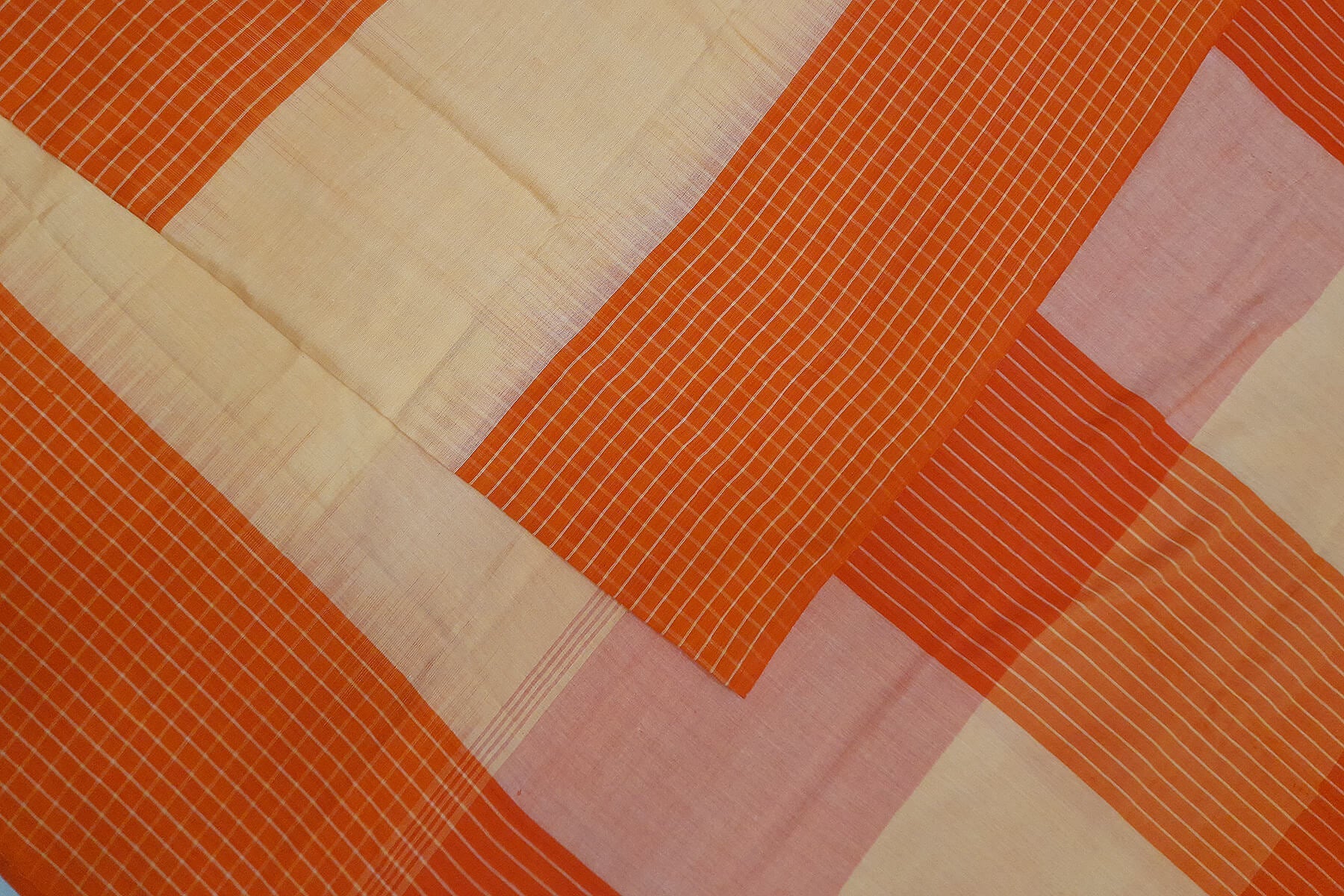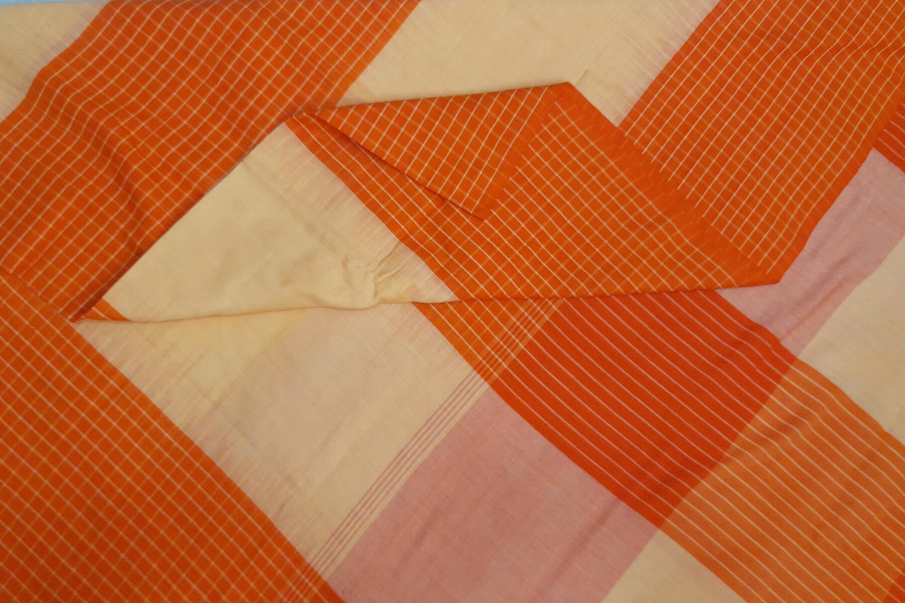 Description: Handwoven ikat cotton saree in orange & peach in checks & stripes.