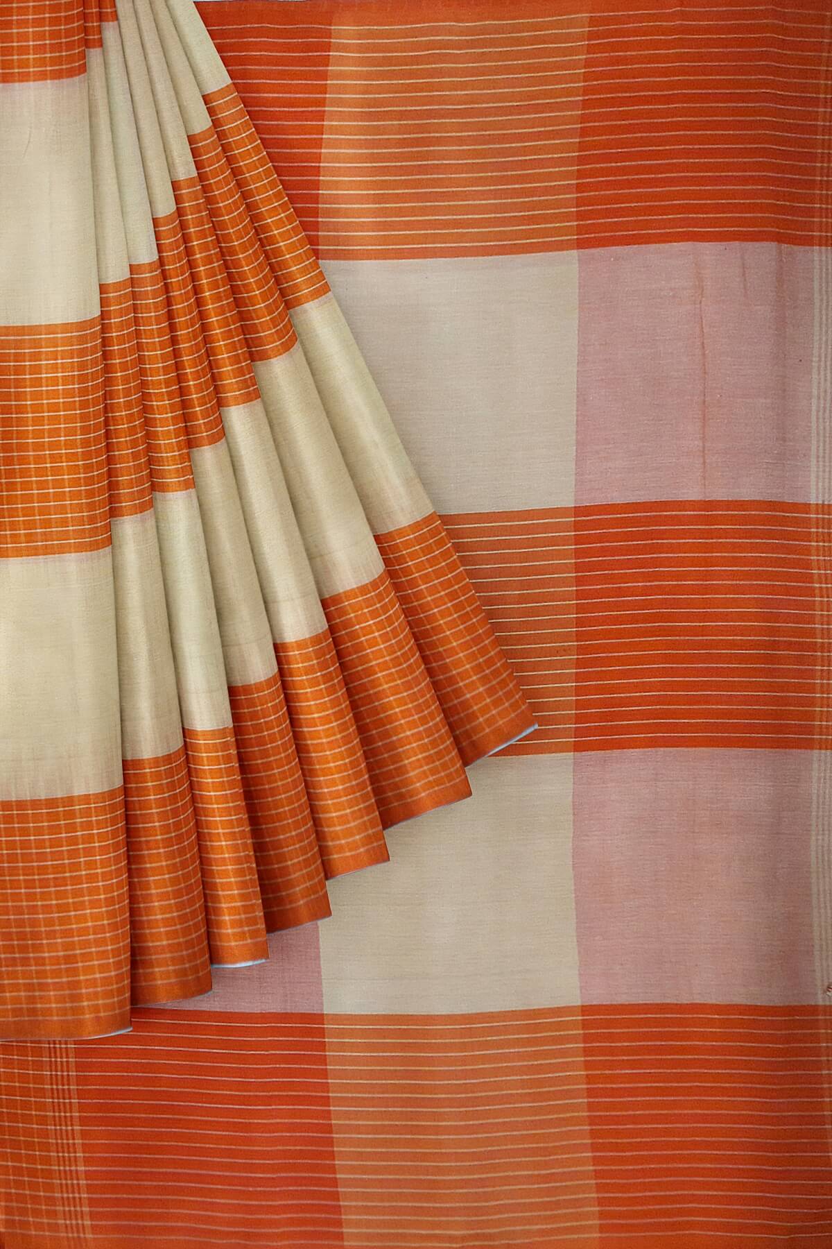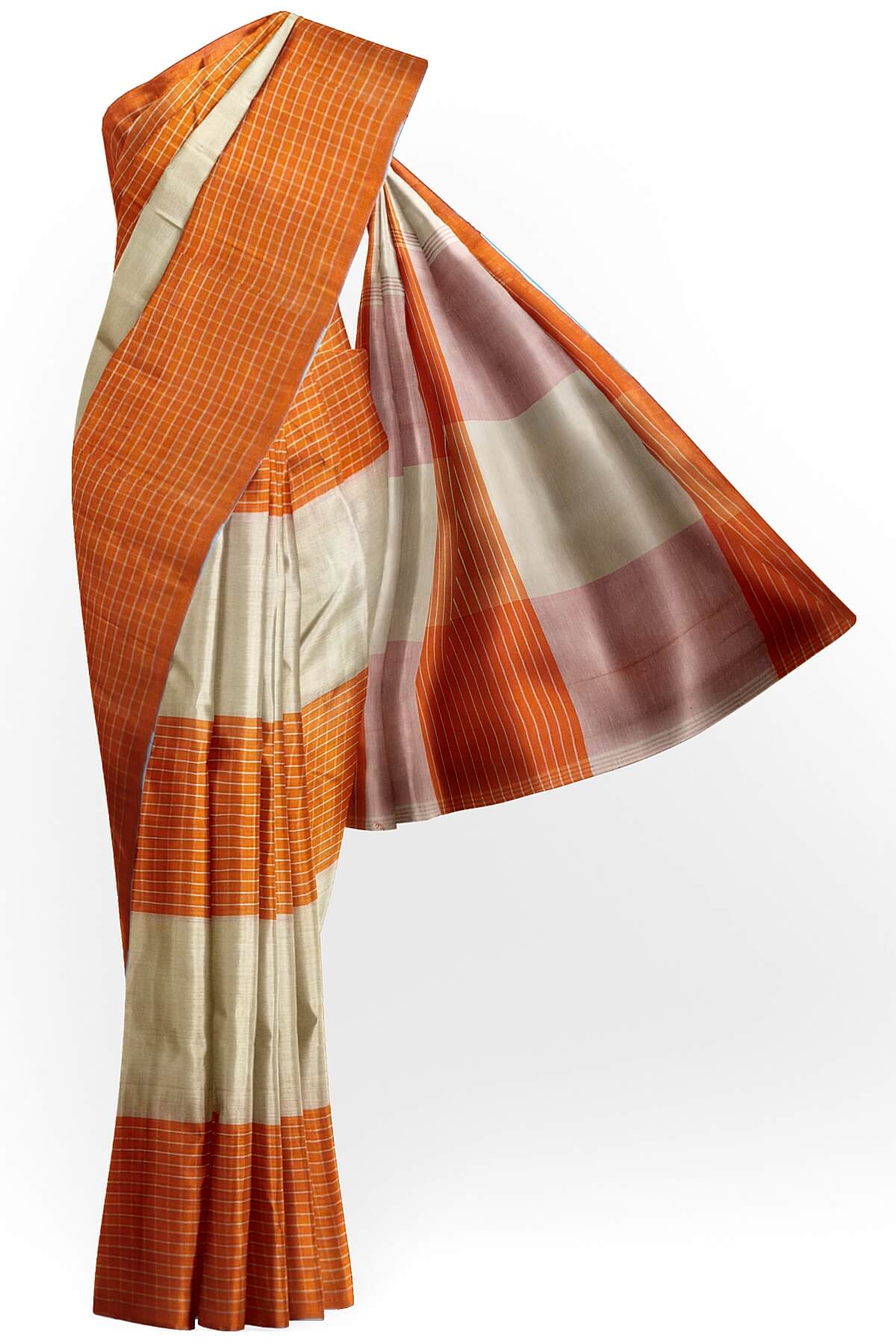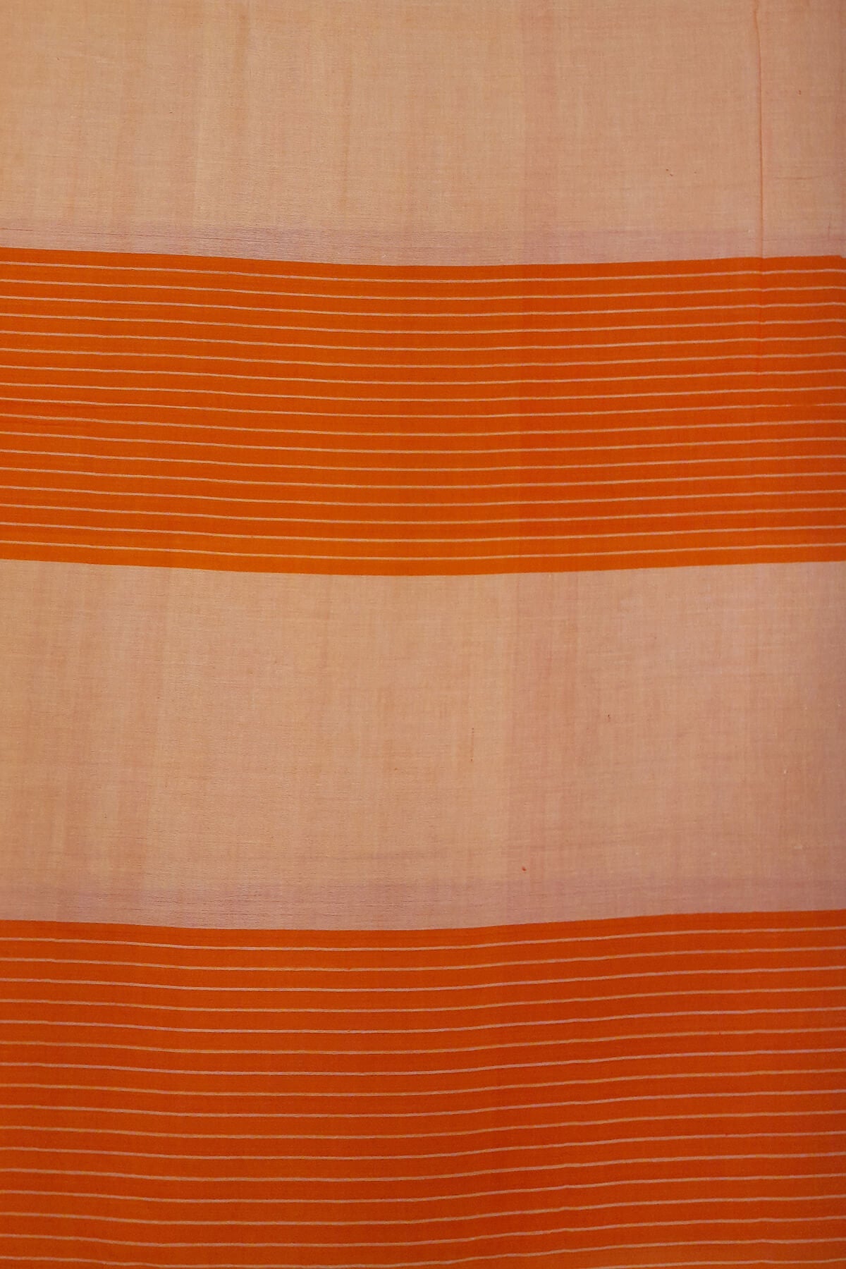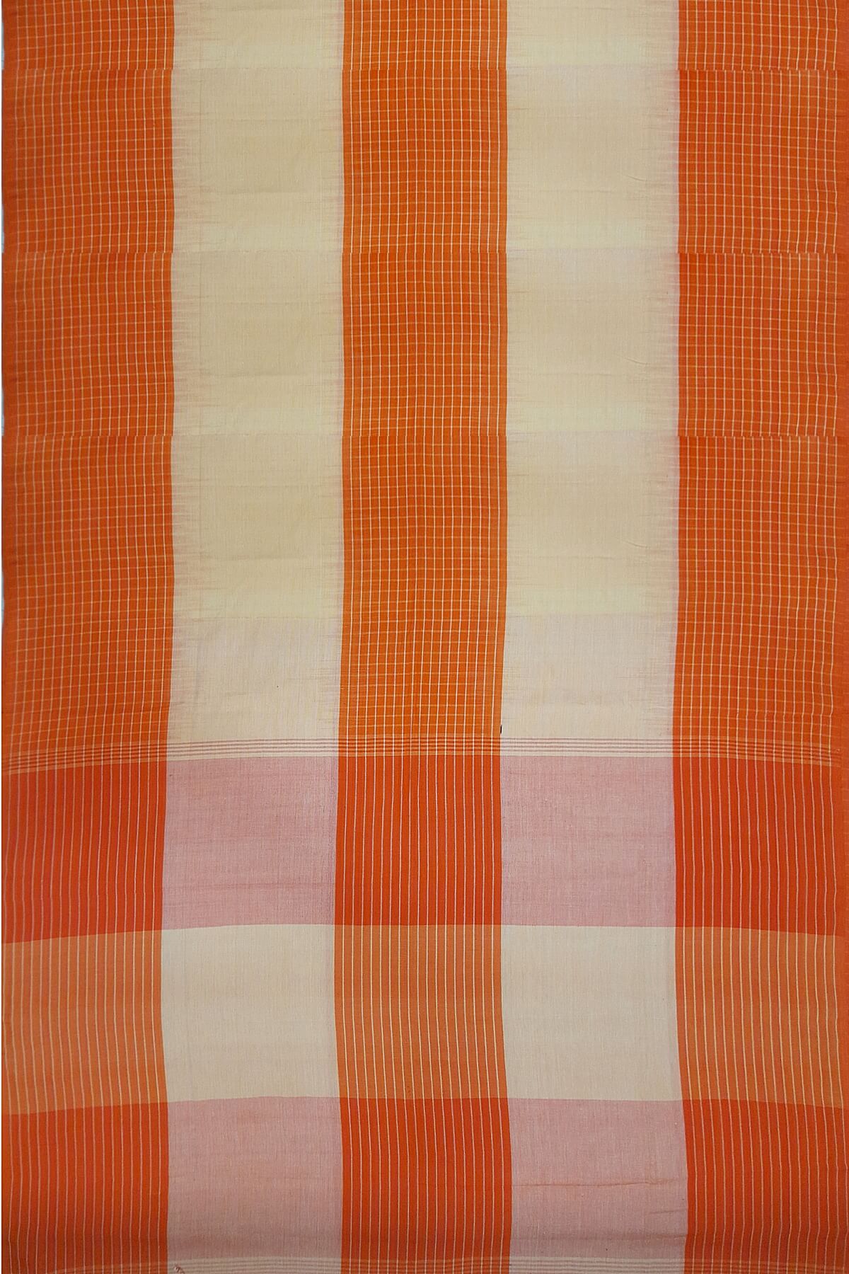 Description: Handwoven ikat cotton saree in orange & peach in checks & stripes.