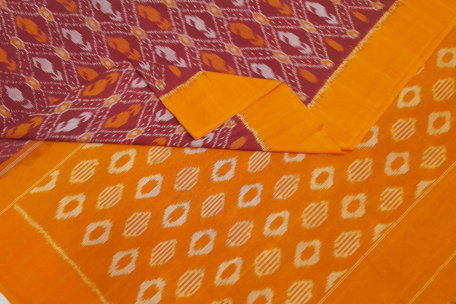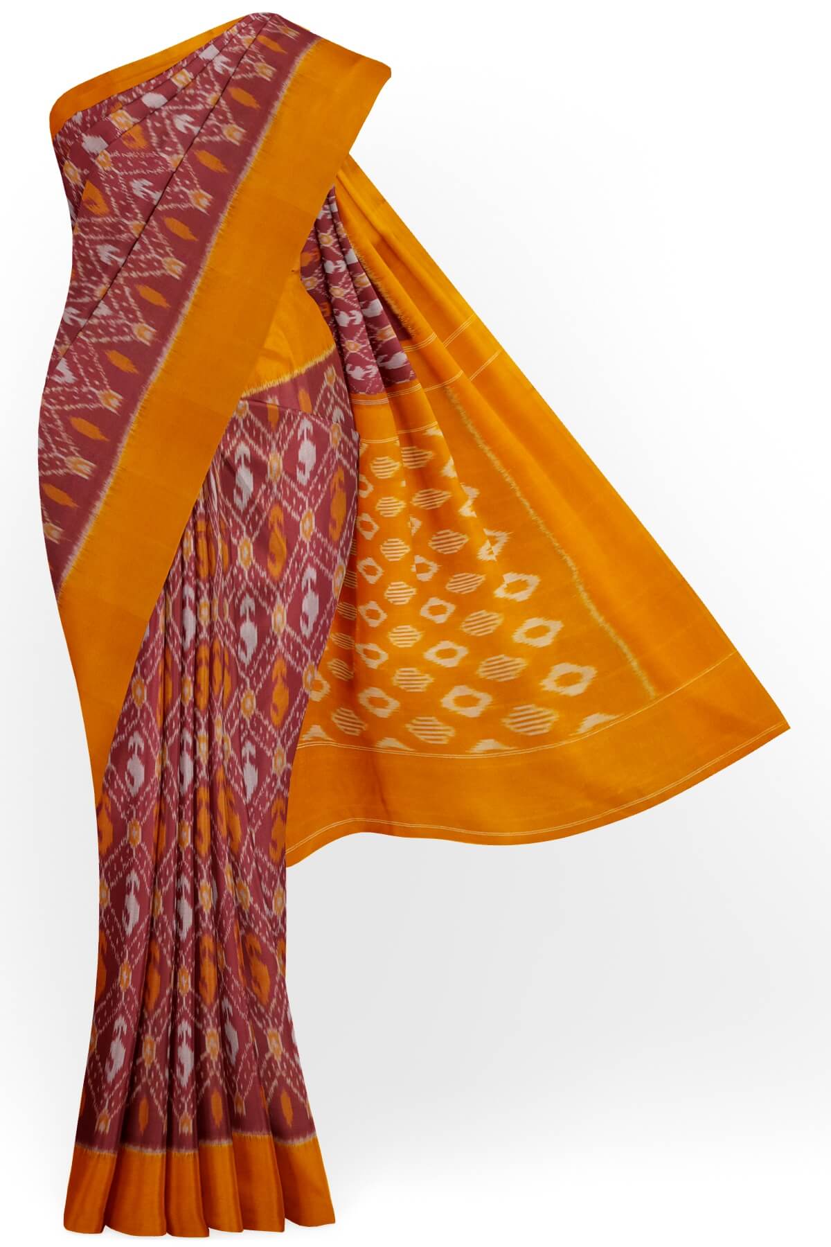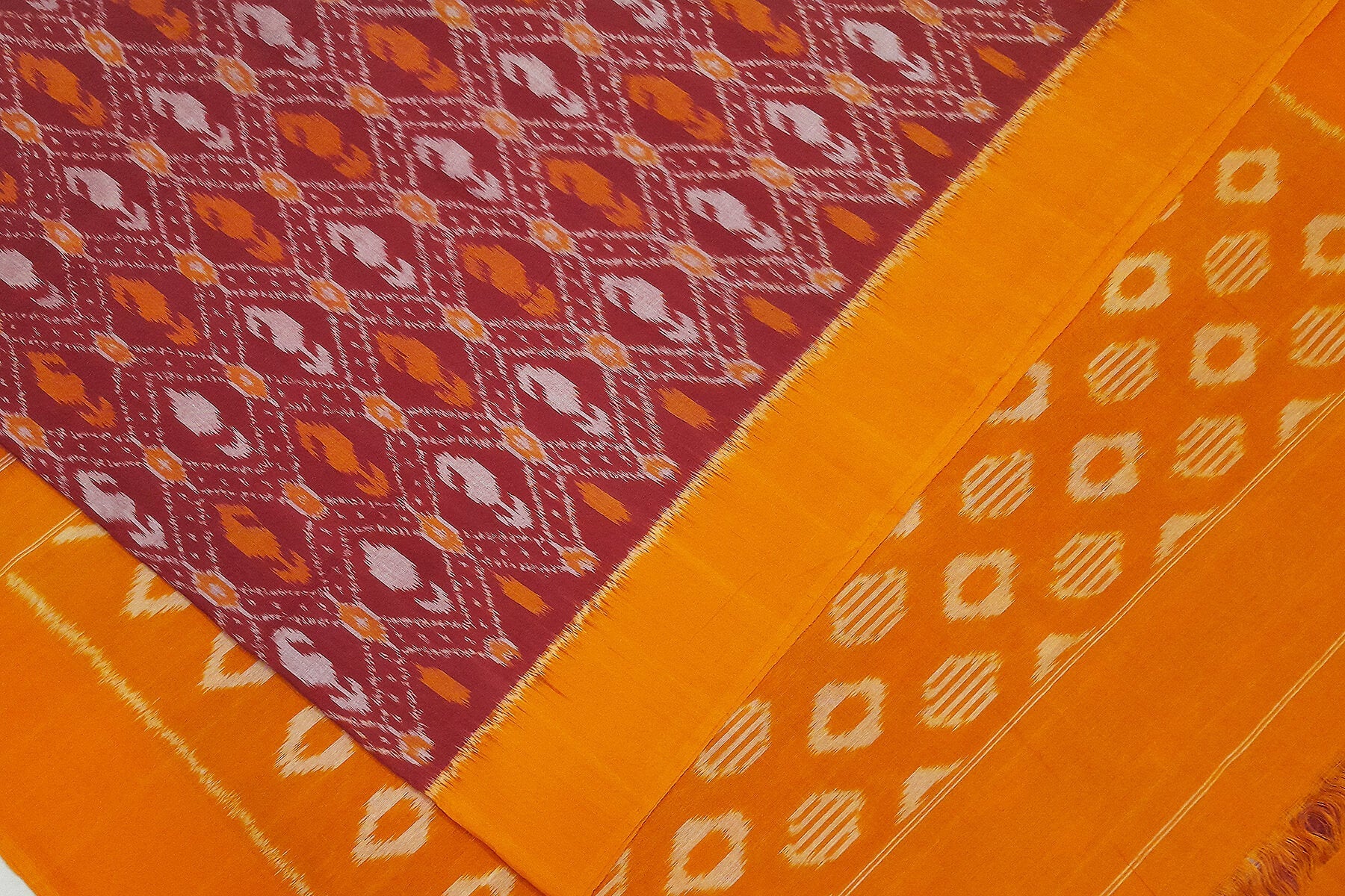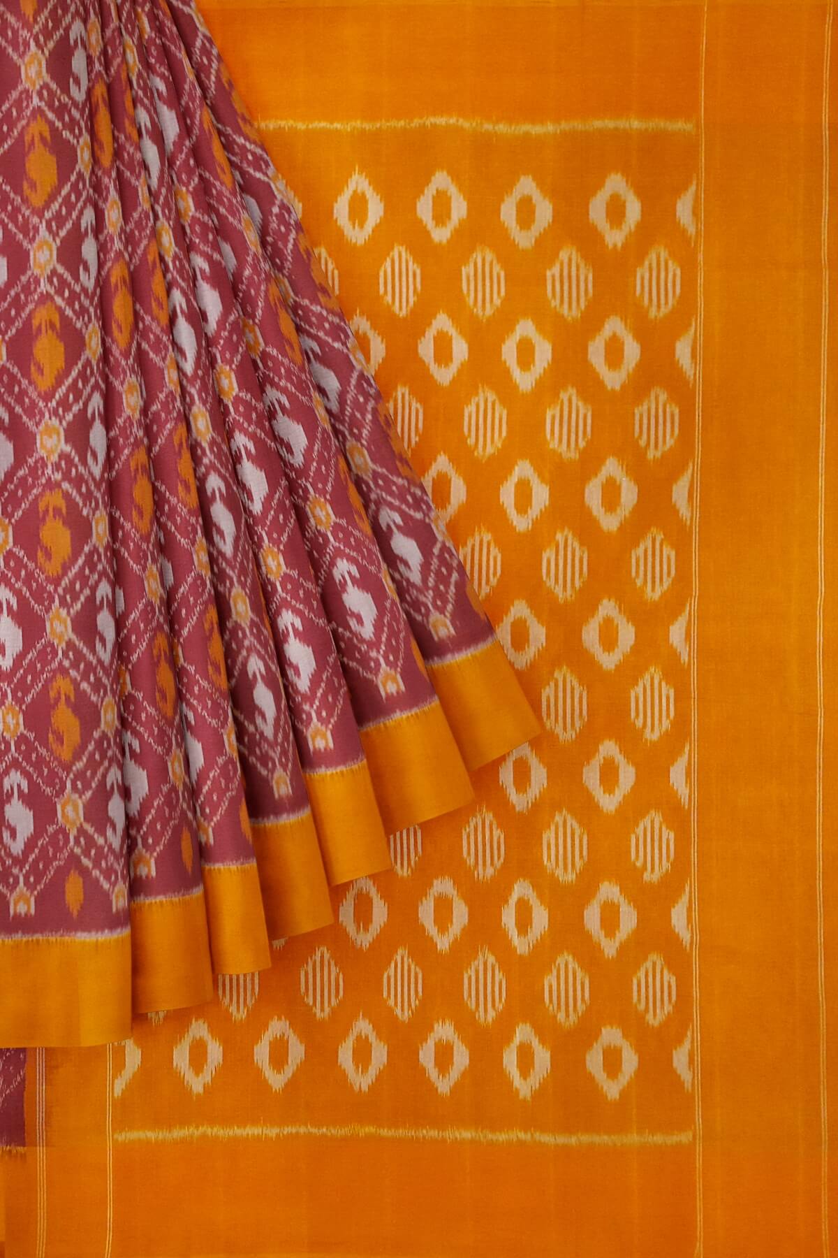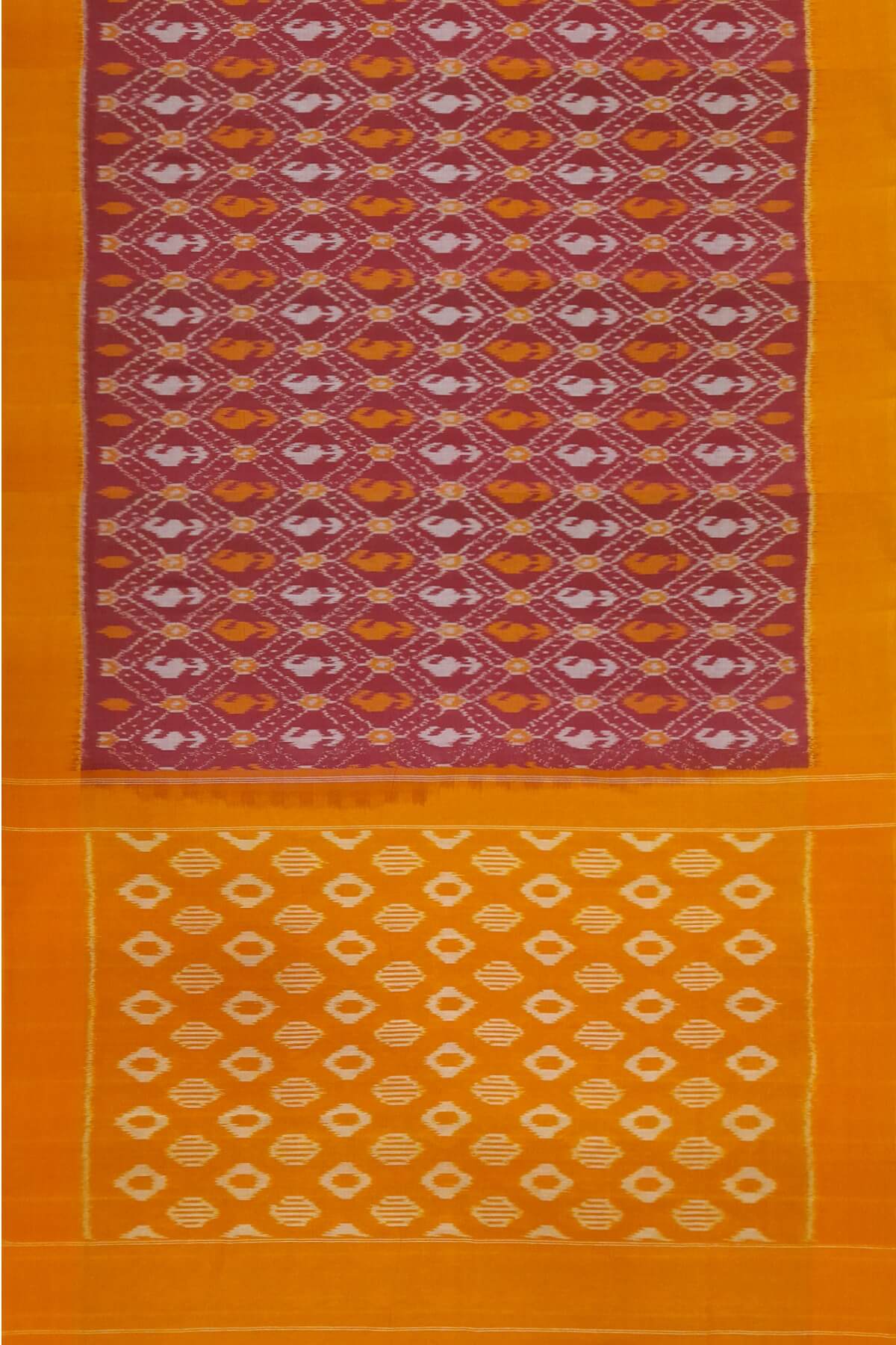 Description : Handwoven ikat pure cotton saree in maroon in diamond pattern and without blouse.