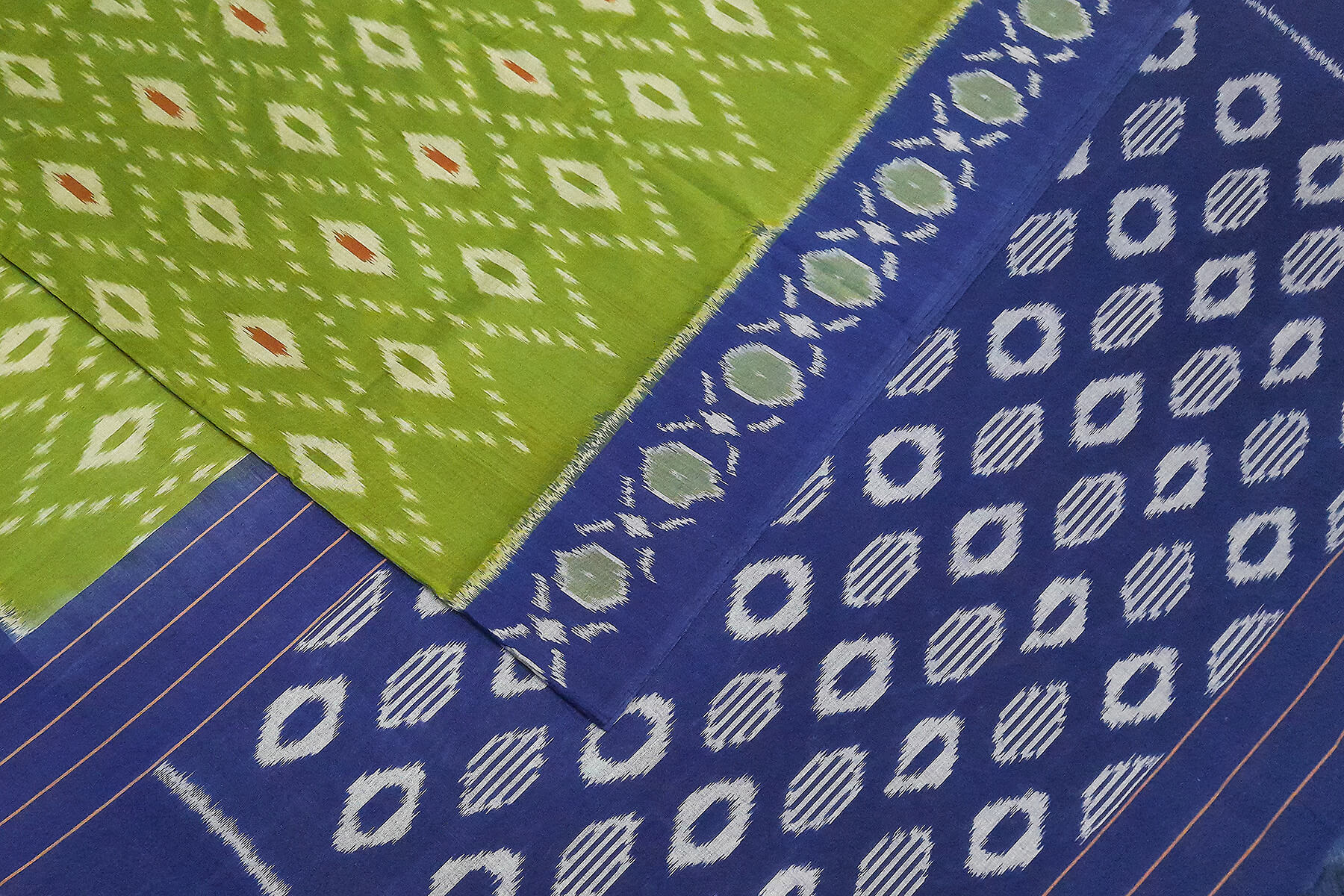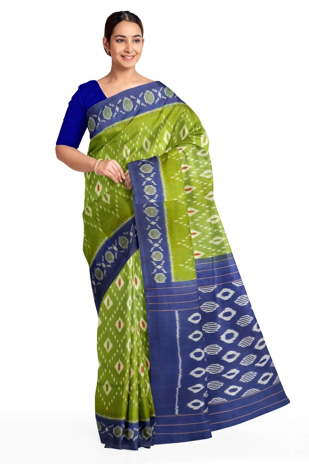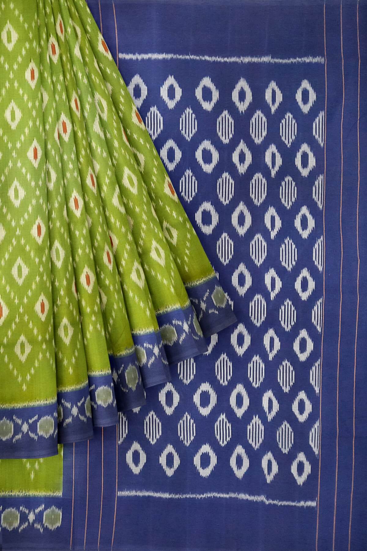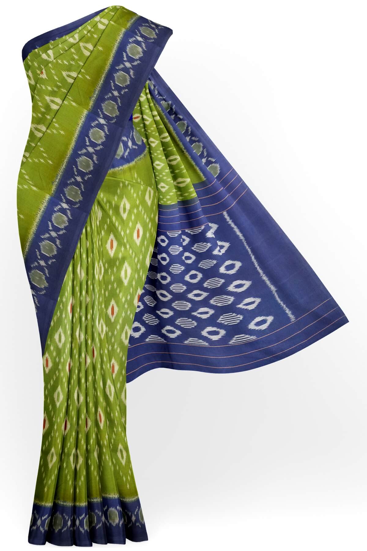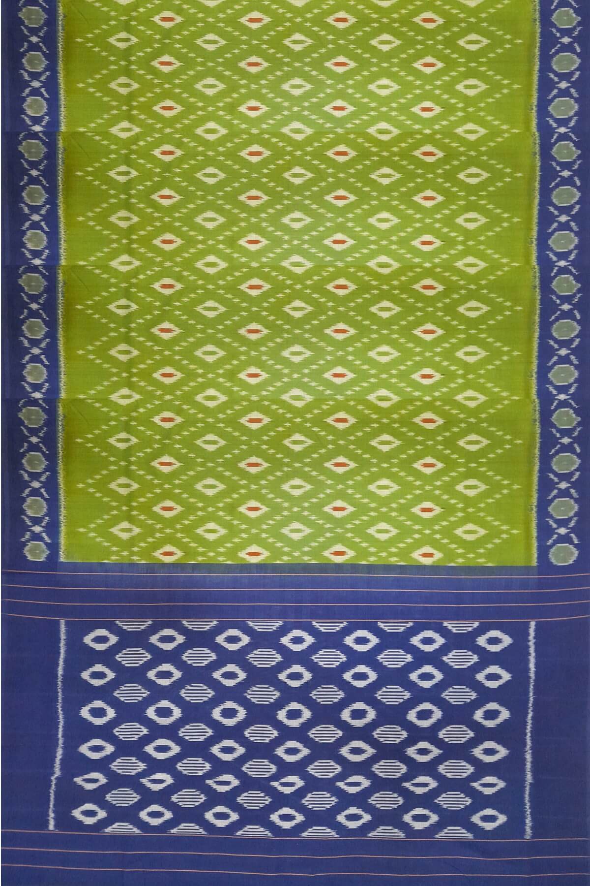 Description : Handwoven ikat pure cotton saree in olive green & blue