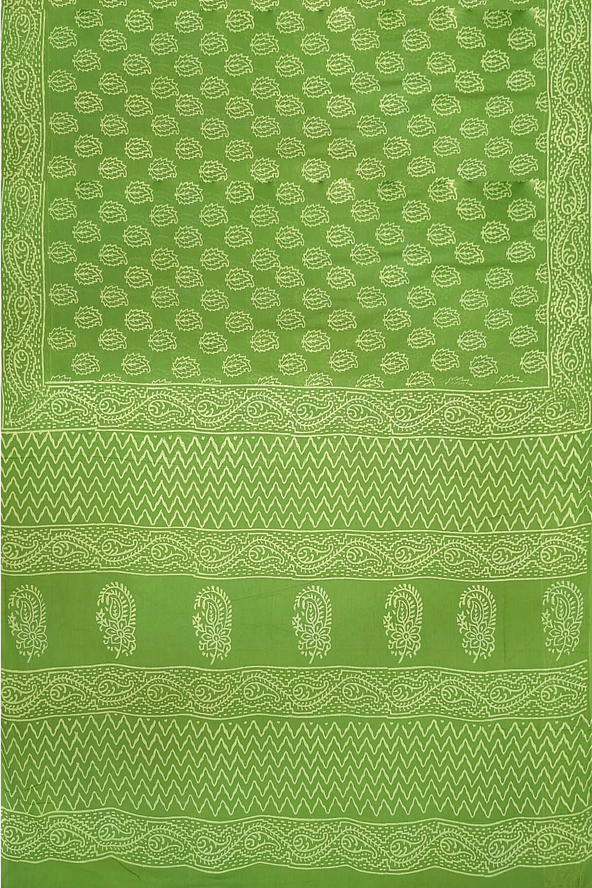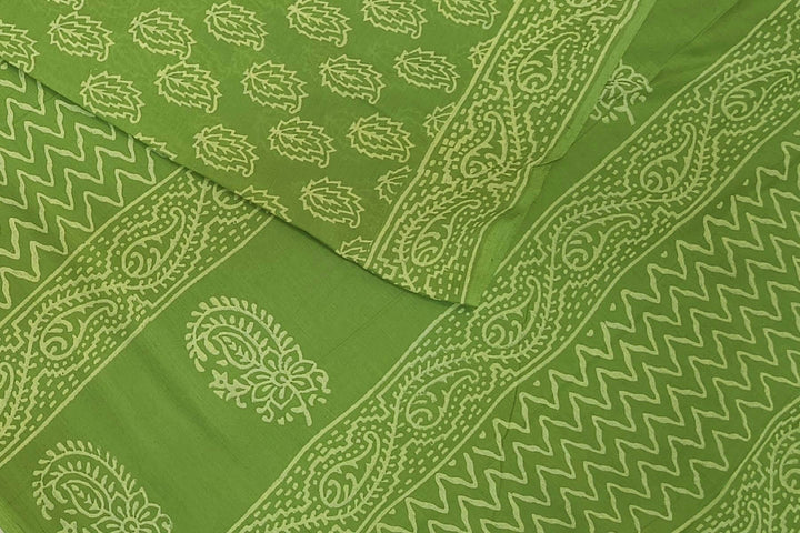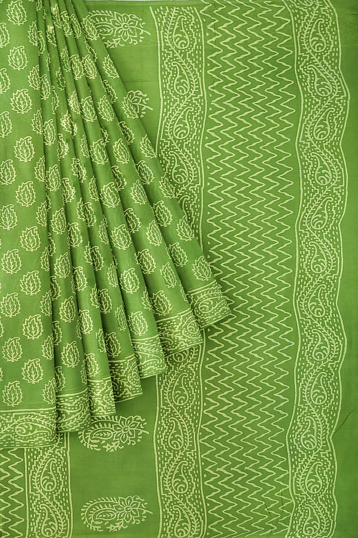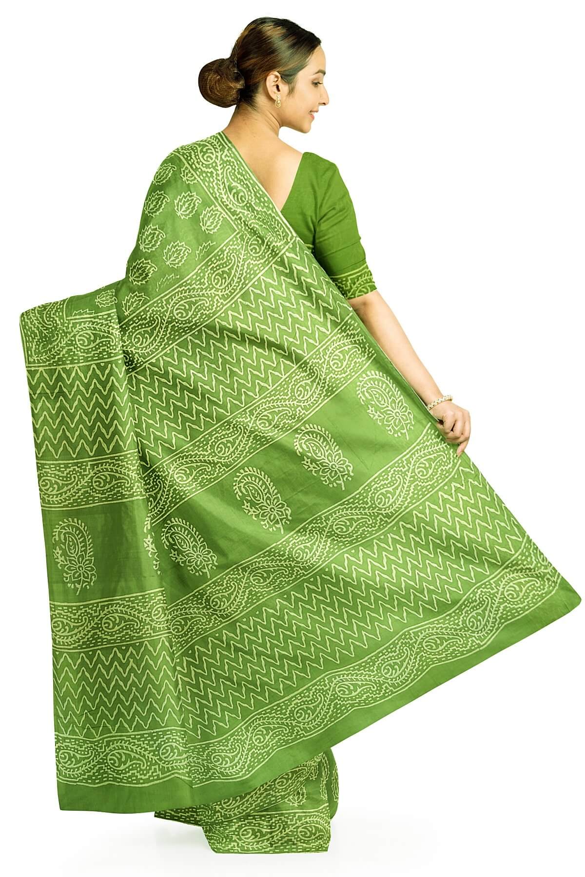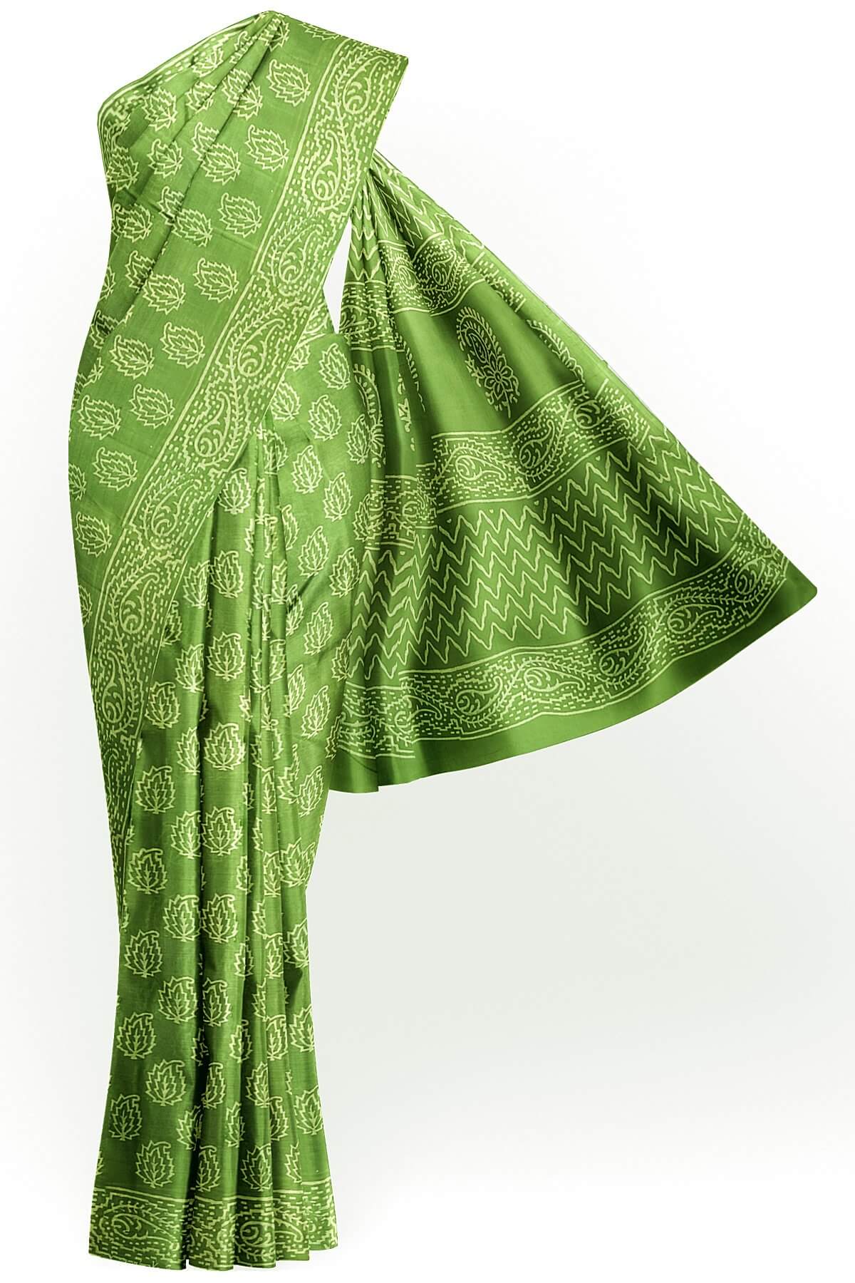 Description : Jaipur mul cotton saree in green with paisley motifs.