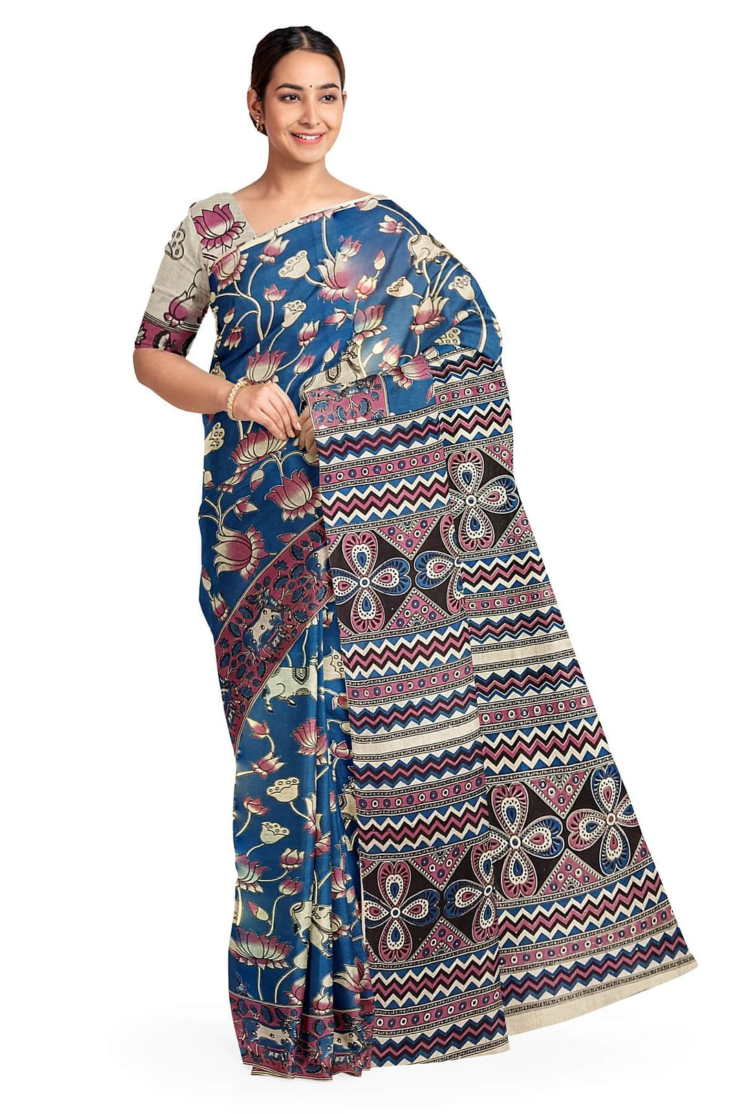 Printed Kalamkari pure cotton saree in blue
