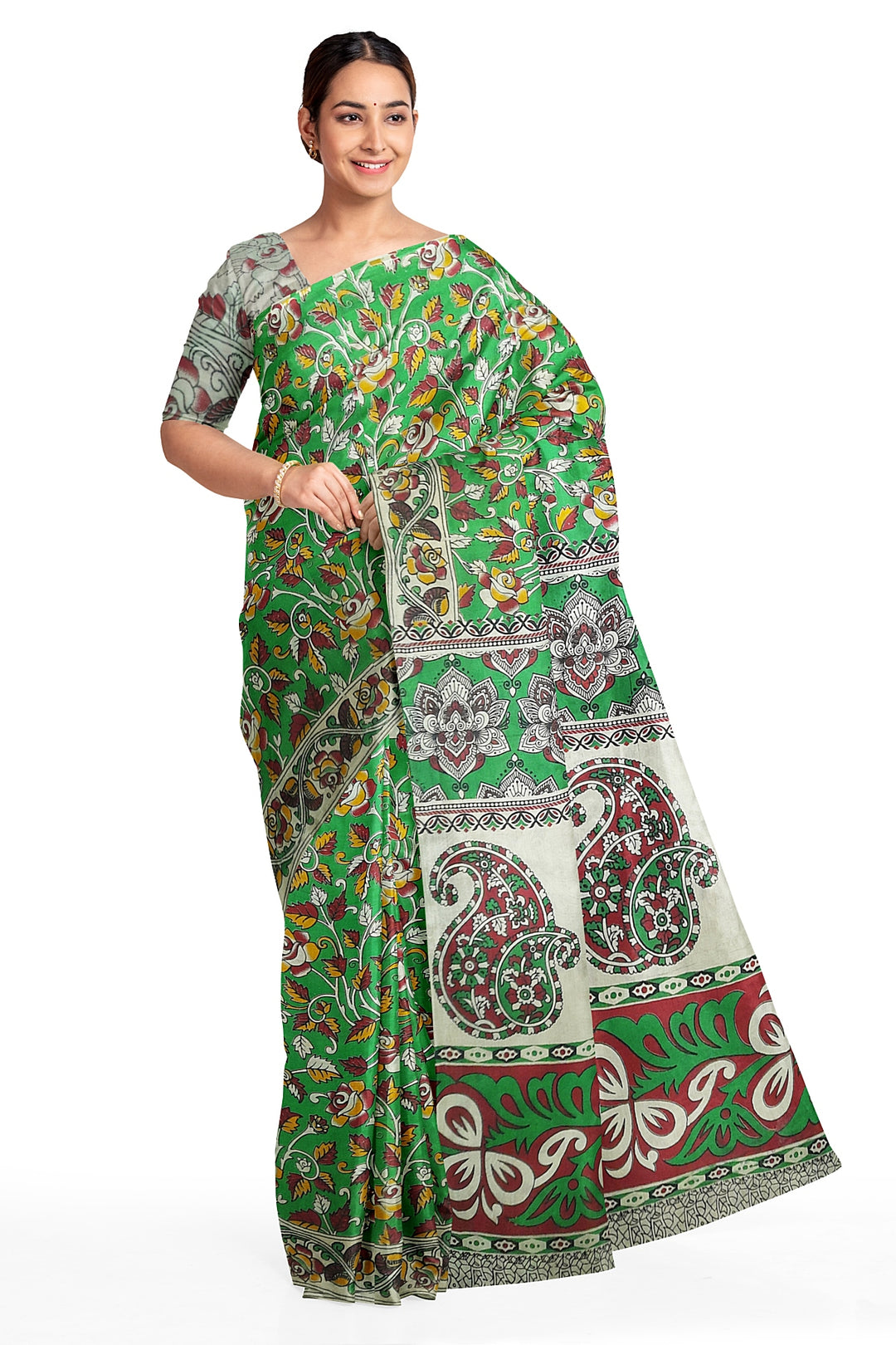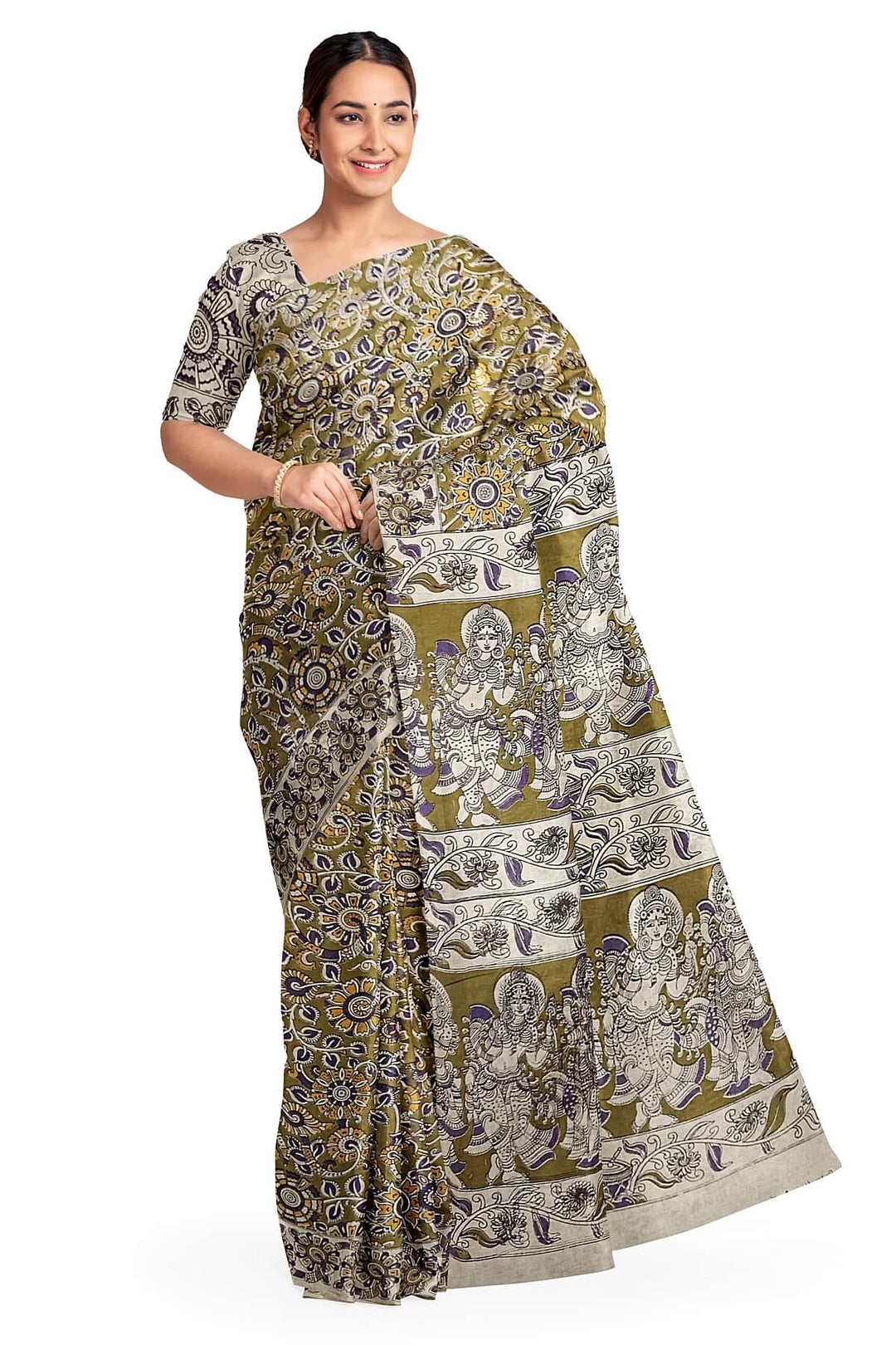 Printed Kalamkari pure cotton saree in mehndi green