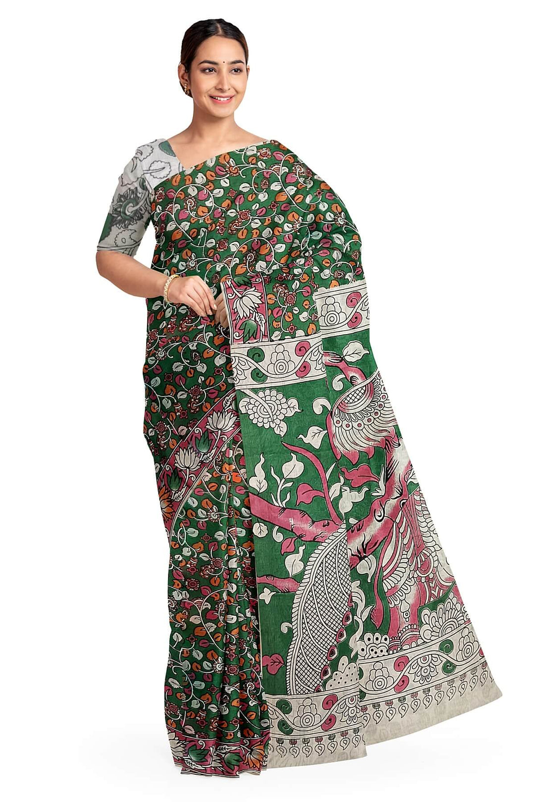 Printed Kalamkari pure cotton saree in dark green