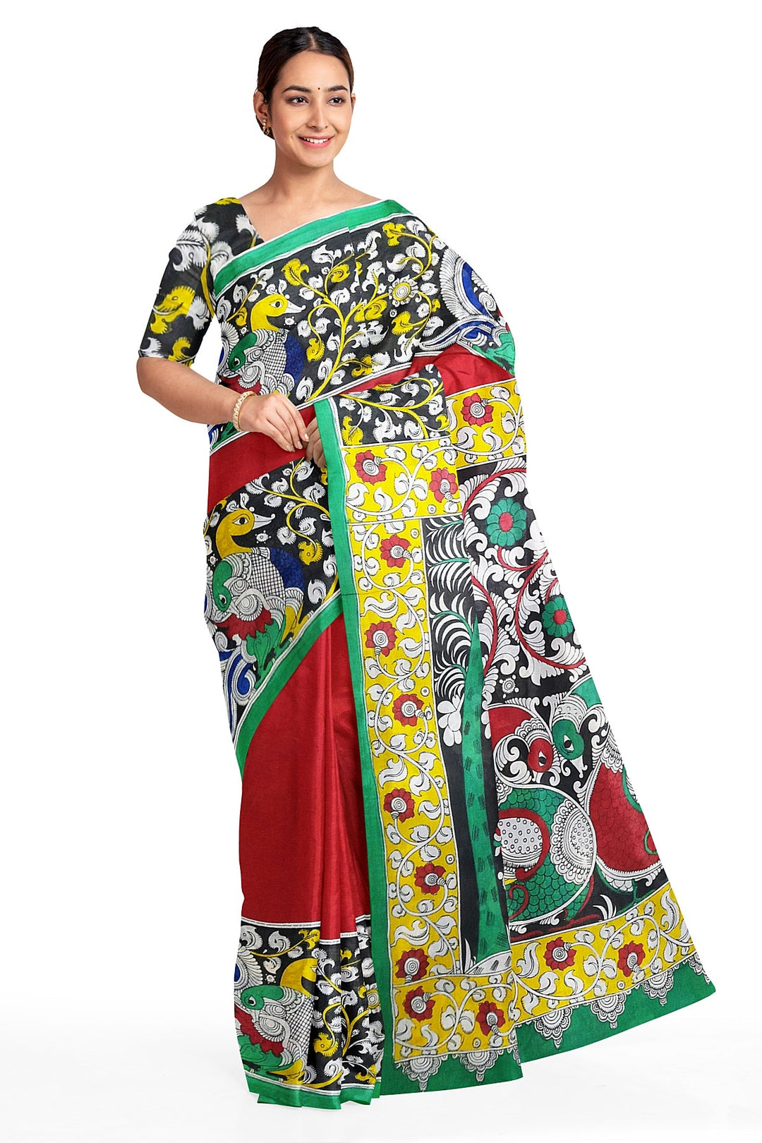 Printed Kalamkari pure cotton saree in red