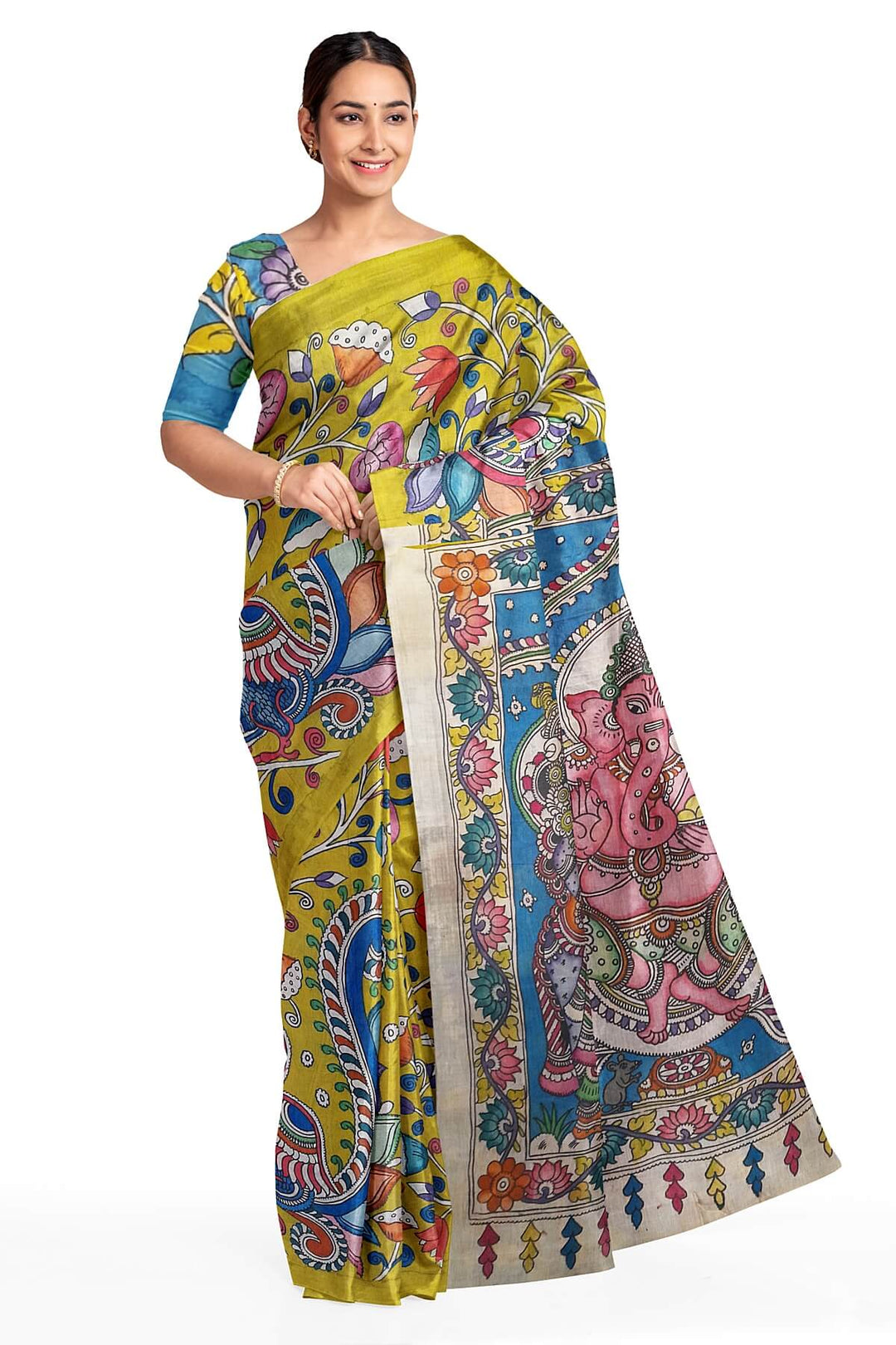 Printed Kalamkari pure cotton saree in mustard