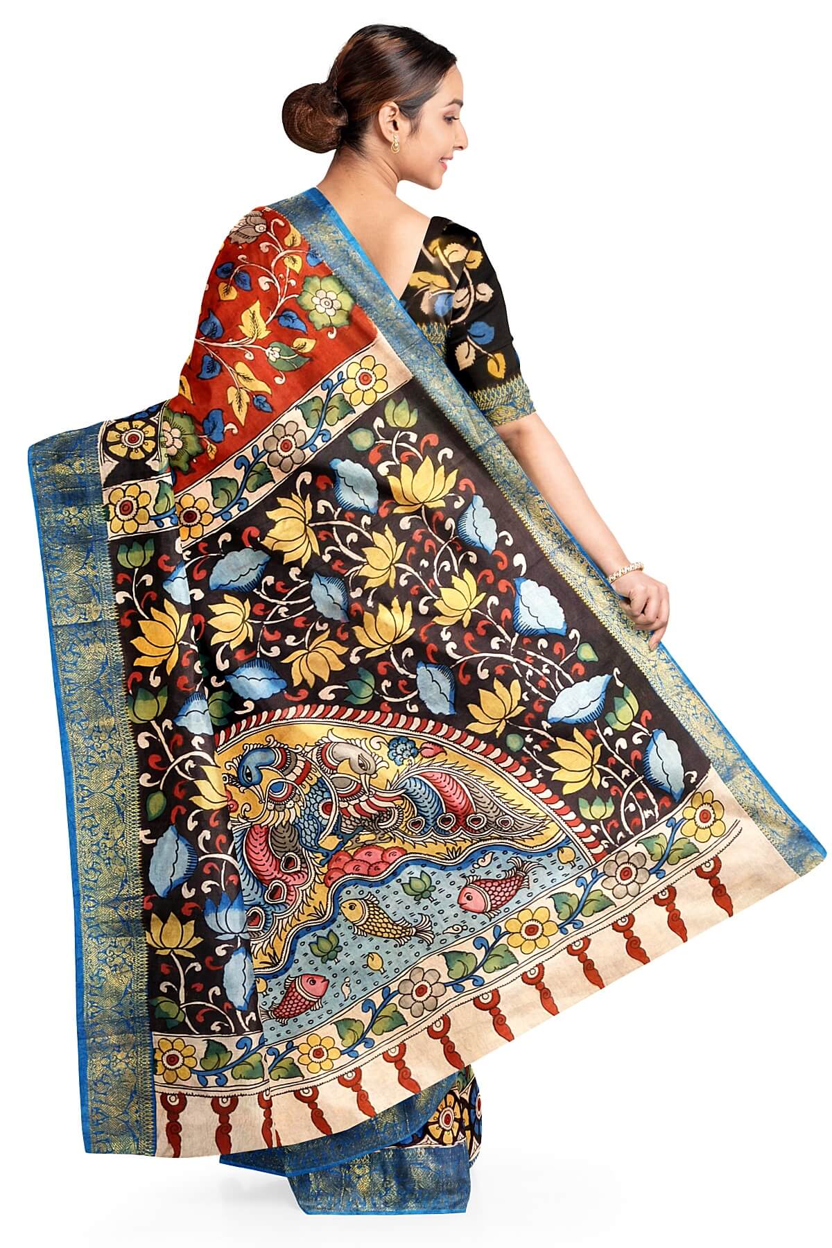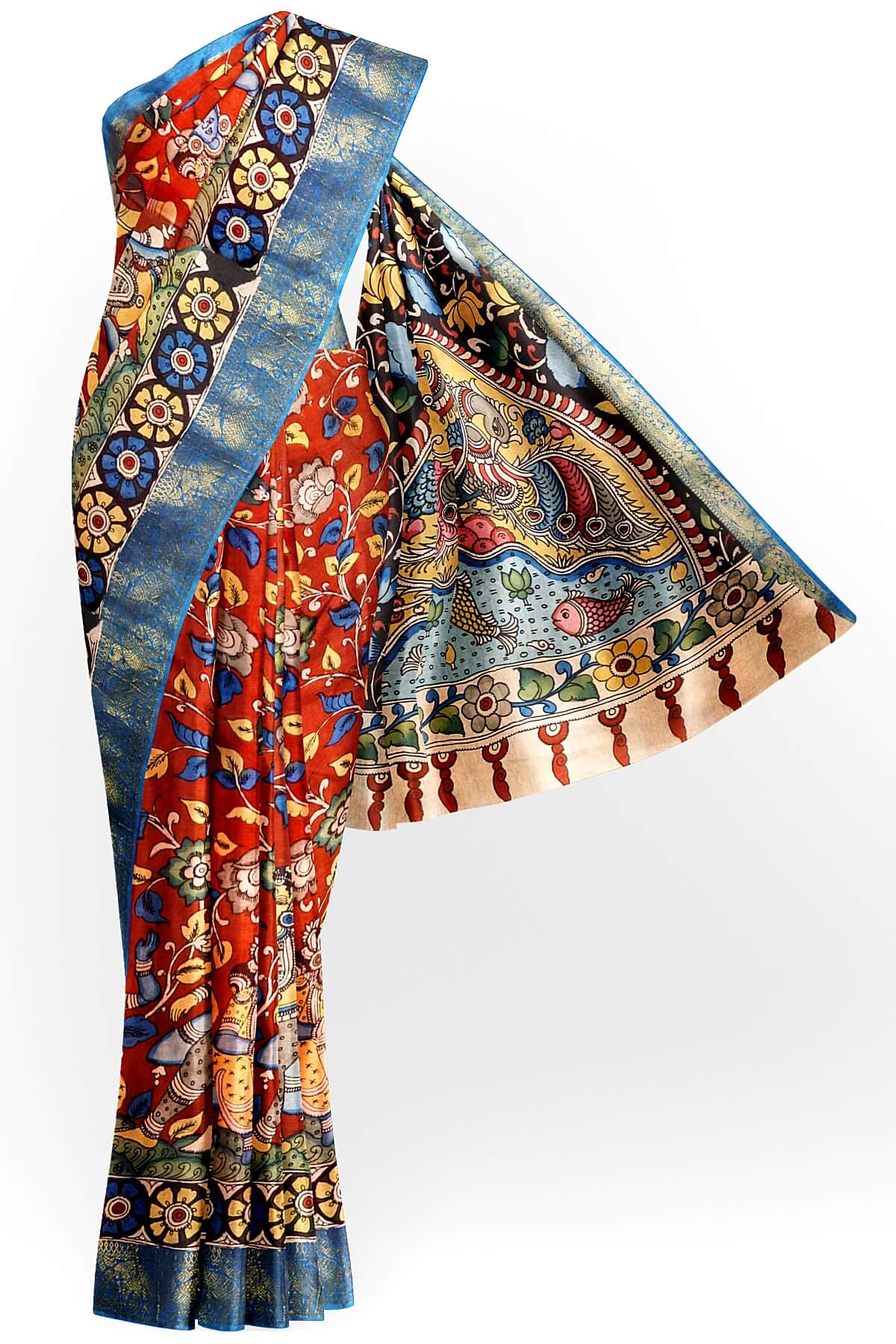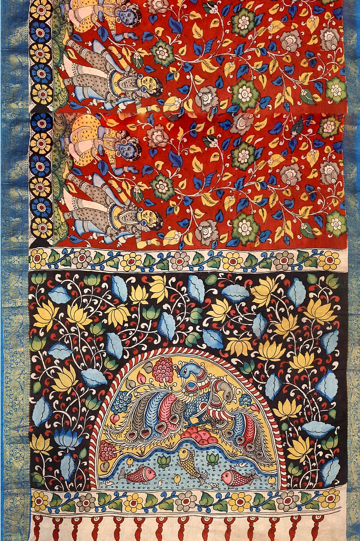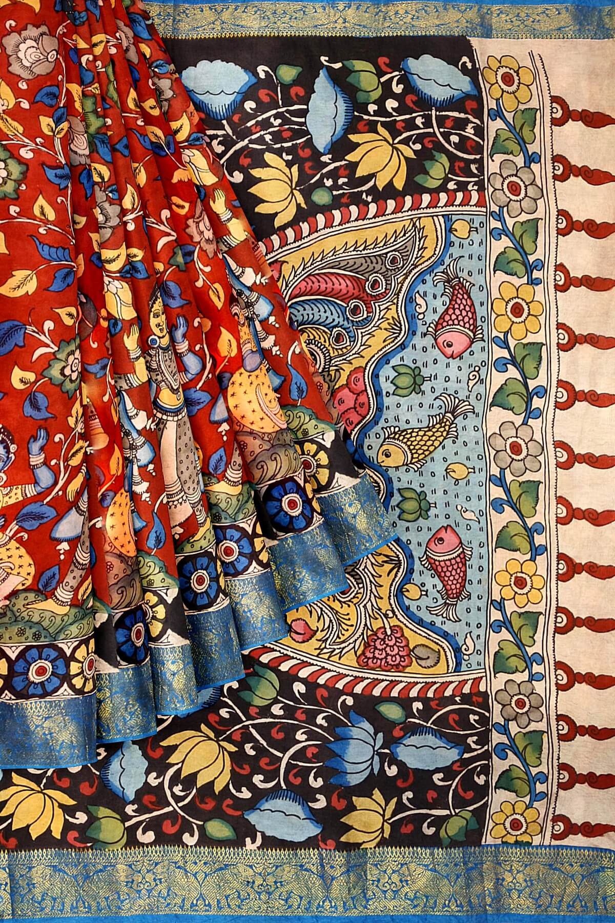 Description: Hand painted Kalamkari on Bangalore silk saree in maroon with floral vines.