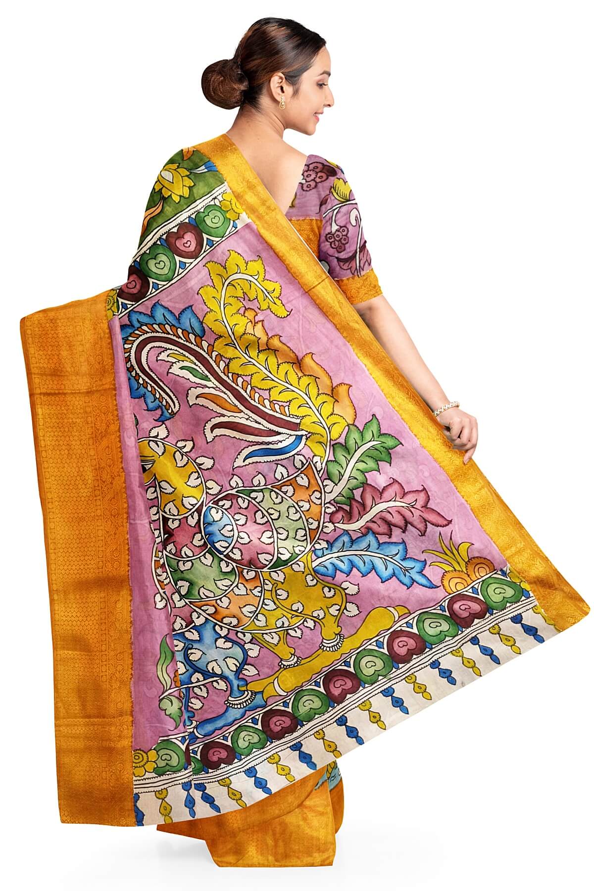Description: Hand painted Kalamkari on Bangalore silk saree in mehndi green with lotus vines