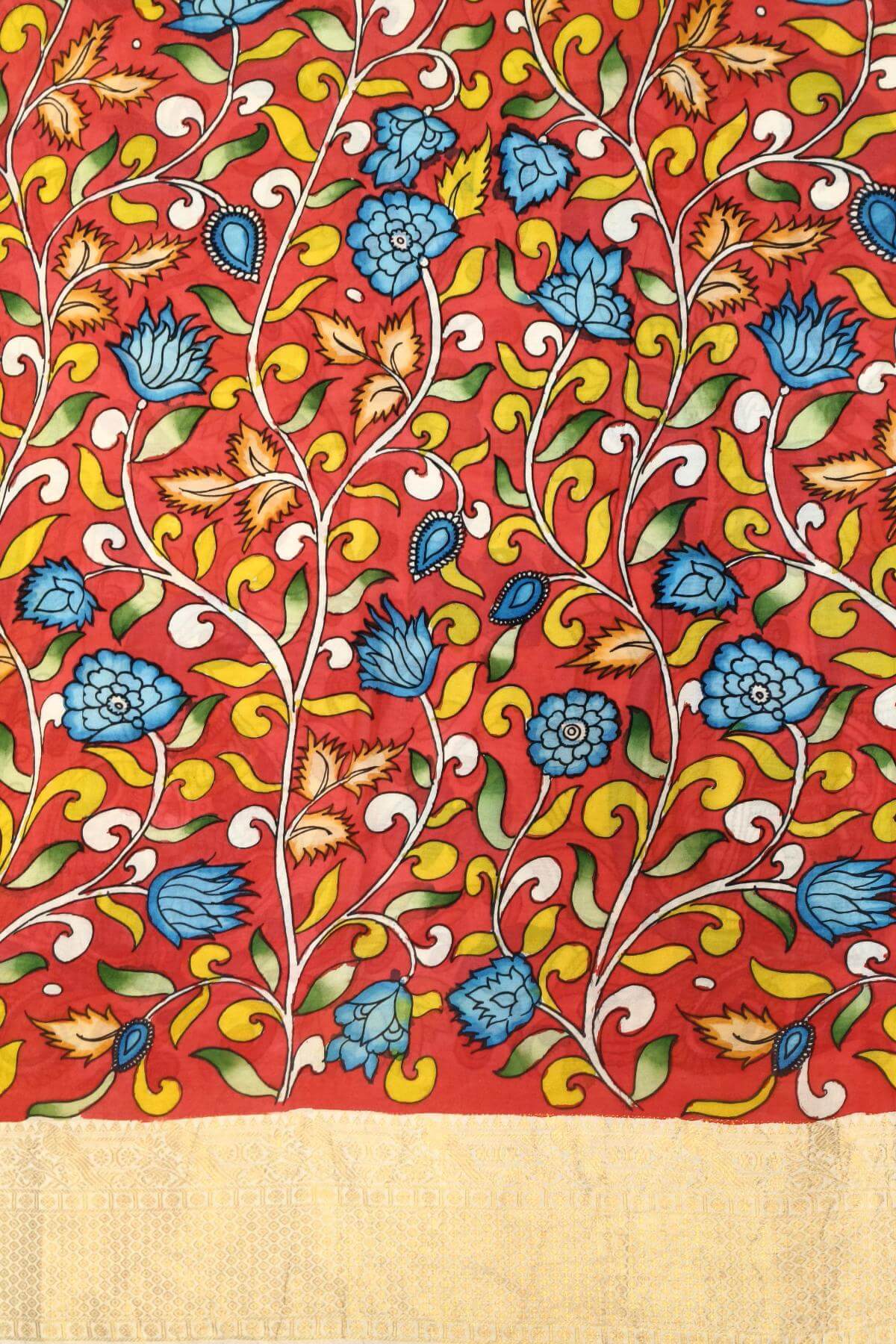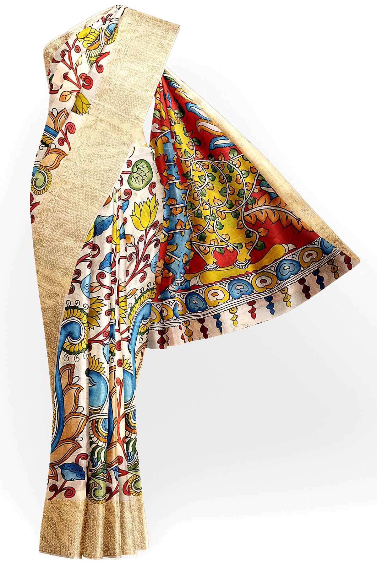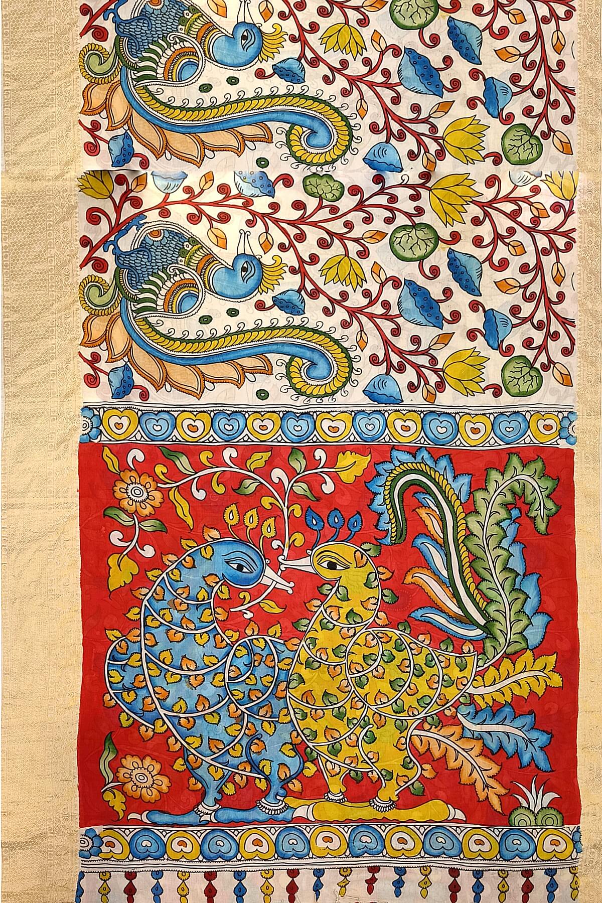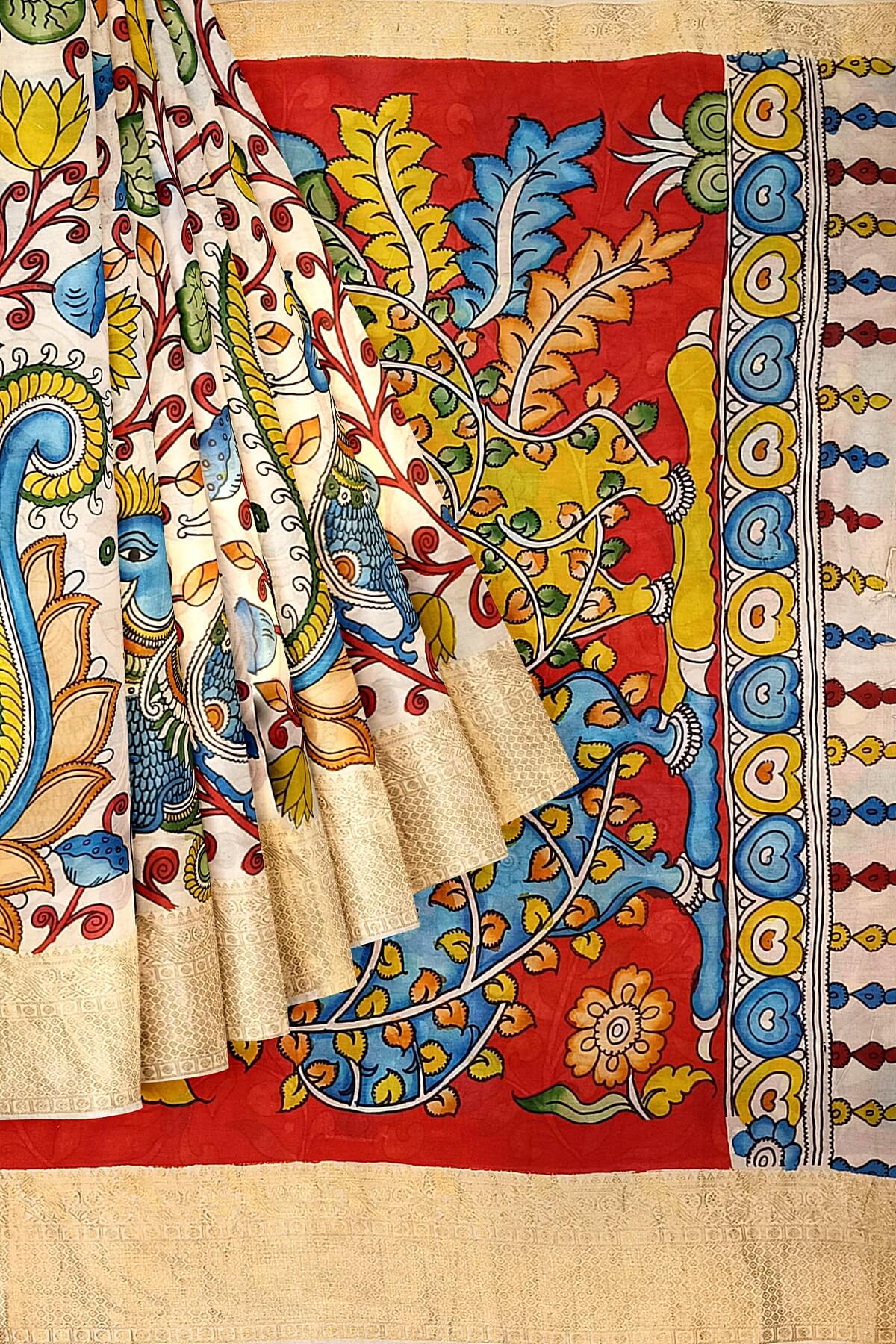 Description: Hand painted Kalamkari on Bangalore silk saree in off white with lotus & peacocks