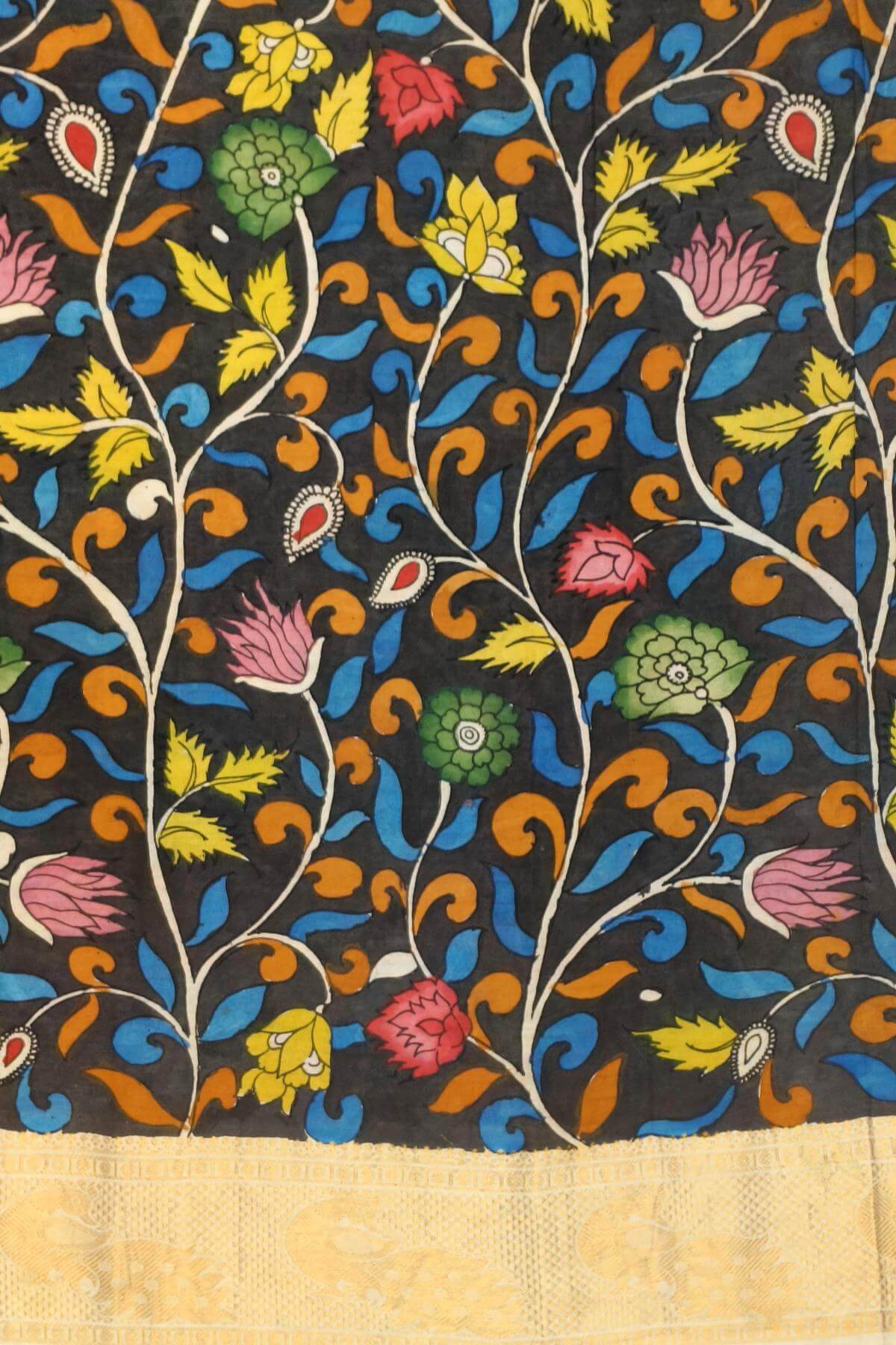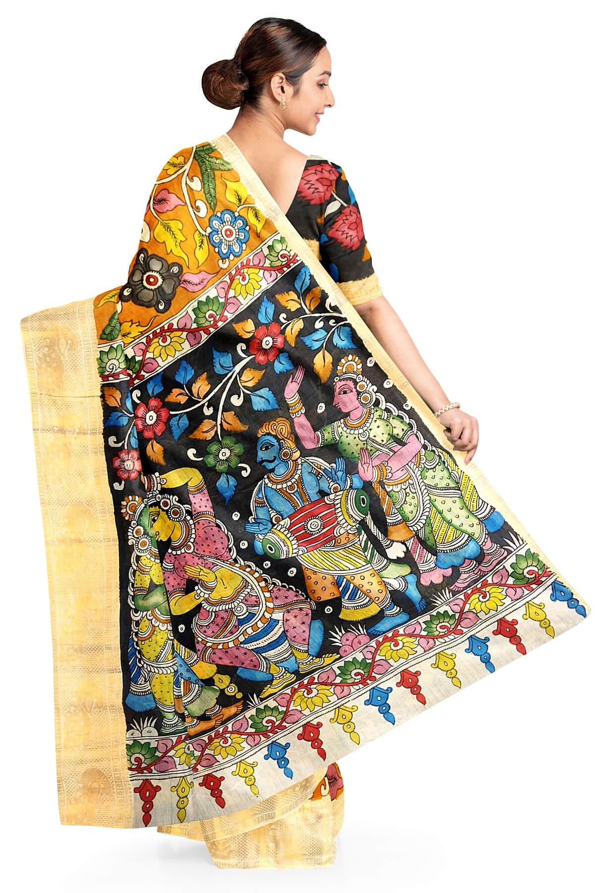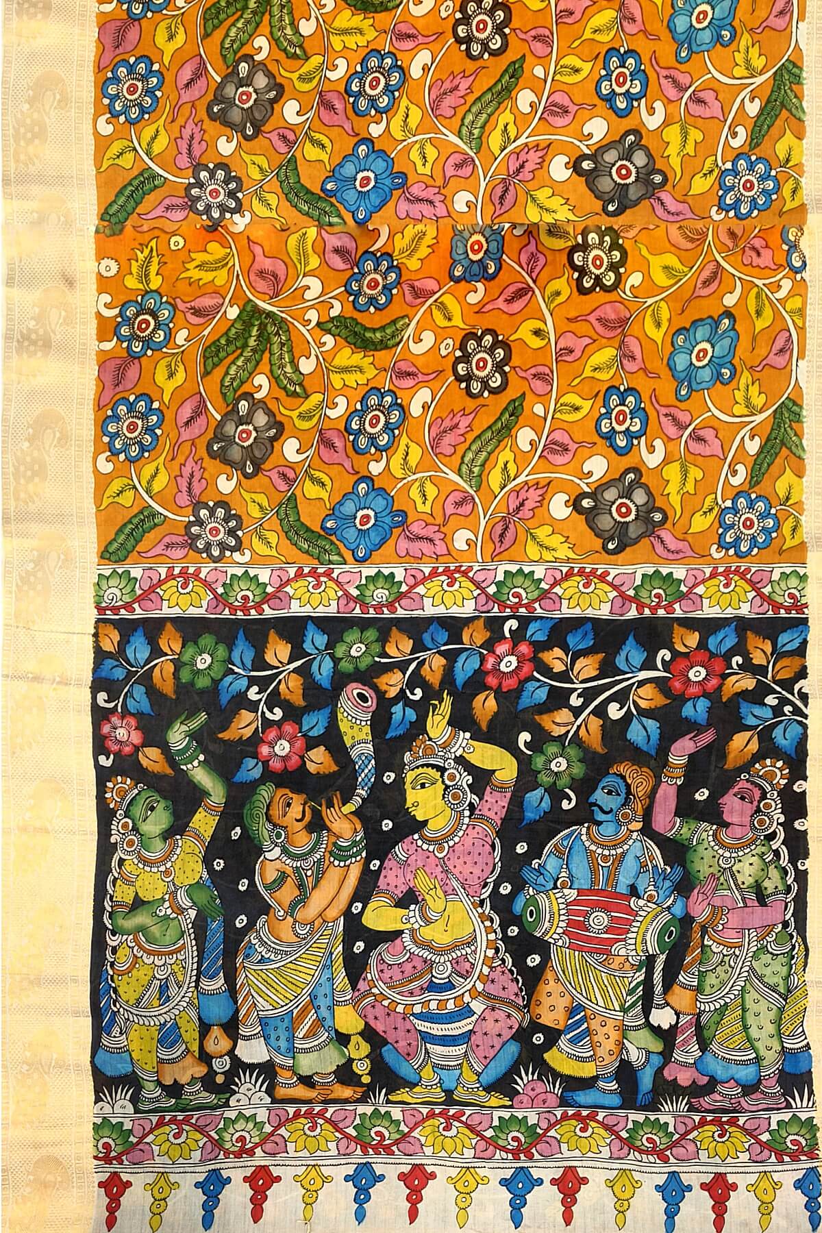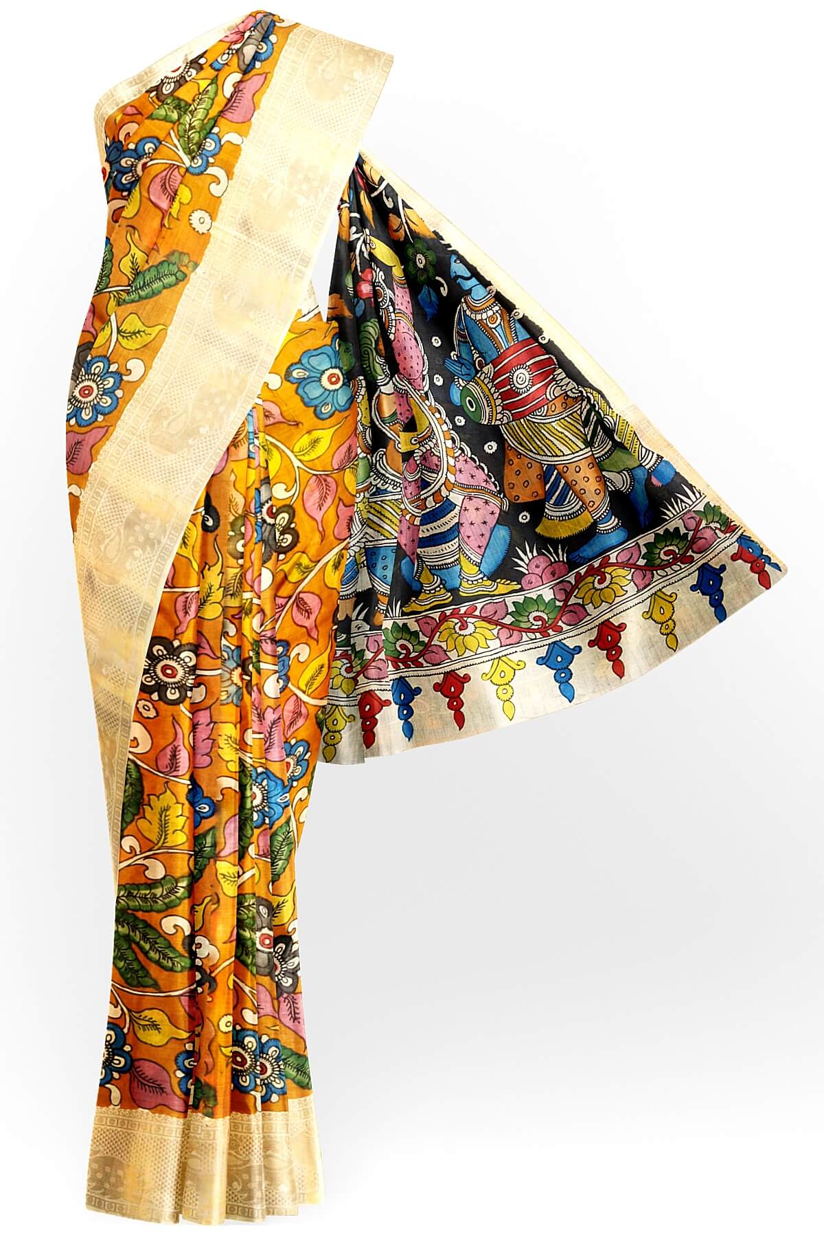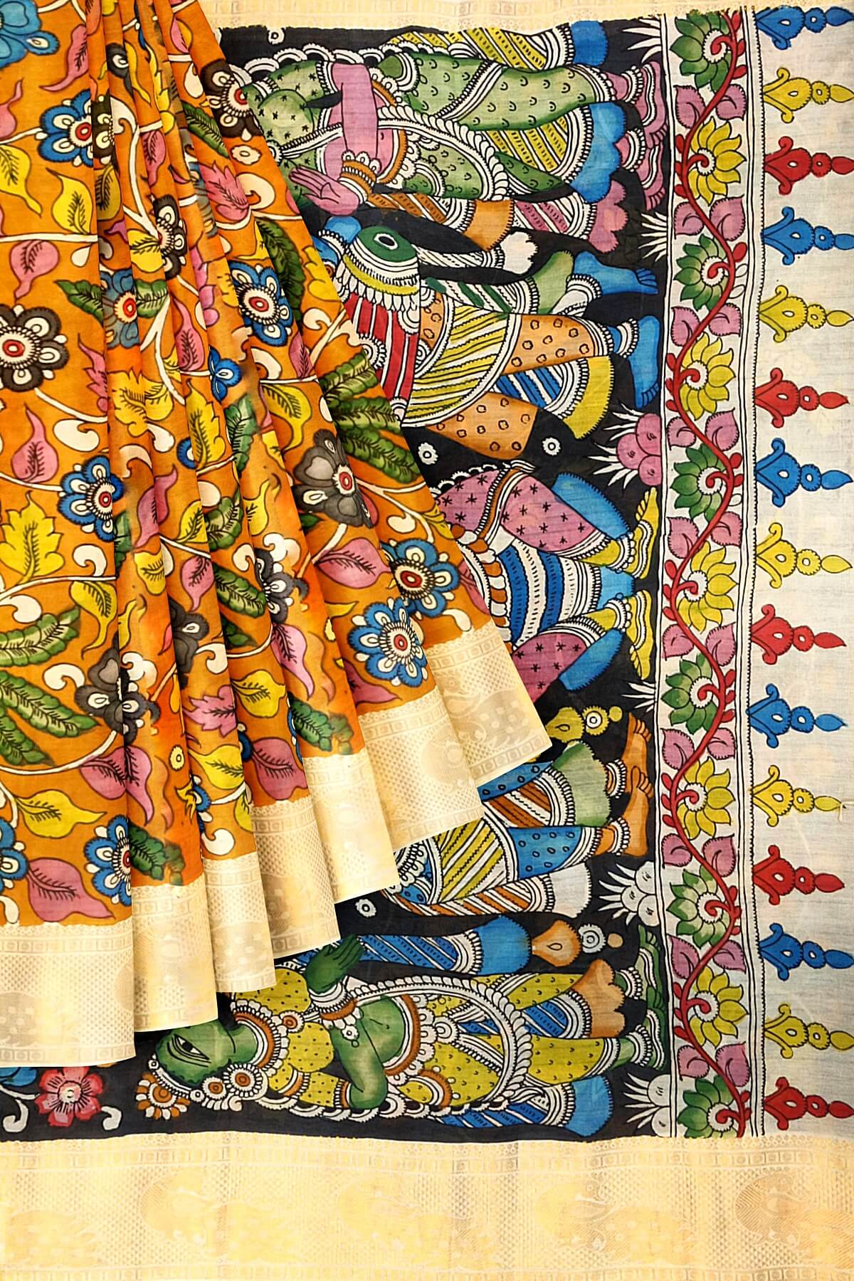 Description: Hand painted Kalamkari on Bangalore silk saree in orange with floral vines