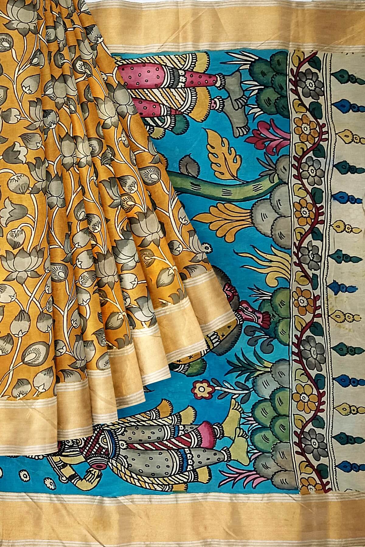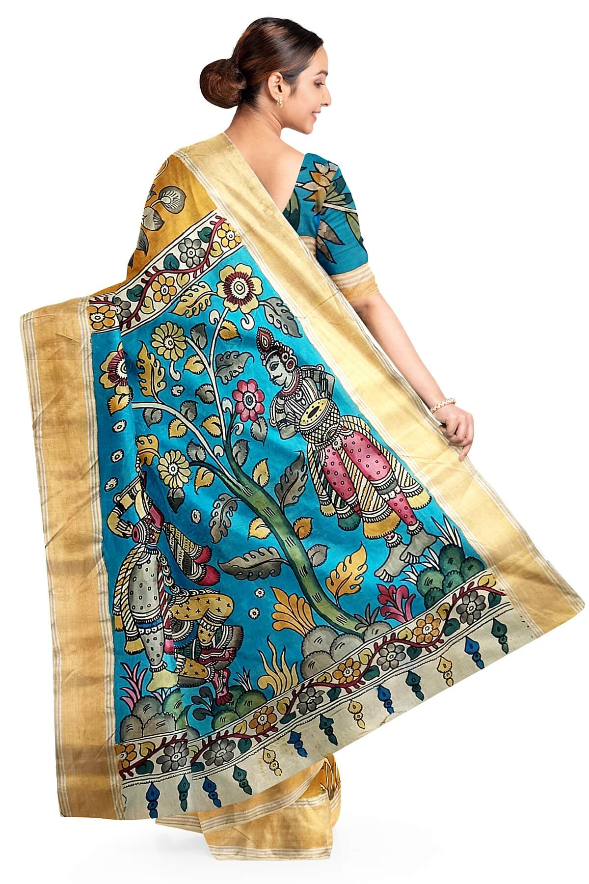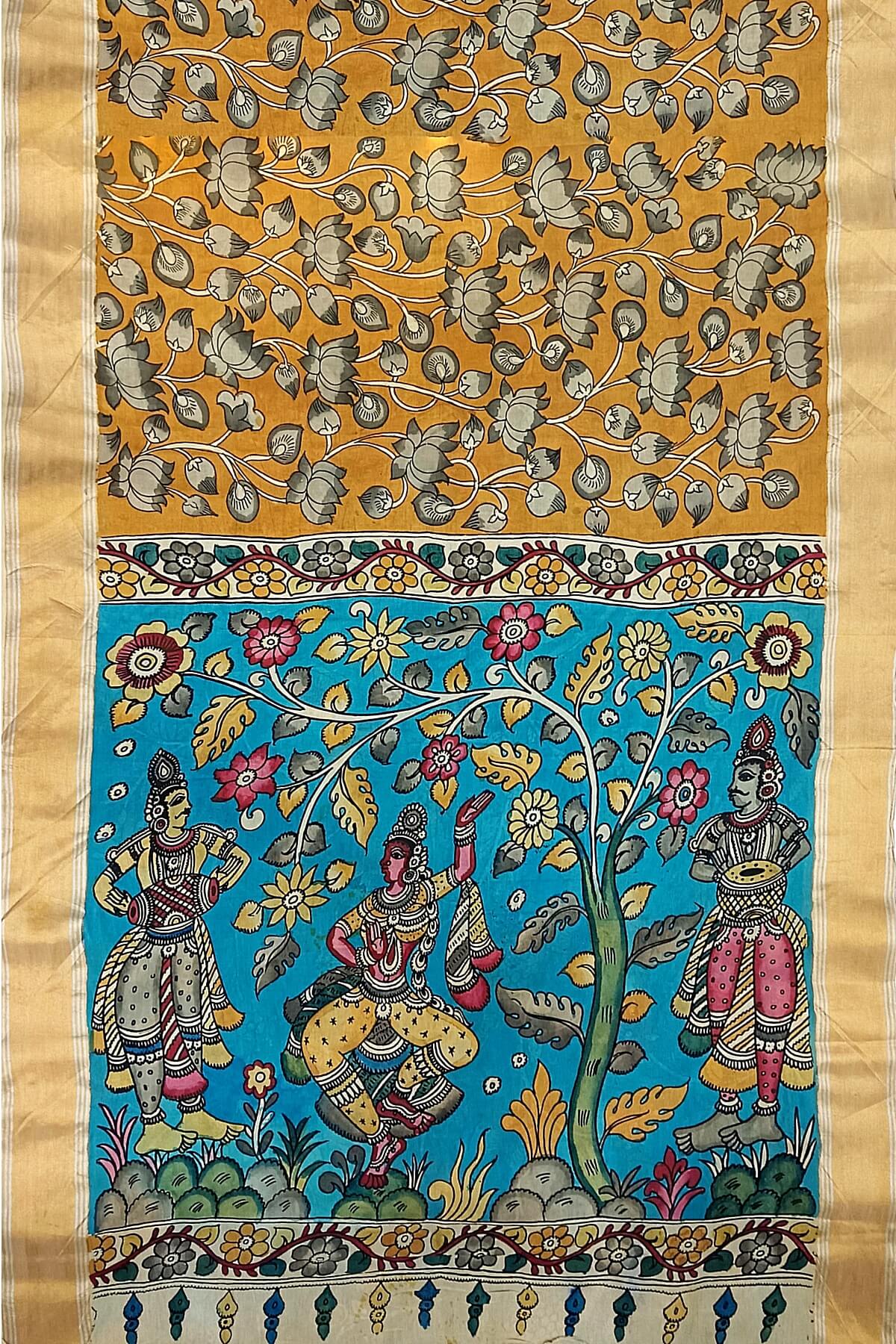 Description: Hand painted Kalamkari on Bangalore silk saree in wheat brown with lotus vines . The pallu has image depicting classical dancers.