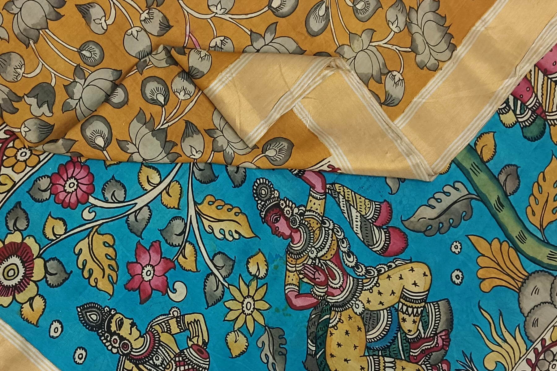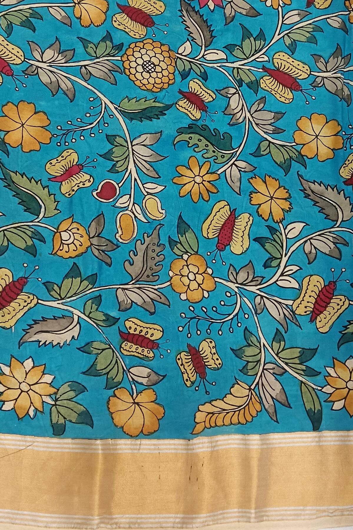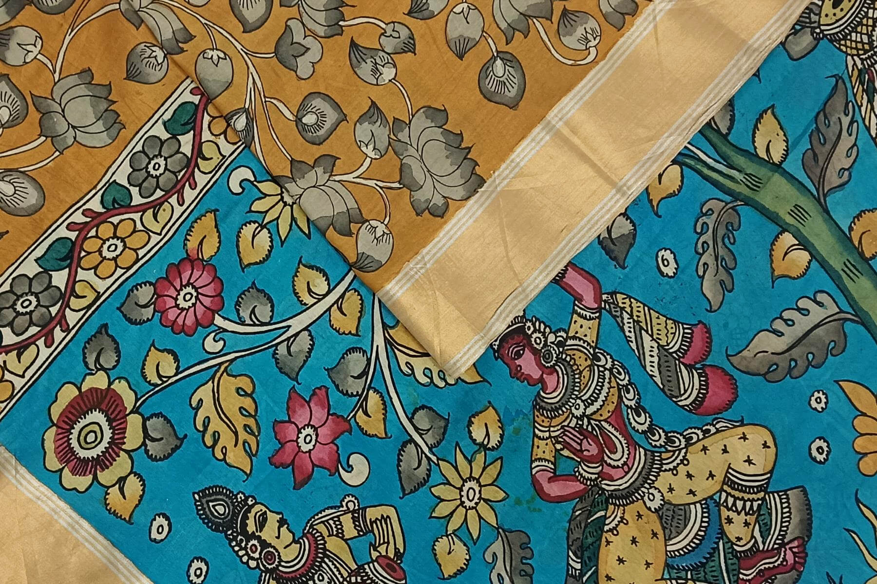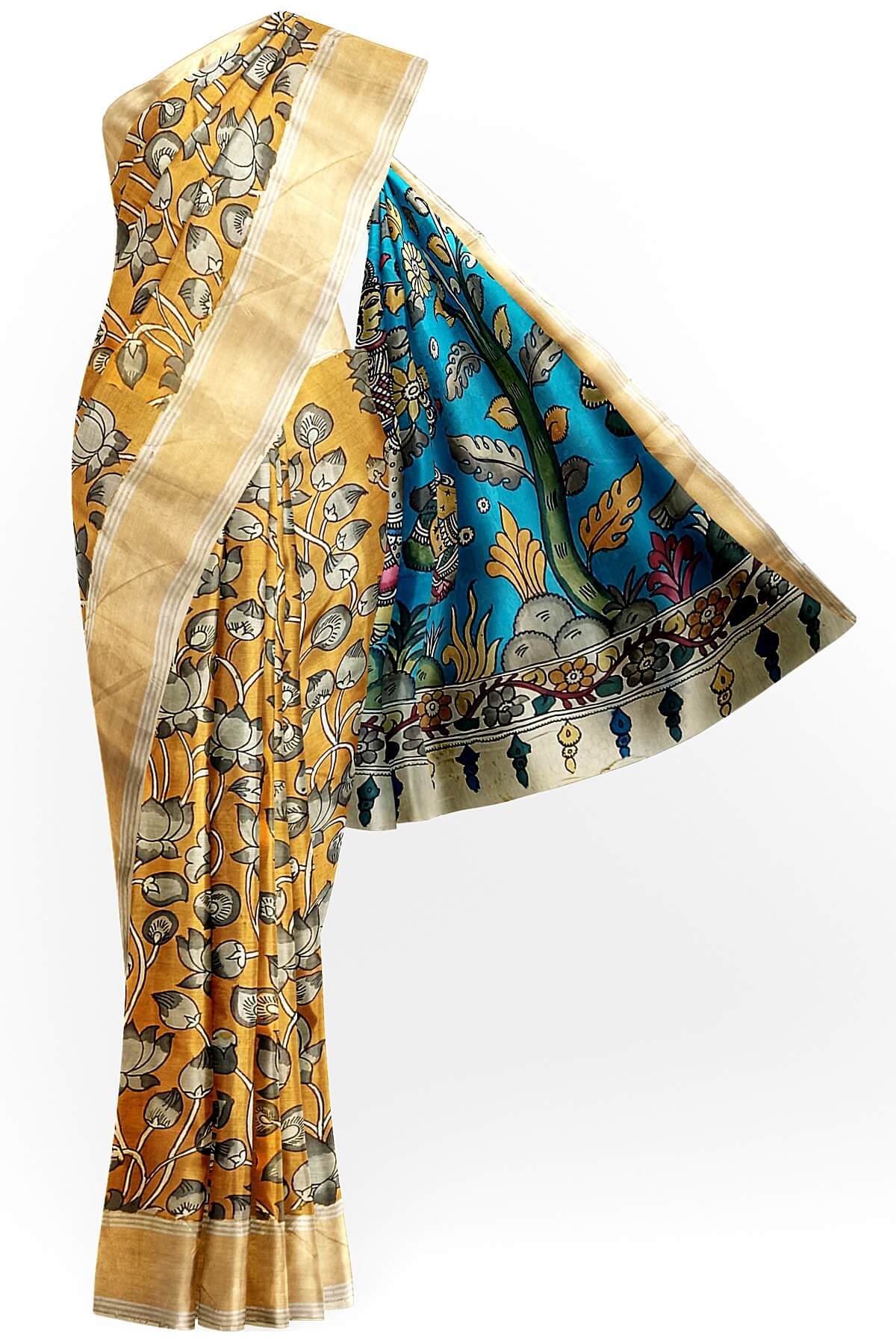 Description: Hand painted Kalamkari on Bangalore silk saree in wheat brown with lotus vines . The pallu has image depicting classical dancers.