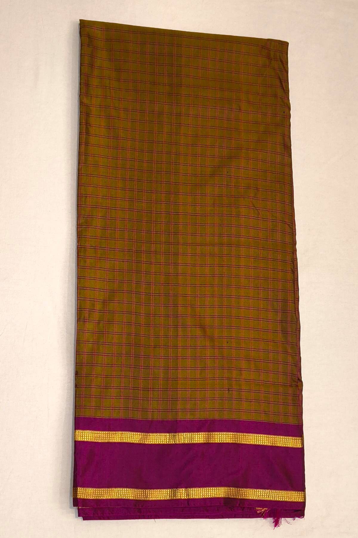 Description: Kanchi pure silk saree in checks in double shaded mustard ( 9 yards )