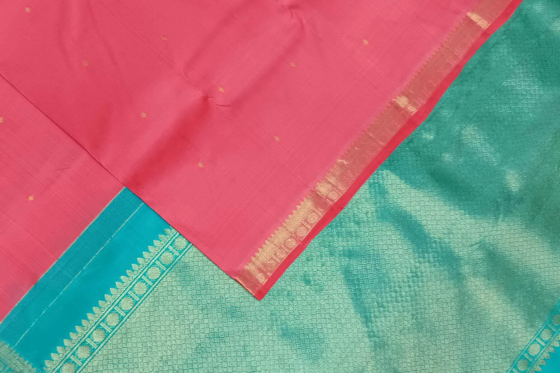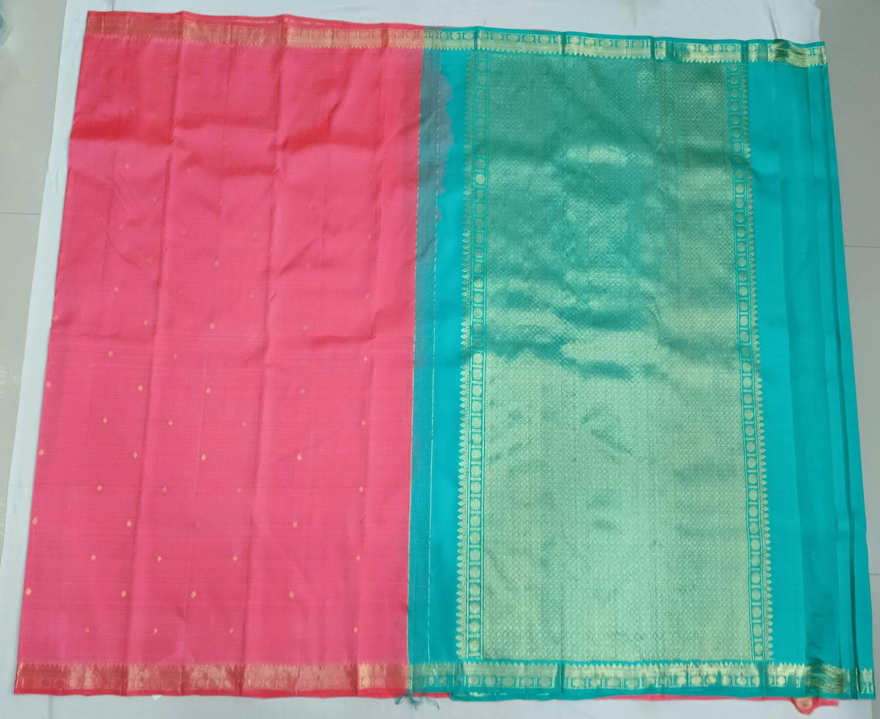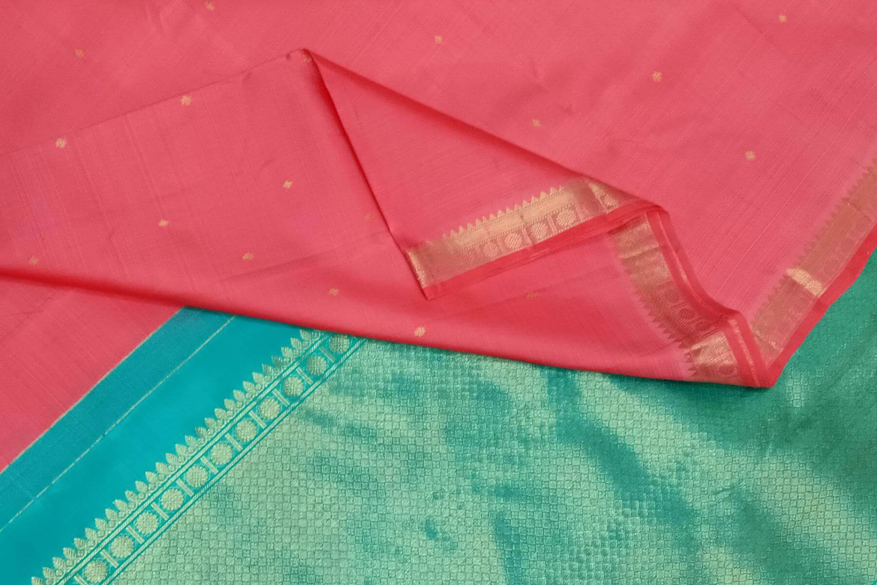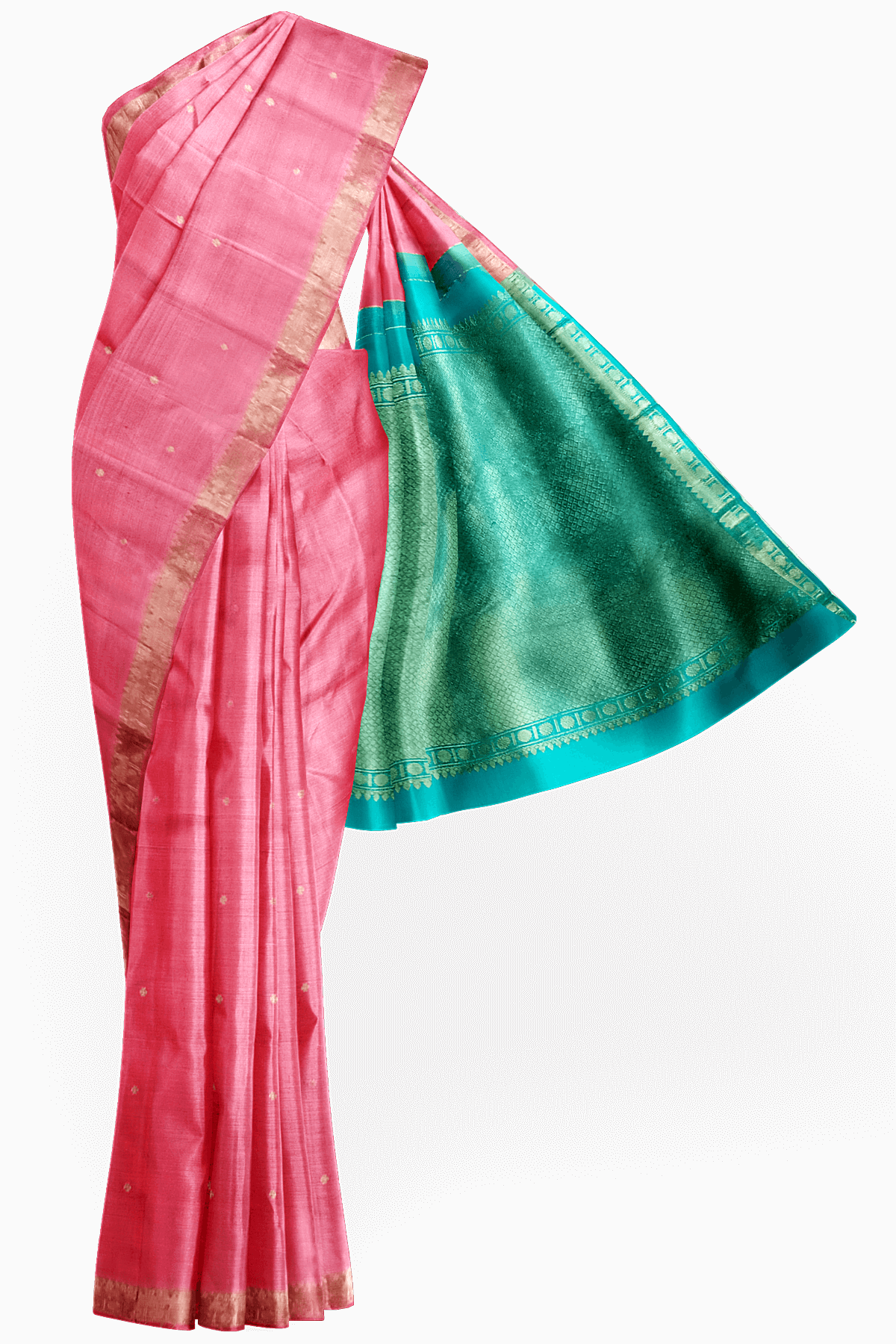 Description: Kanchi pure silk saree in pink with small buttis and a rich contrast pallu in teal green.