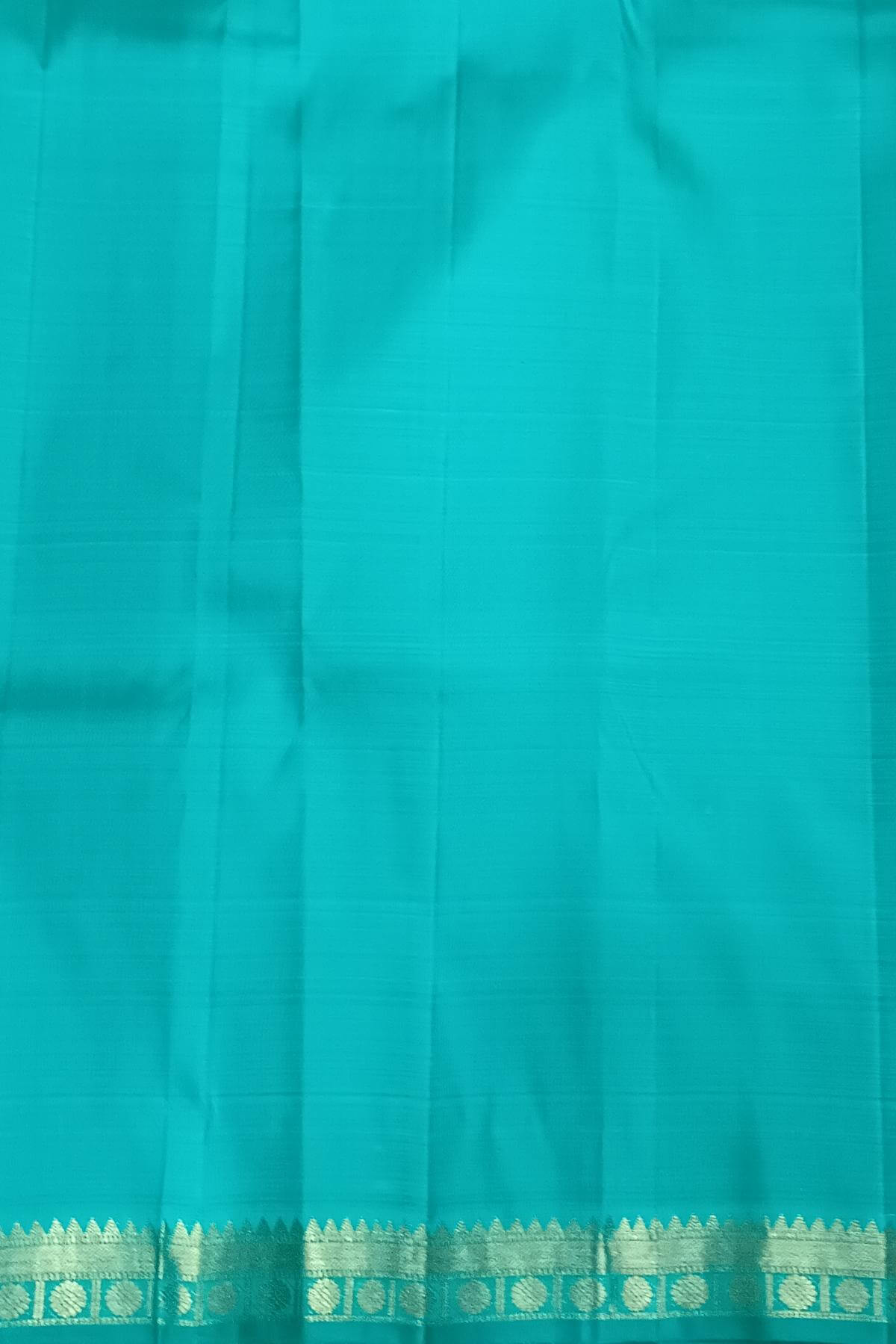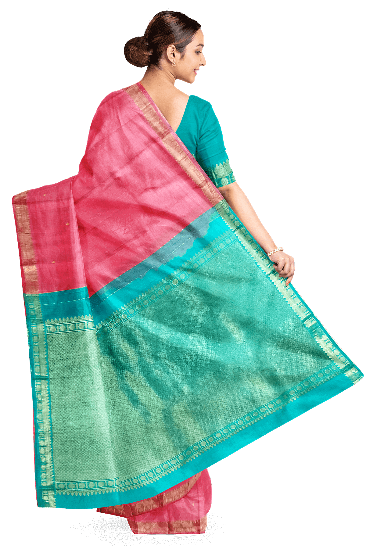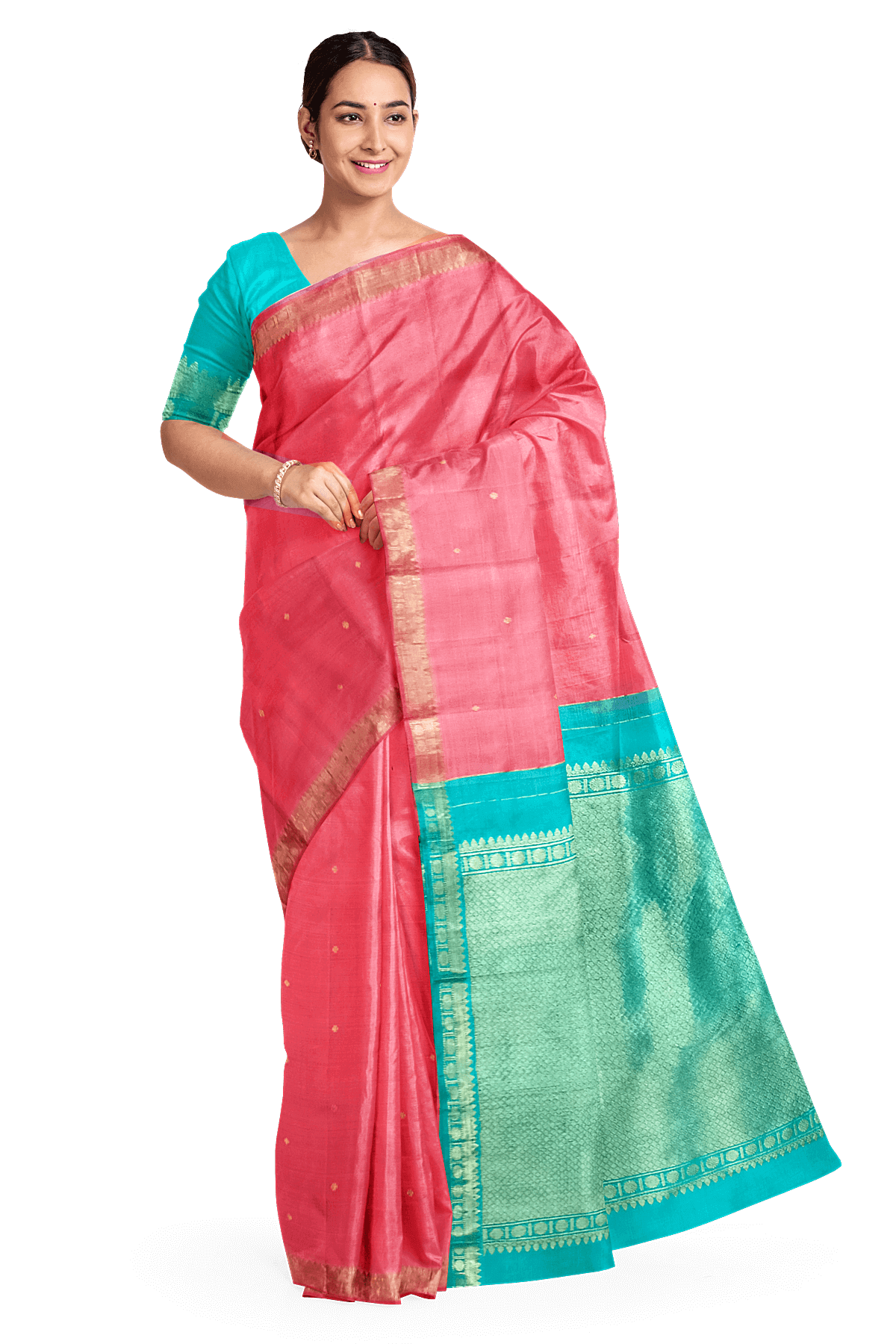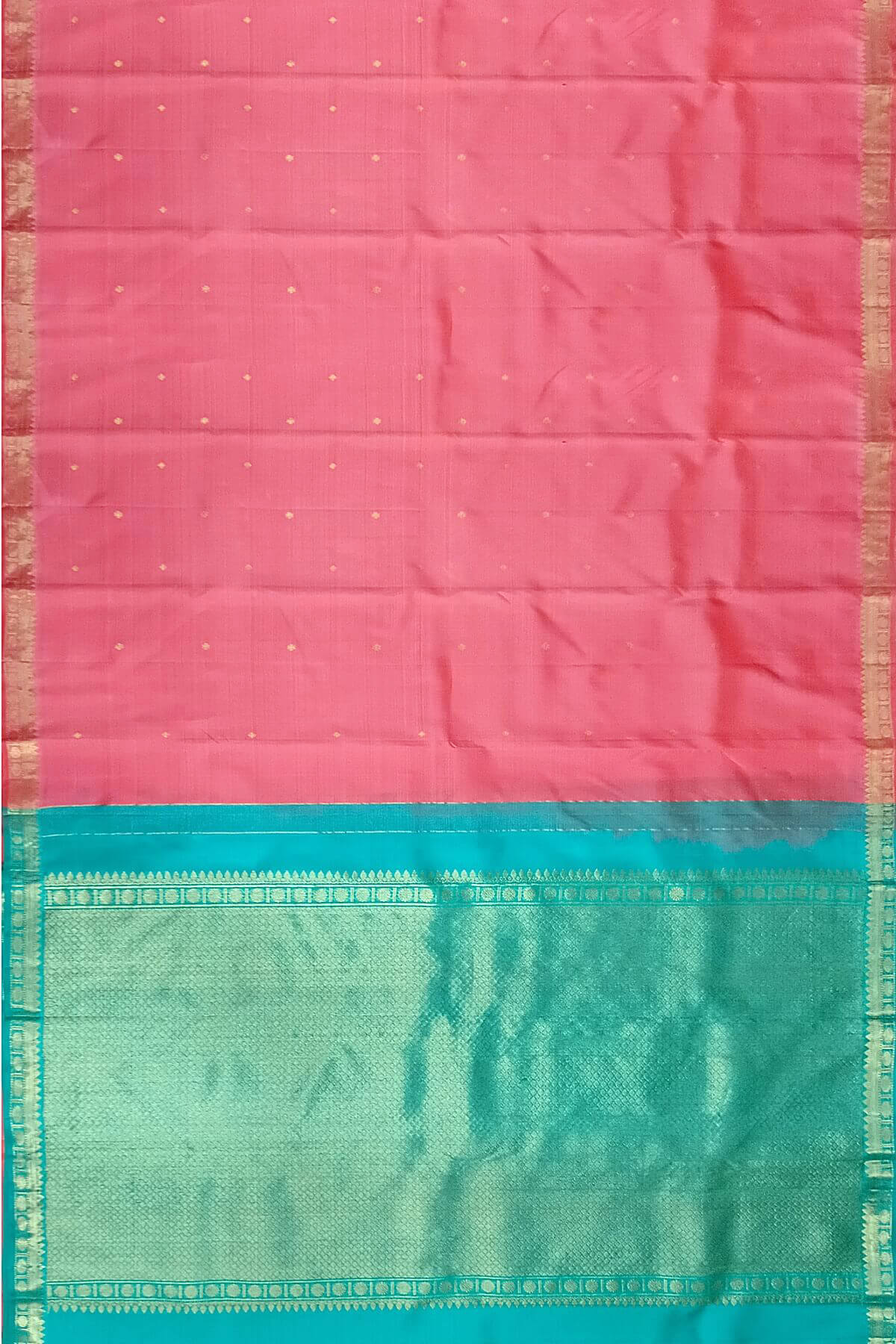 Description: Kanchi pure silk saree in pink with small buttis and a rich contrast pallu in teal green.