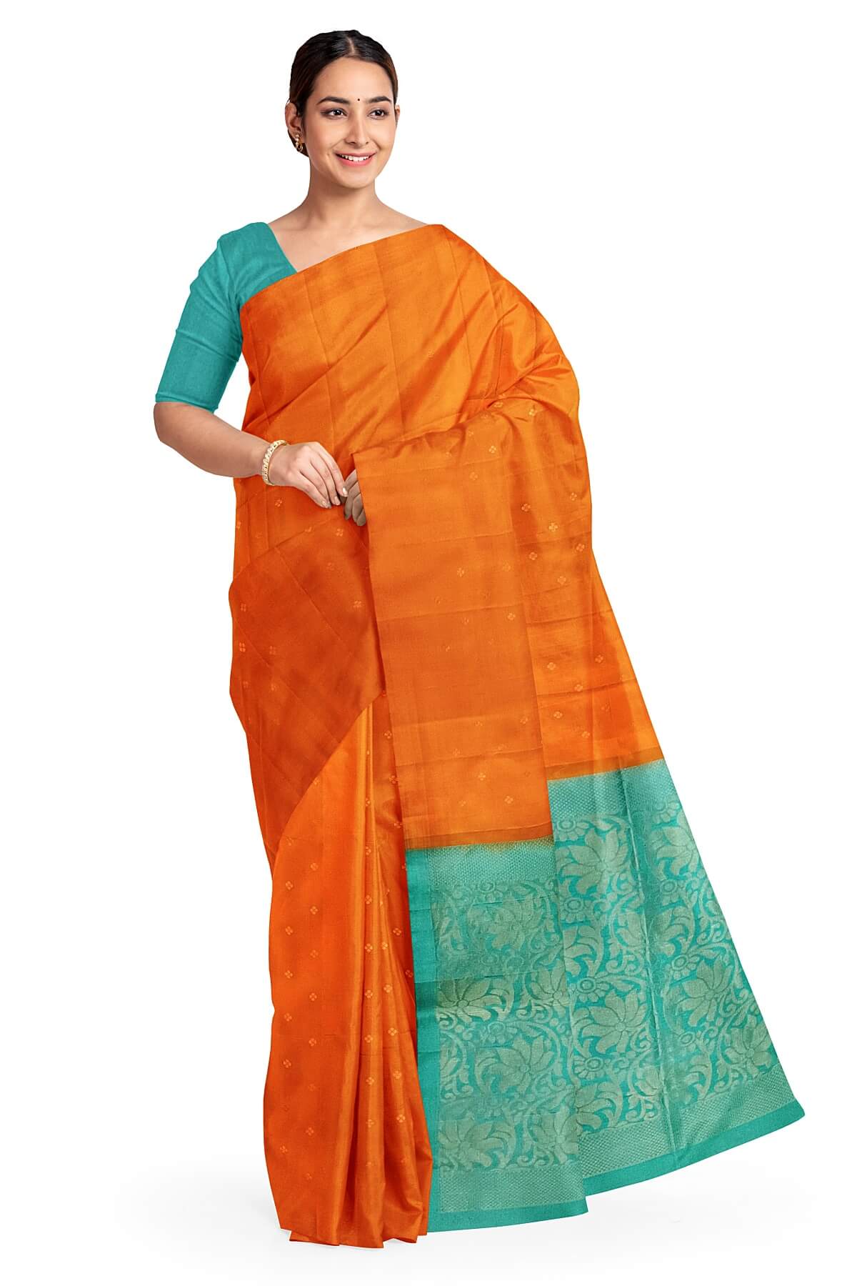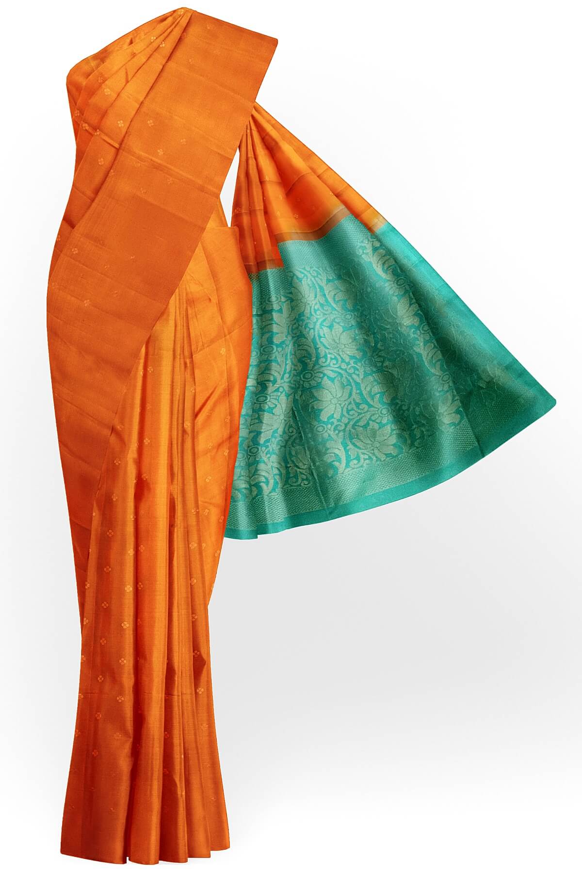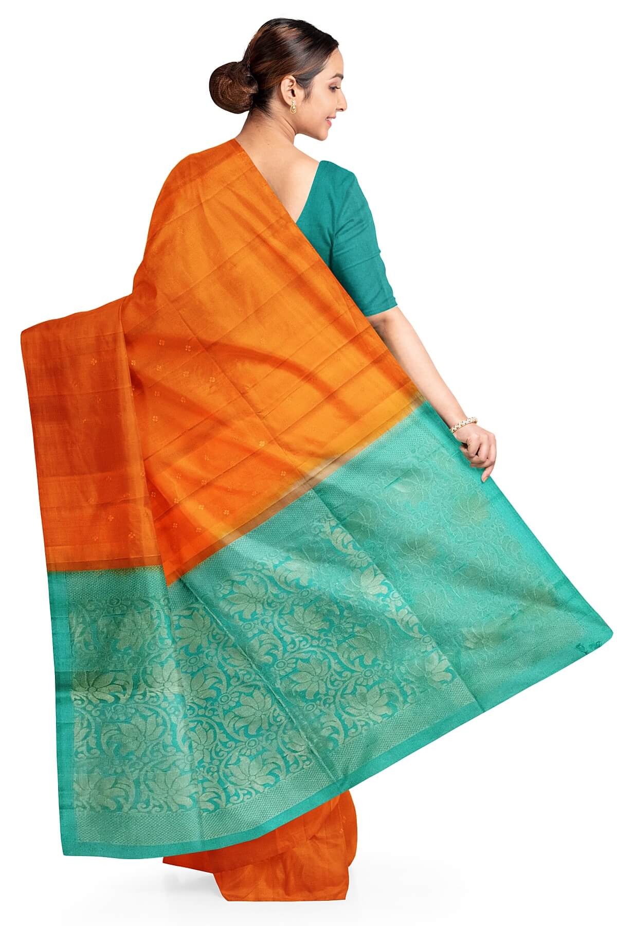 Description: Kanchi soft silk saree in orange with small motifs on the body and floral vines in pallu