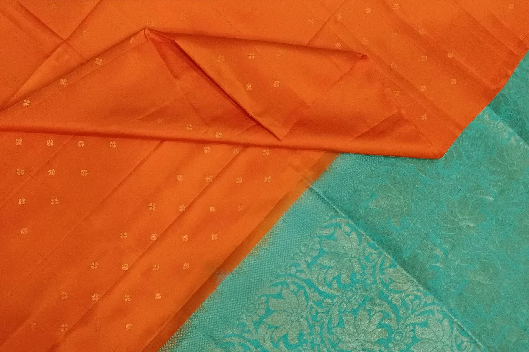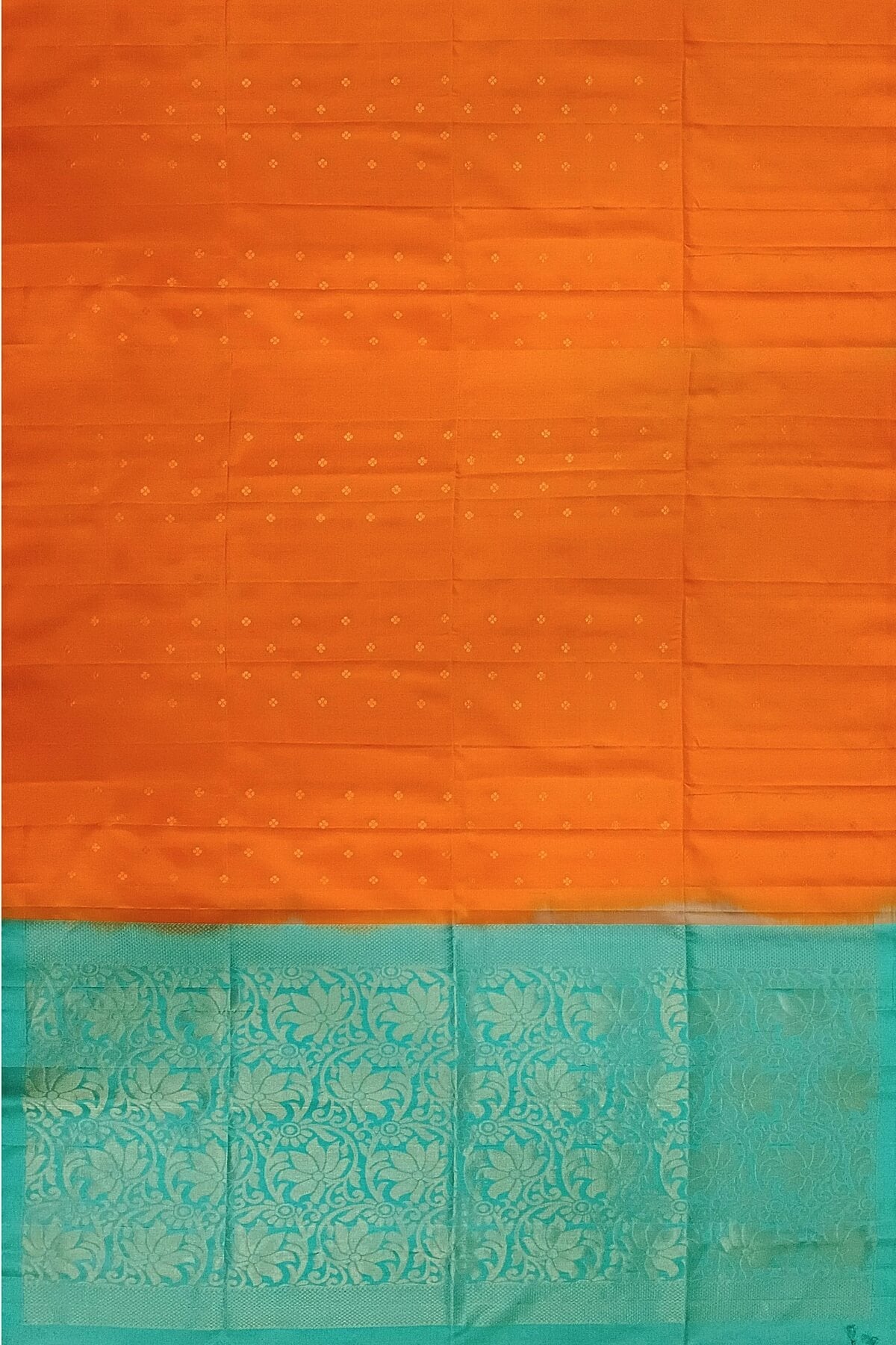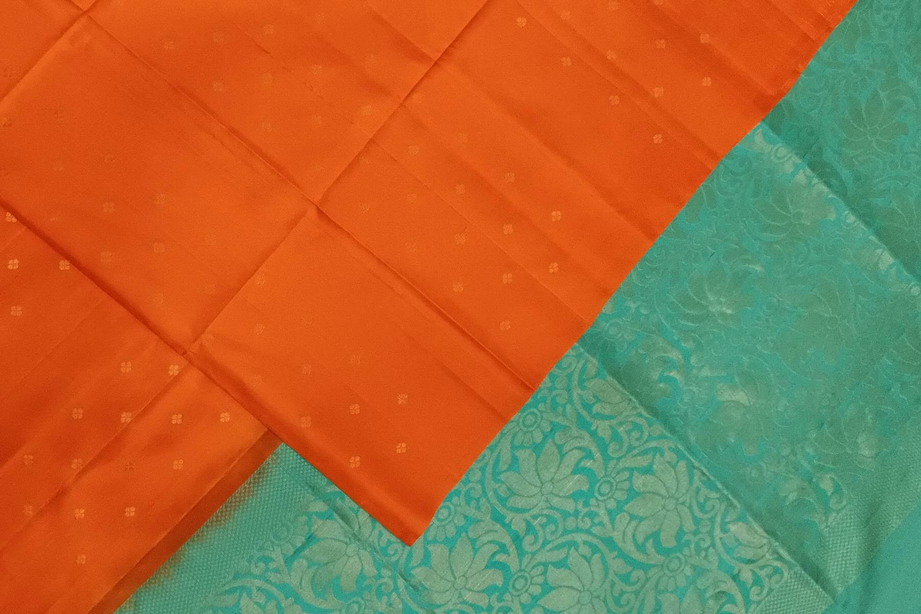 Description: Kanchi soft silk saree in orange with small motifs on the body and floral vines in pallu