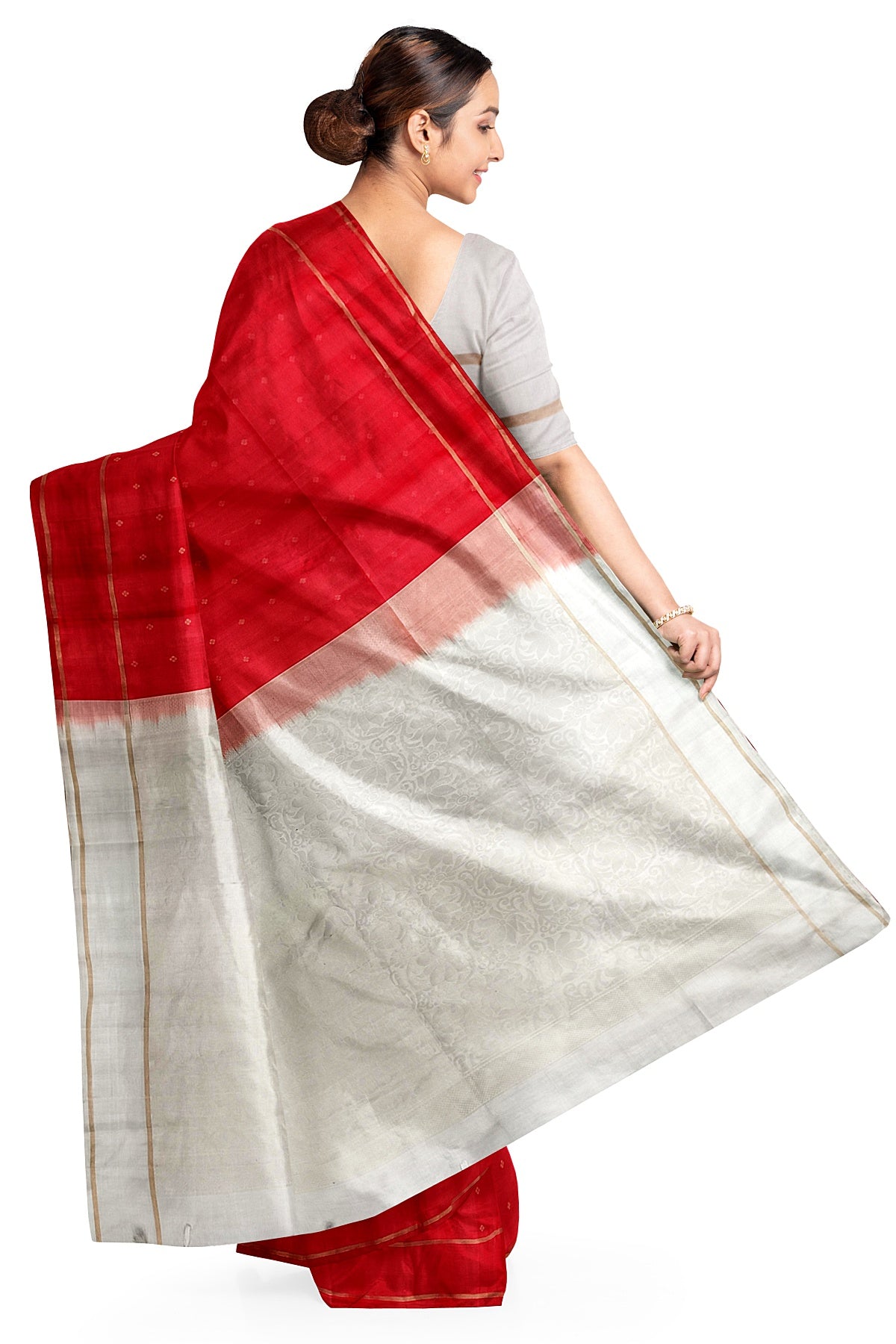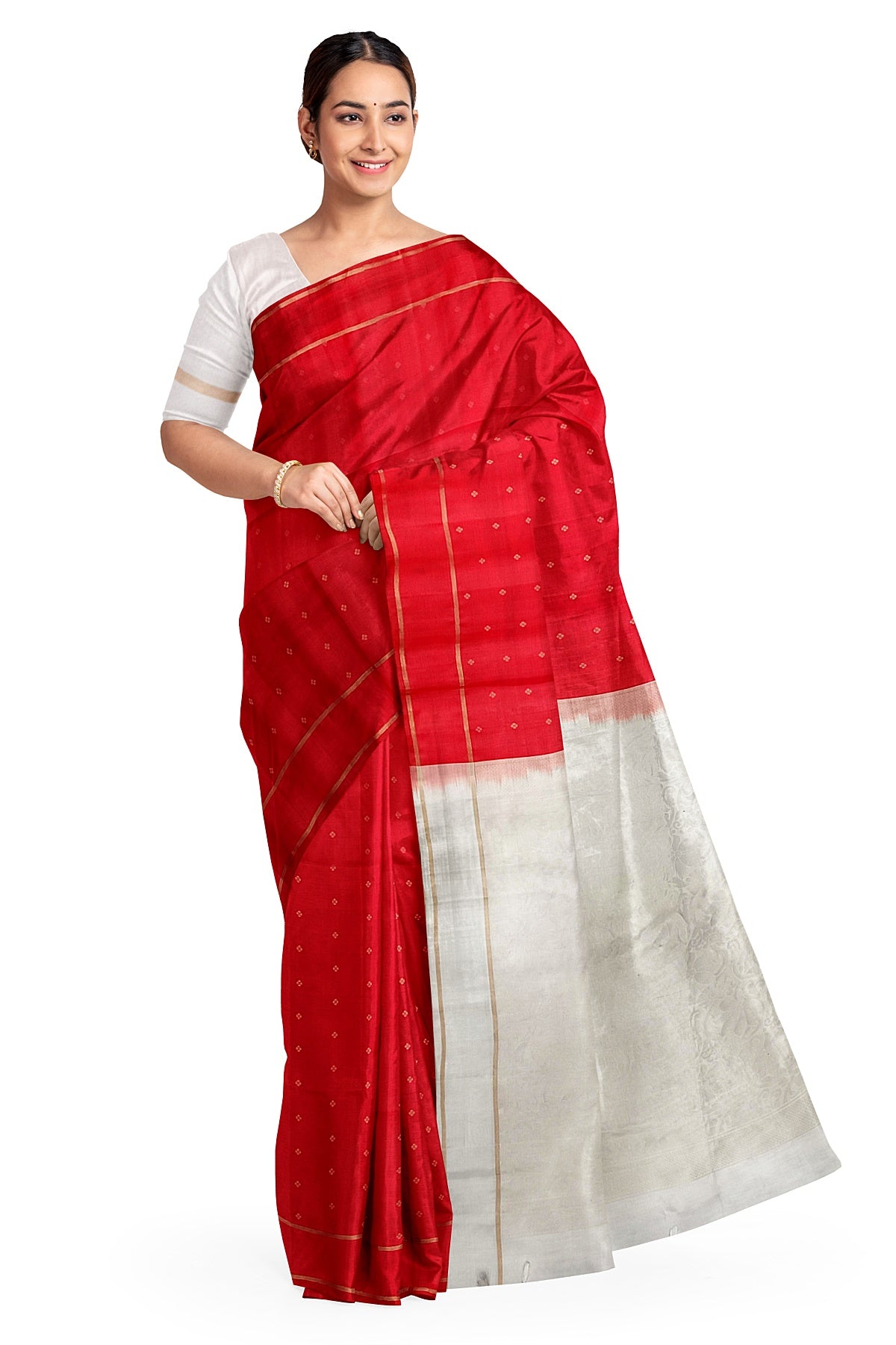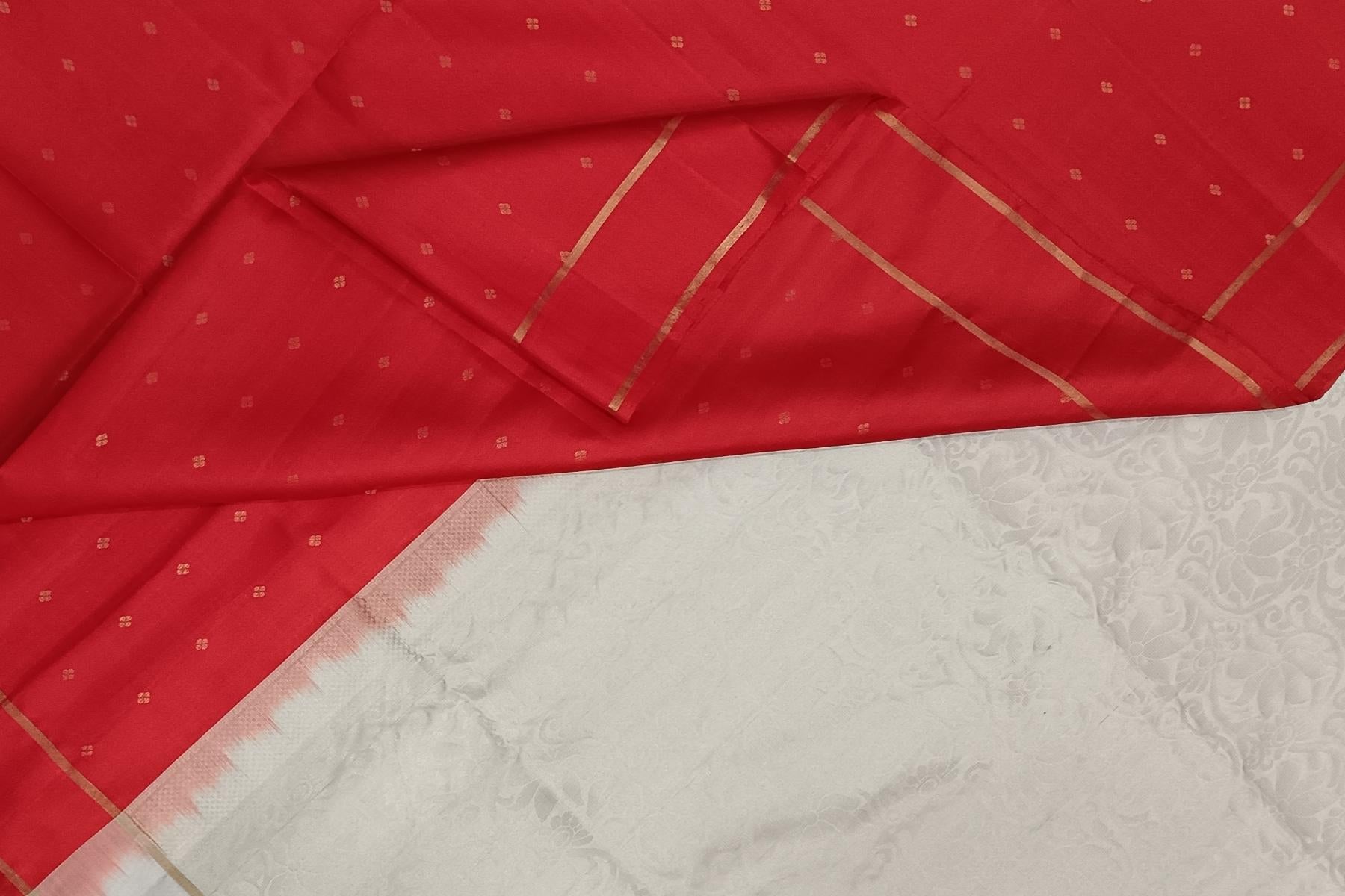 Description: Kanchi soft silk saree in red with small motifs on the body and a contrast pallu