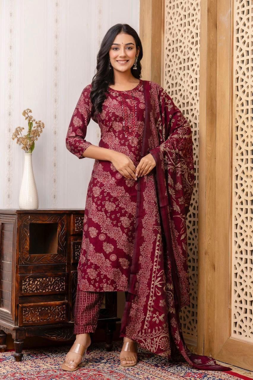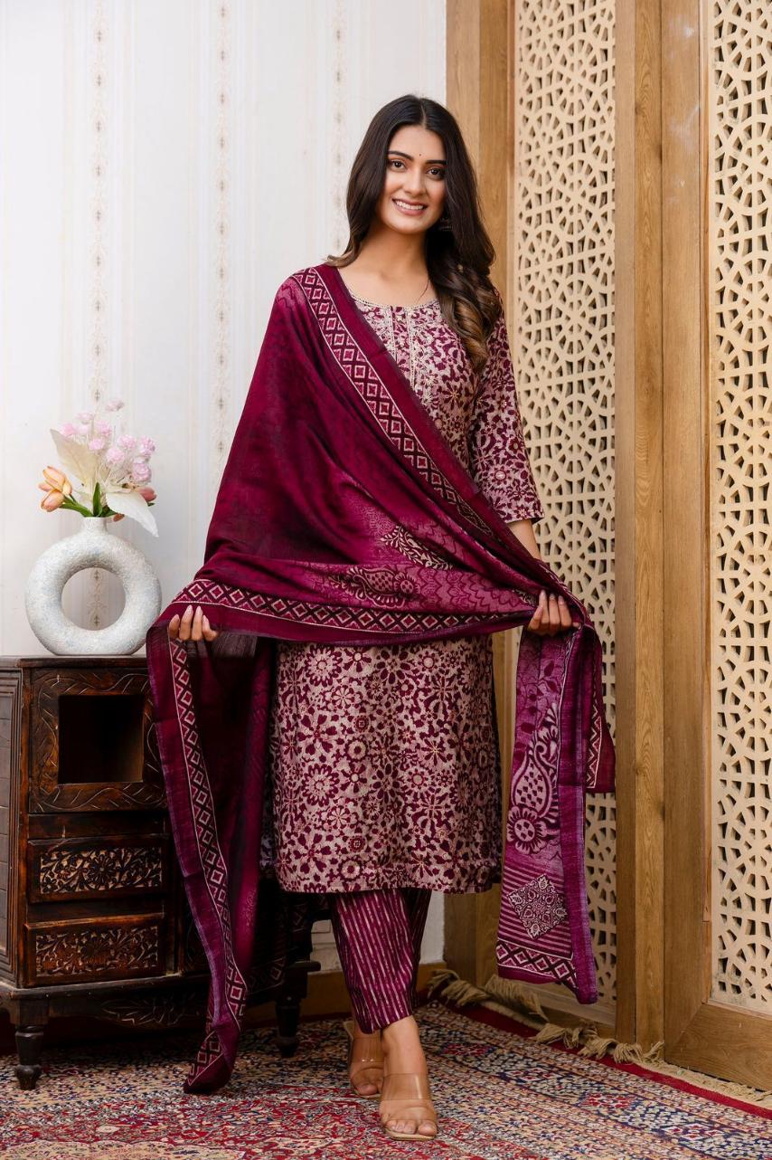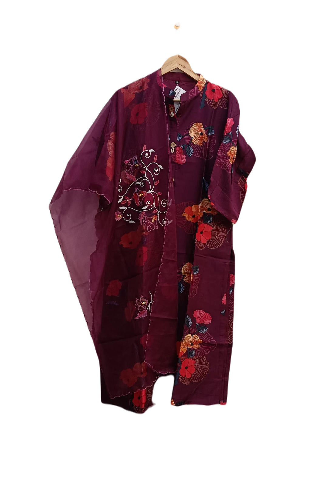 Muslin 3piece kurta set ( top, bottom & dupatta) in wine