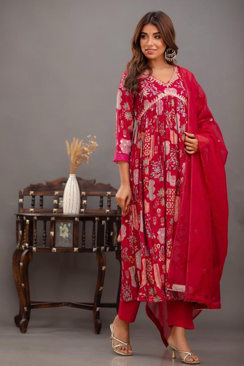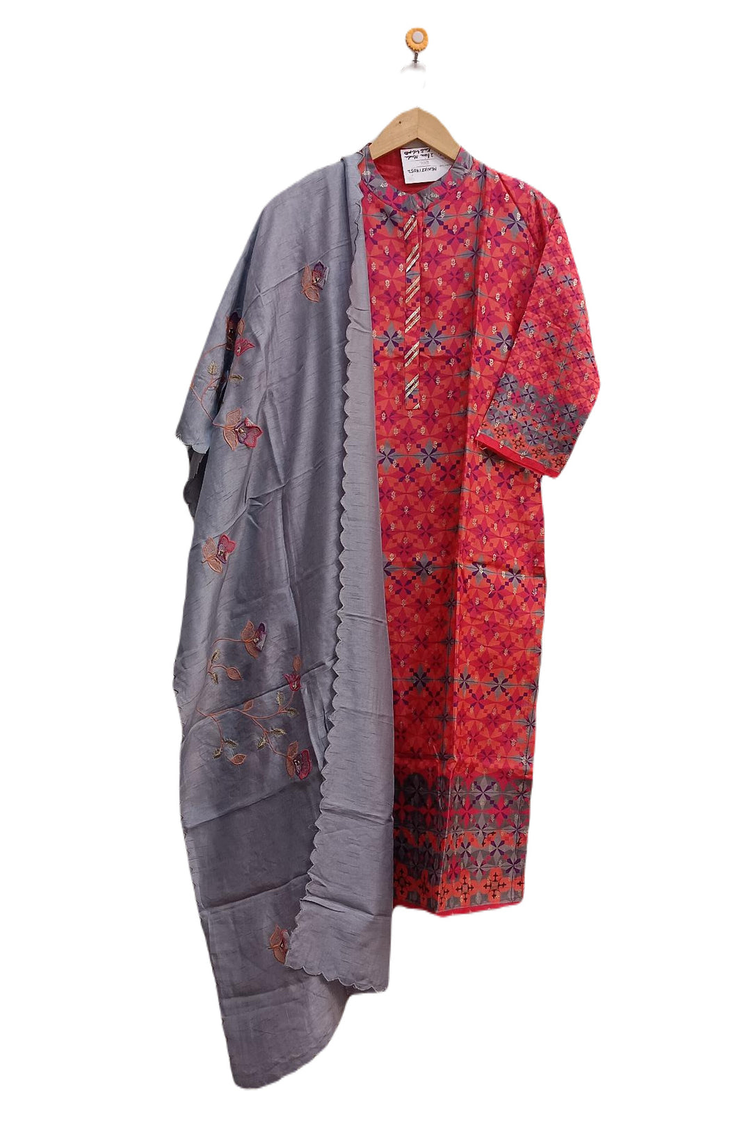 Muslin 3piece kurta set ( top, bottom & dupatta) in dark pink
