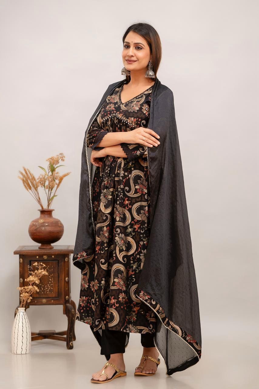 Muslin 3piece kurta set ( top, bottom & dupatta) in black