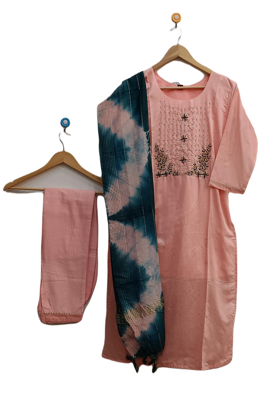 Muslin 3 piece kurta set ( top , dupatta & bottom) in peach