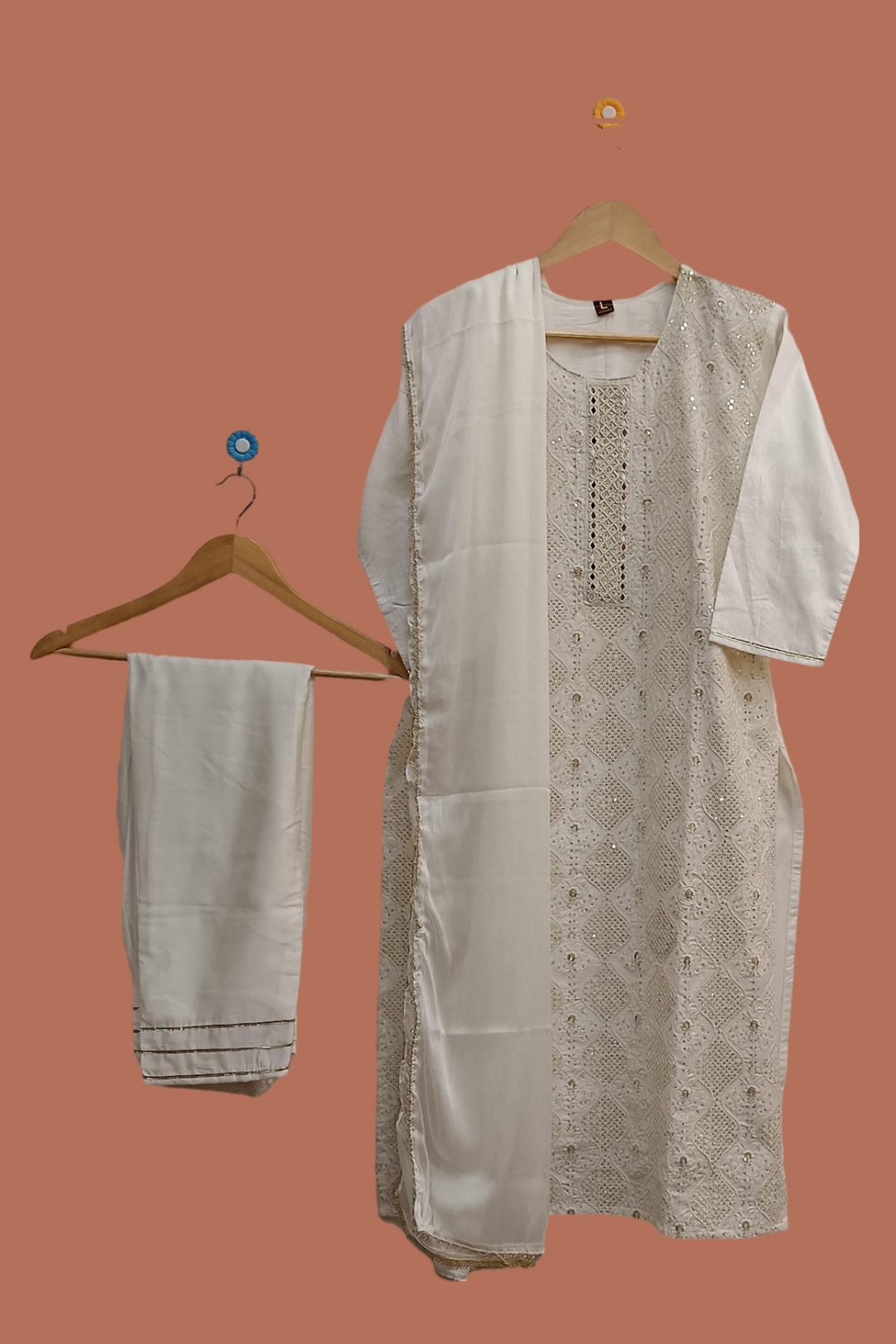 Muslin 3piece set ( top, dupatta & bottom) in white