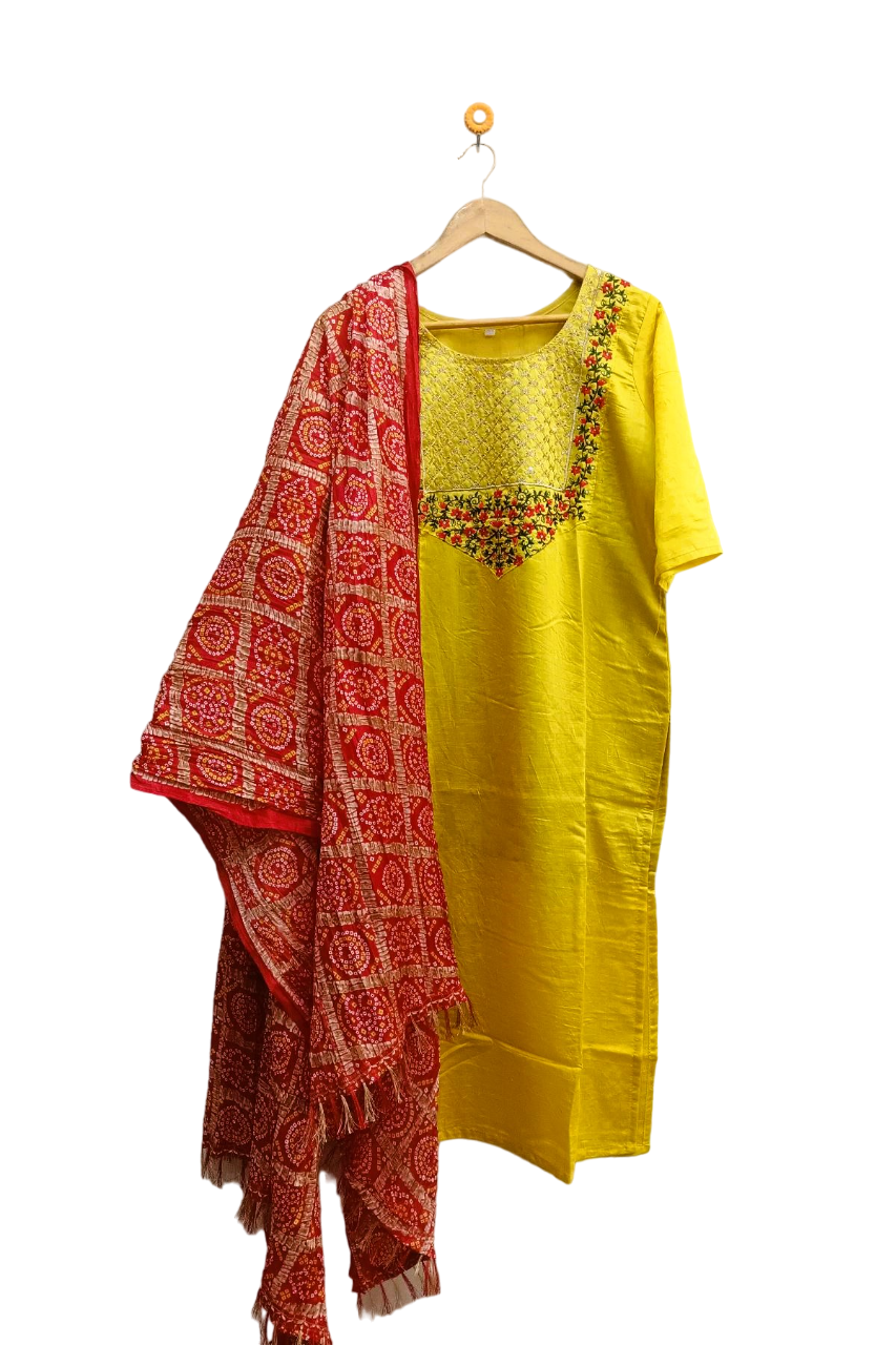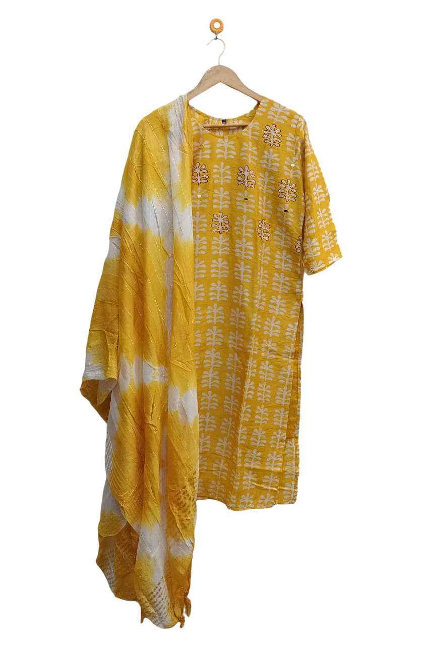 Muslin 2 piece kurta & dupatta set in yellow with embroidery work