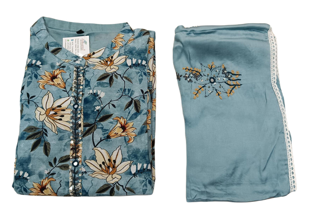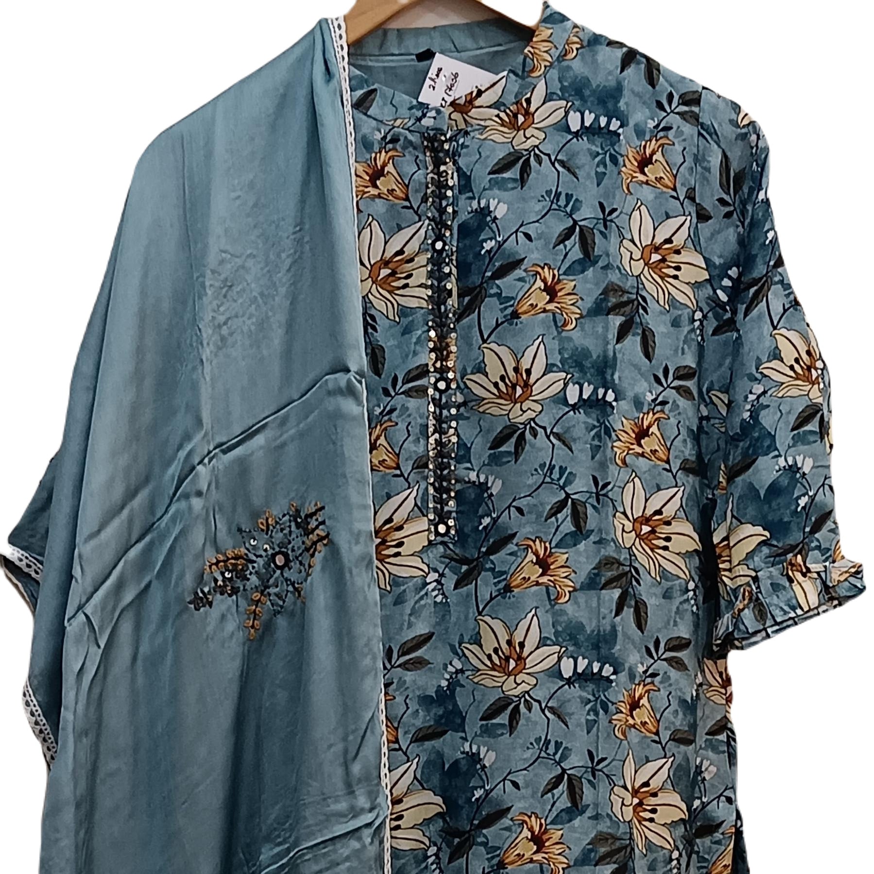 Description : Muslin 2 piece kurta & dupatta set in bluish grey . Nice embroidery work on dupatta