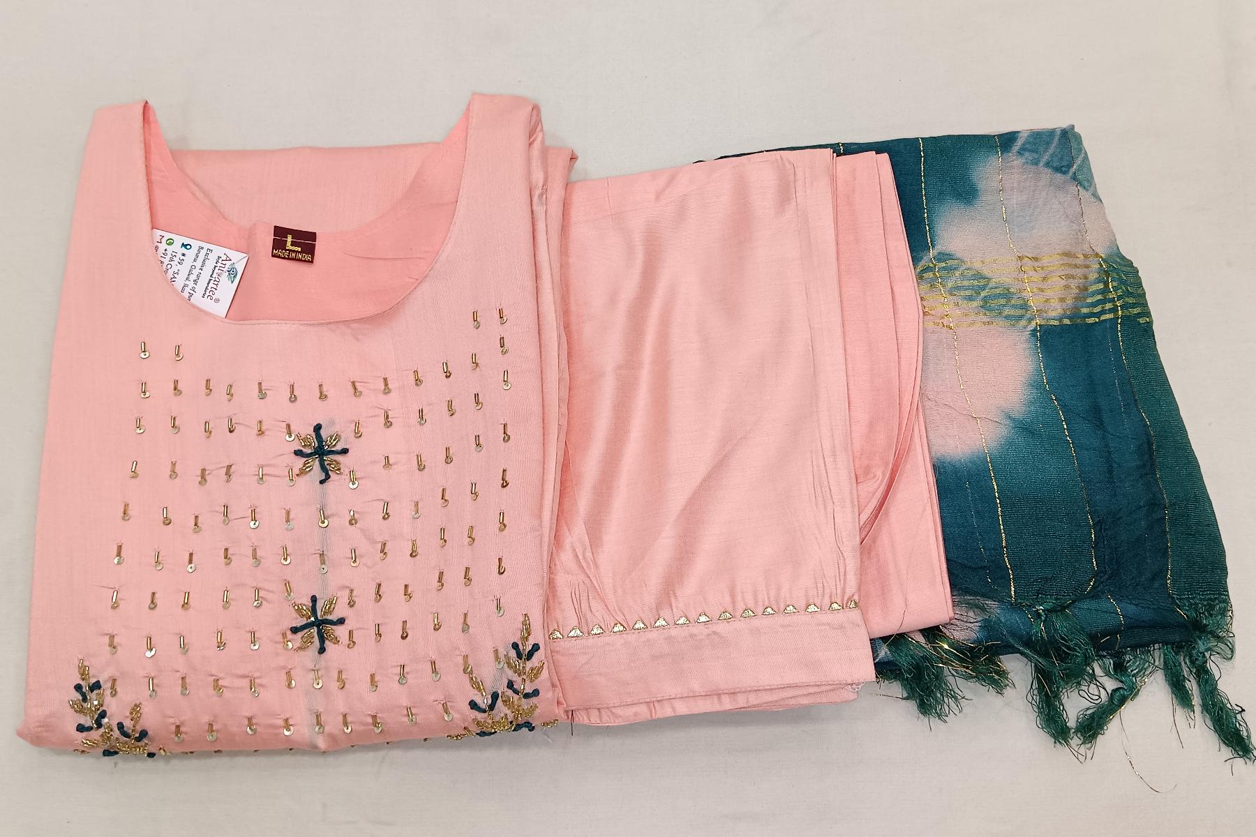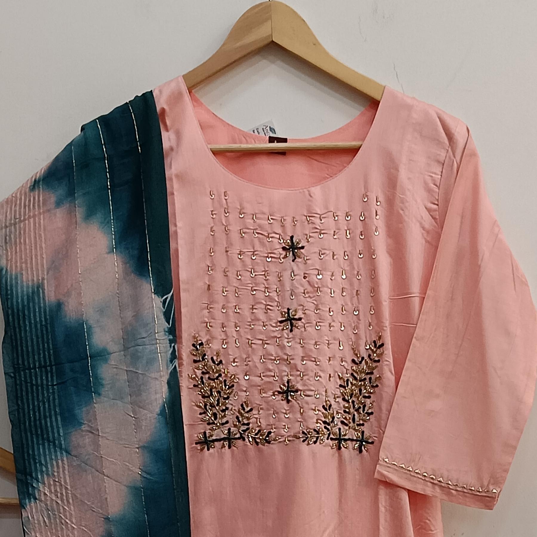 Description : Muslin 3 piece kurta set ( top , dupatta & bottom) in peach