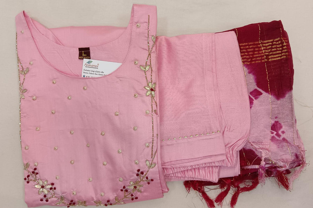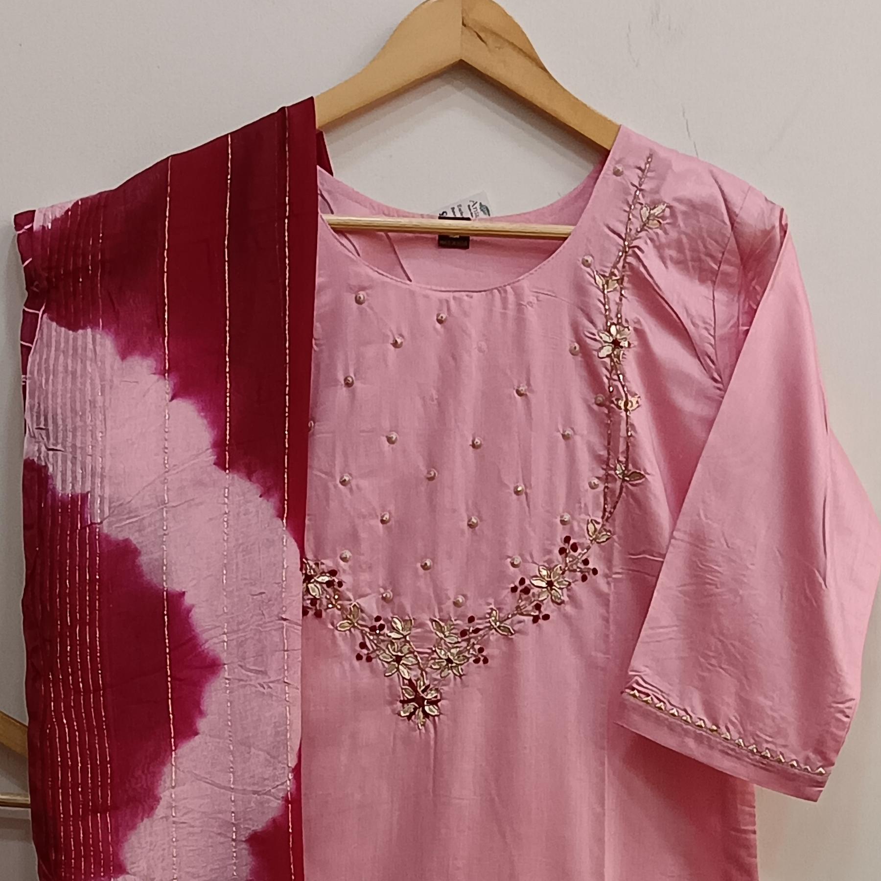 Description : Muslin 3 piece kurta set ( top, dupatta & bottom) in baby pink