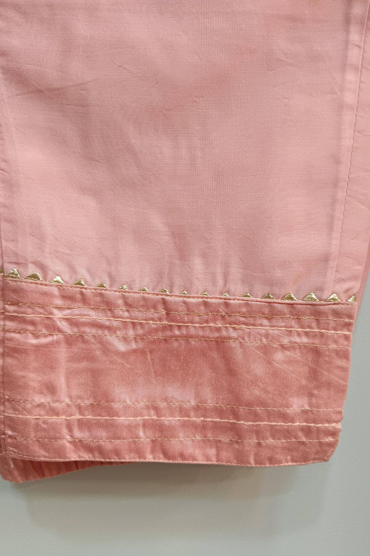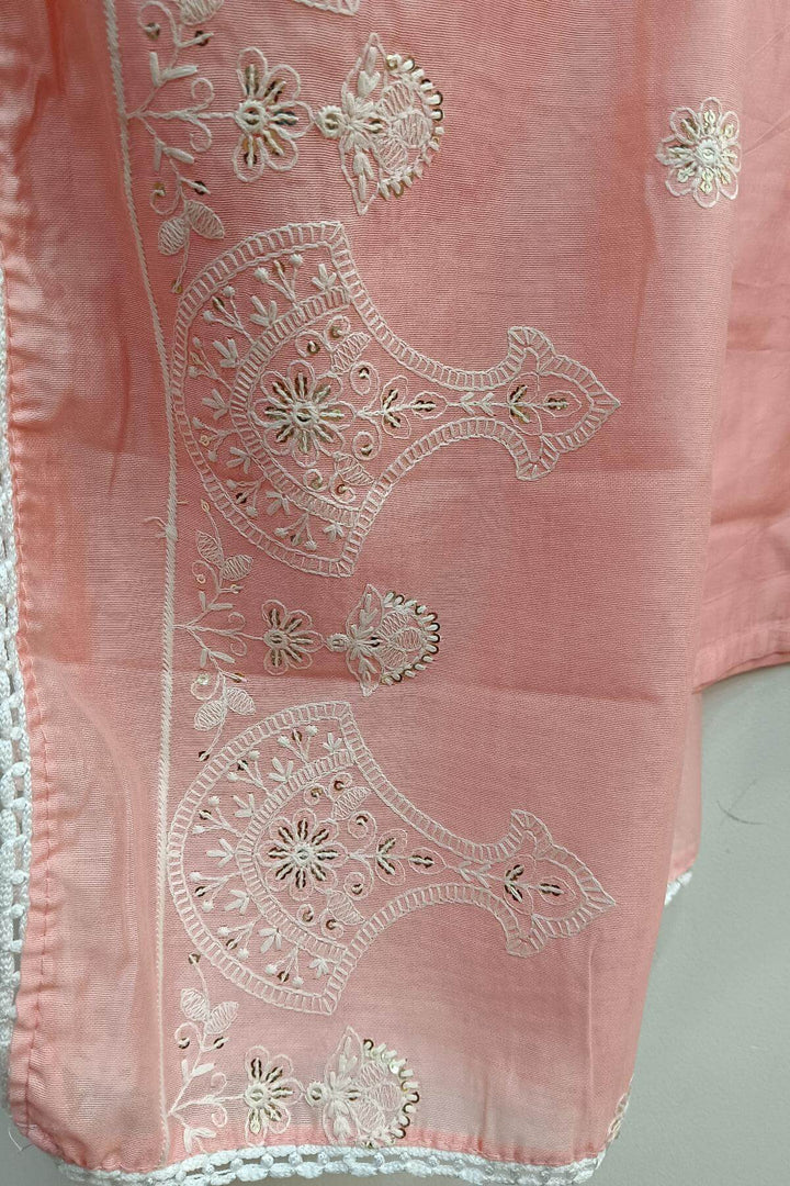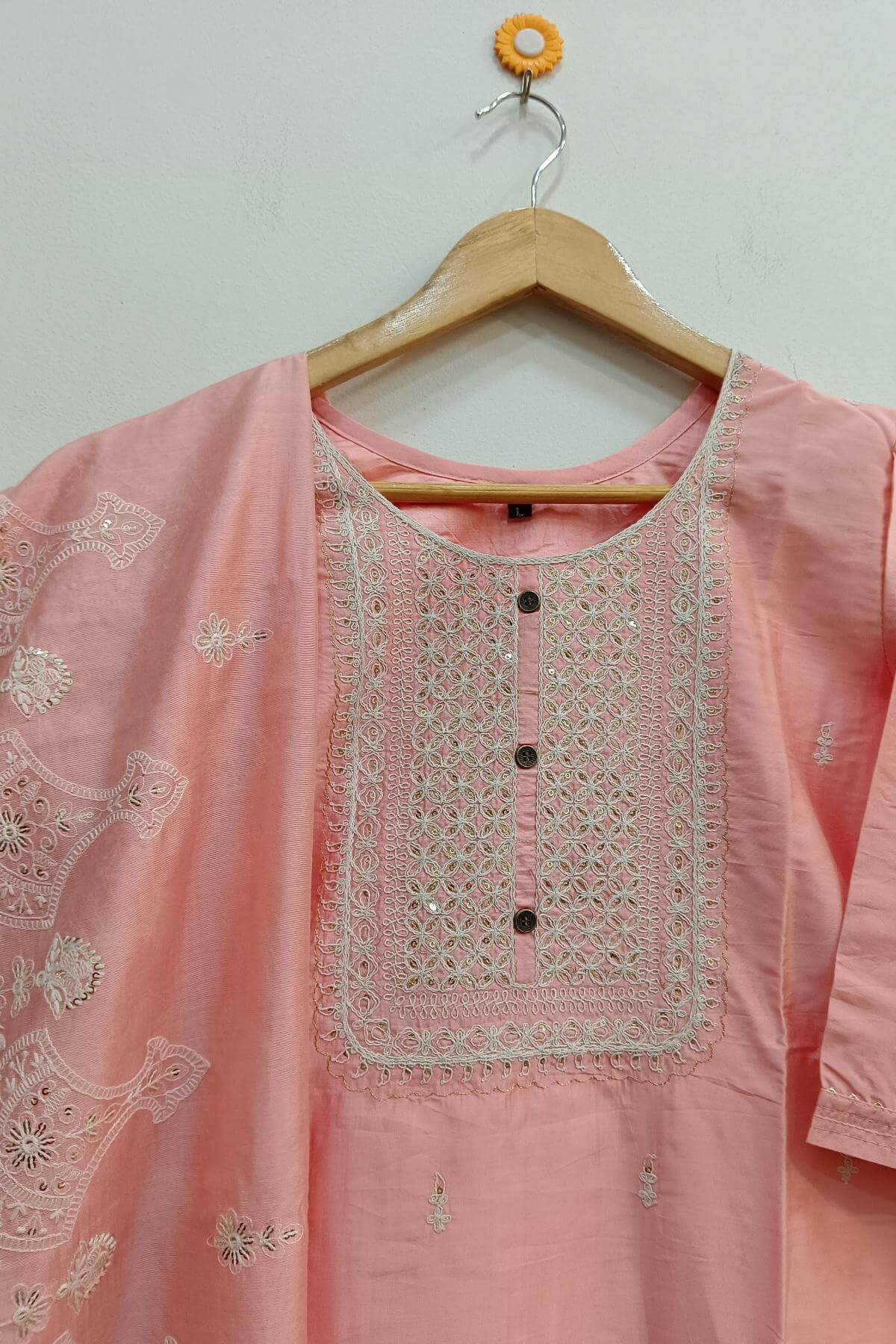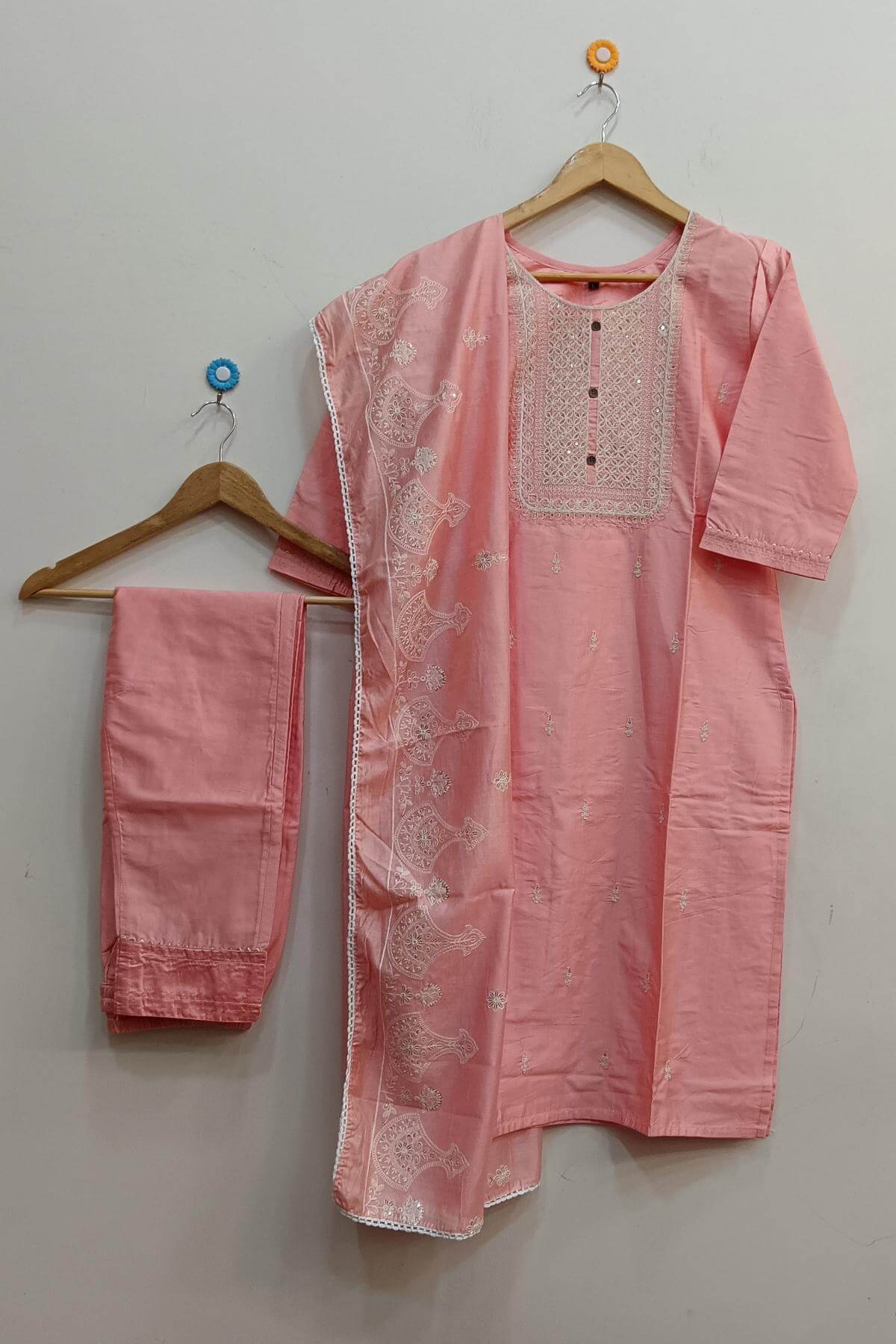 Description : Muslin 3 piece kurta set (top , bottom & dupatta ) in peach