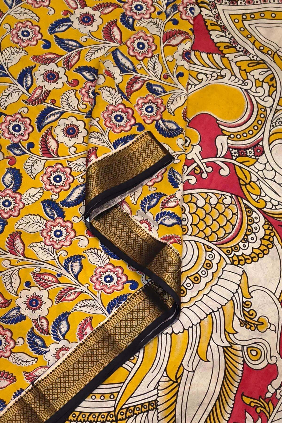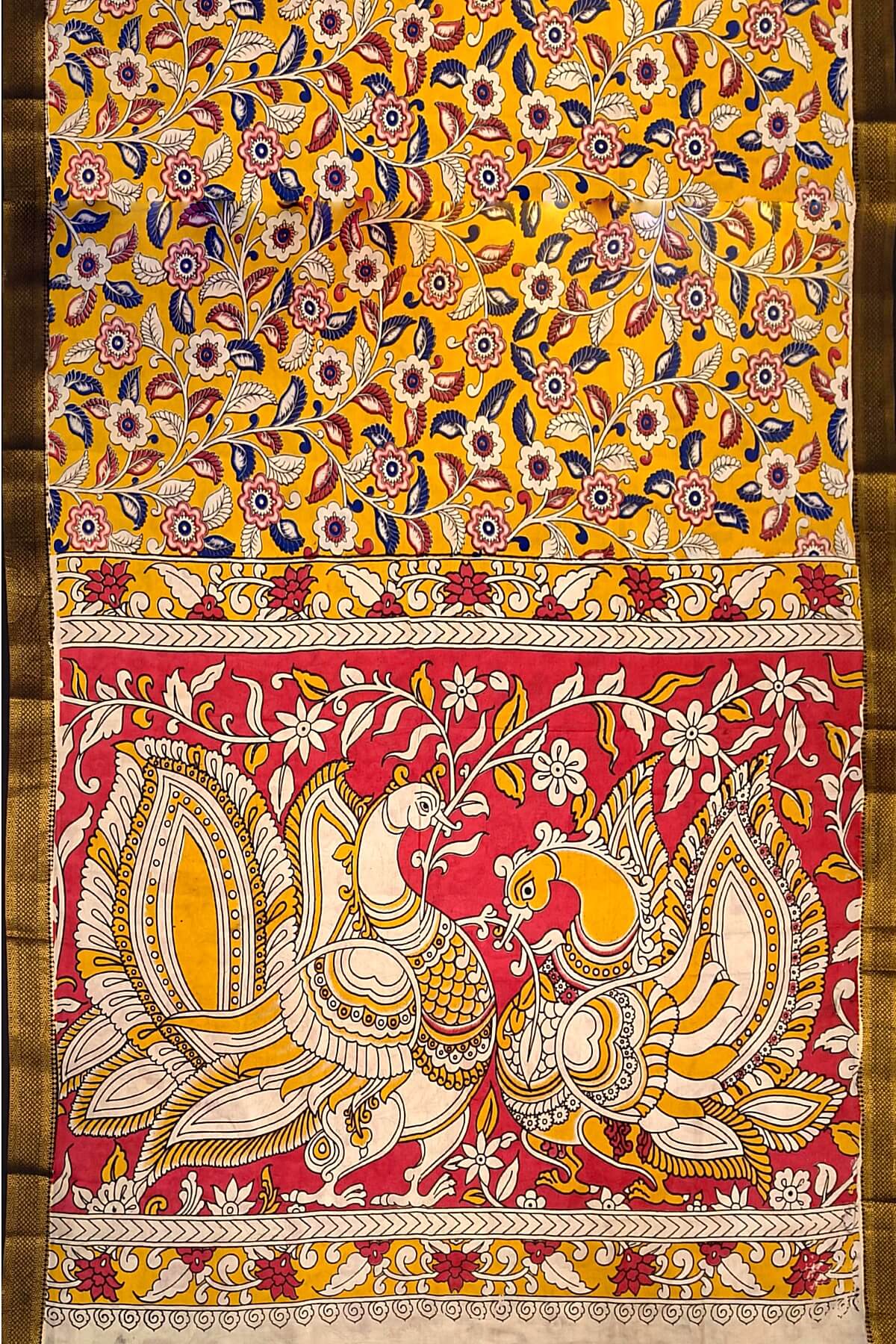 Description: Mangalgiri silk cotton saree in  mustard in kalamkari print with nizam border