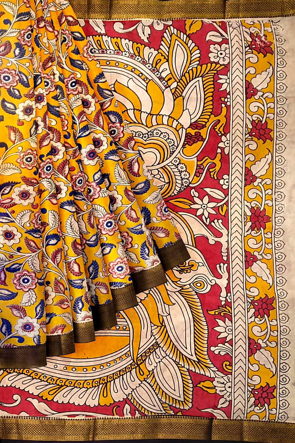Mangalgiri silk cotton saree in mustard in kalamkari print