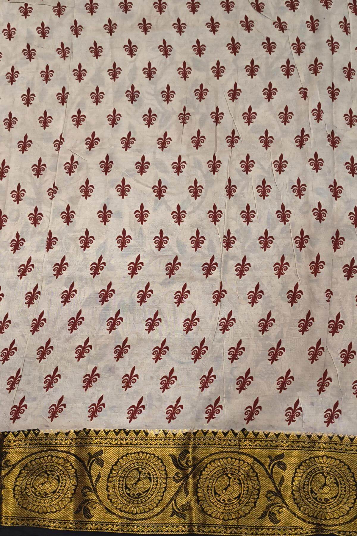 Description: Mangalgiri silk cotton saree in off white in kalamkari print with a 6" kanchi type border