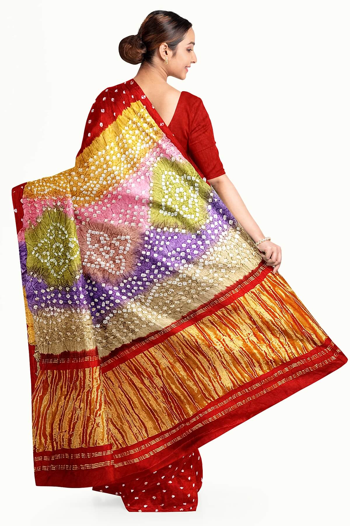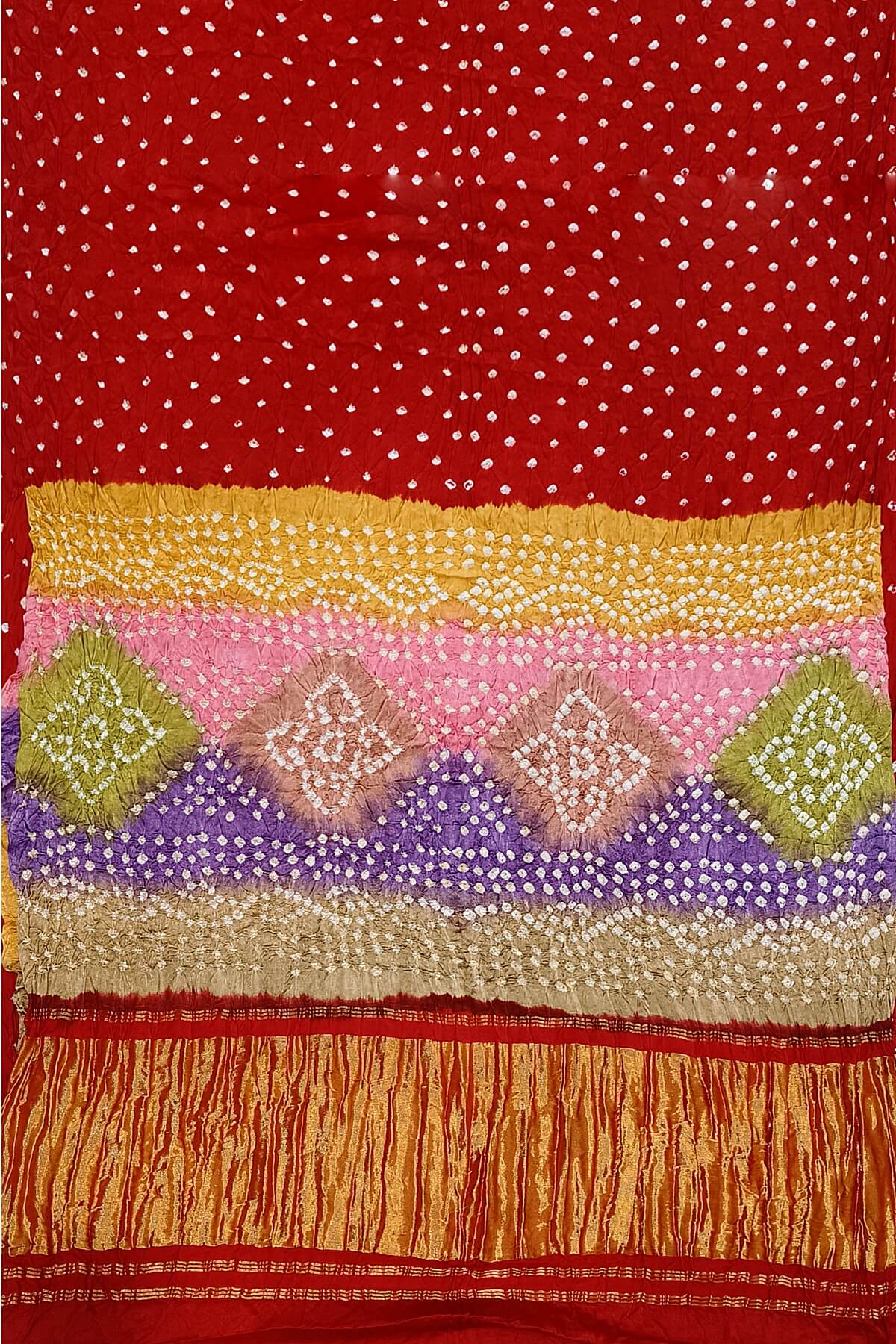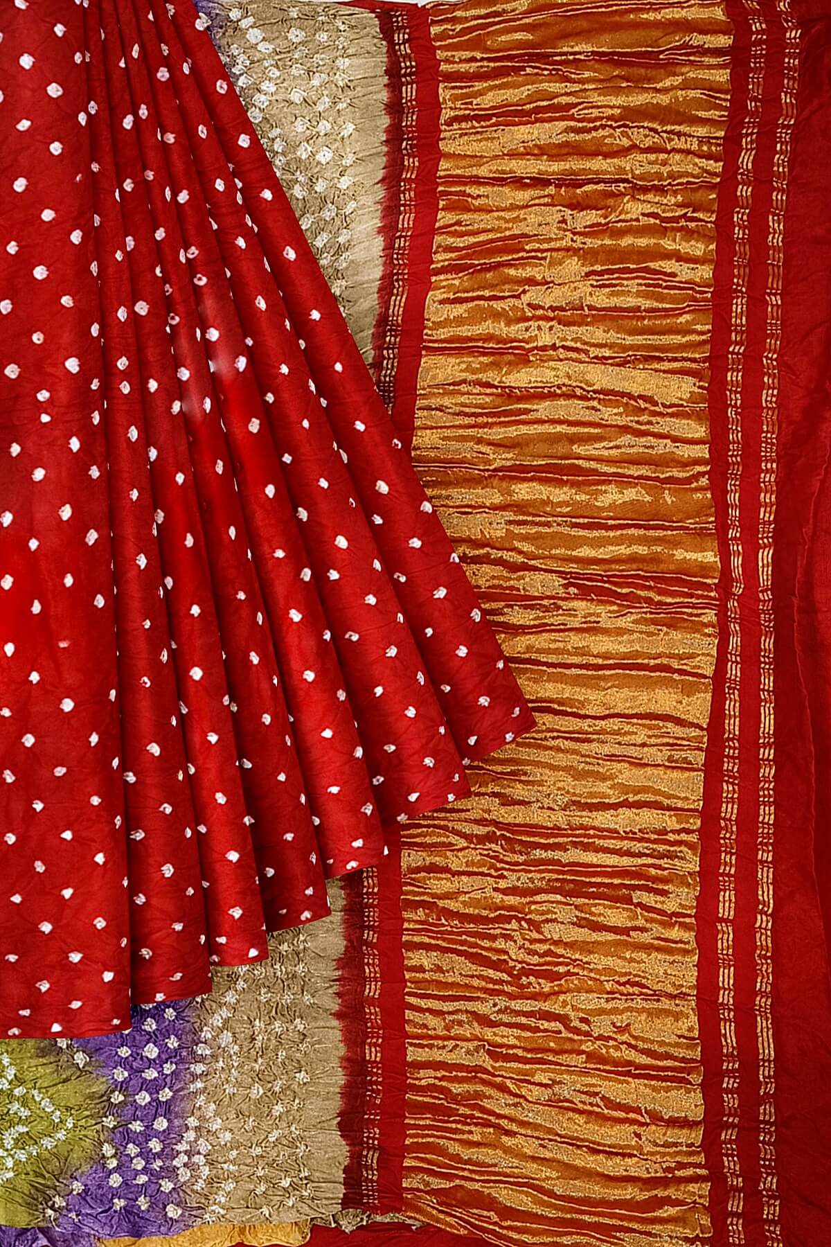 Description : Modal silk bandhni saree in red with multicolour & tissue pallu