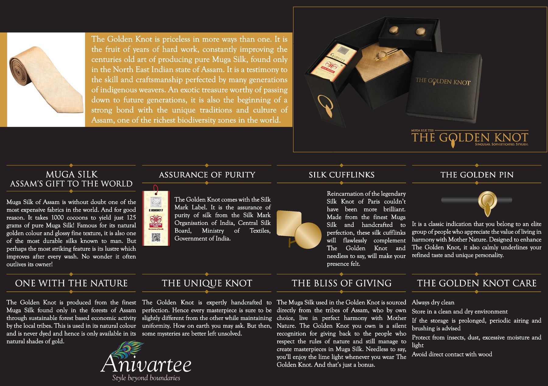 • ‘The Golden Knot’ is a beautiful thought and a neck tie rolled into one. It’s a priceless treasure in more ways than one. It’s the fruit of years of hard work, constantly improving the centuries-old art of producing pure and extremely rare Muga Silk, found only in the Indian state of Assam.