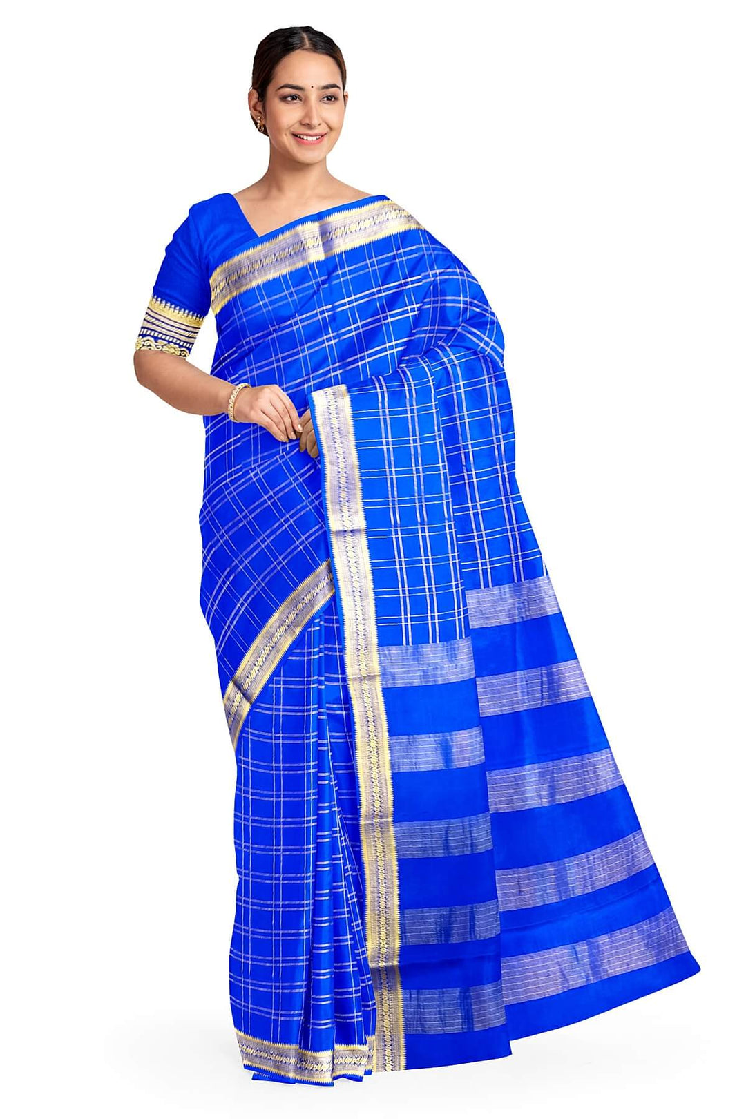 Mysore crepe pure silk saree in royal blue in fine zari checks all over the body