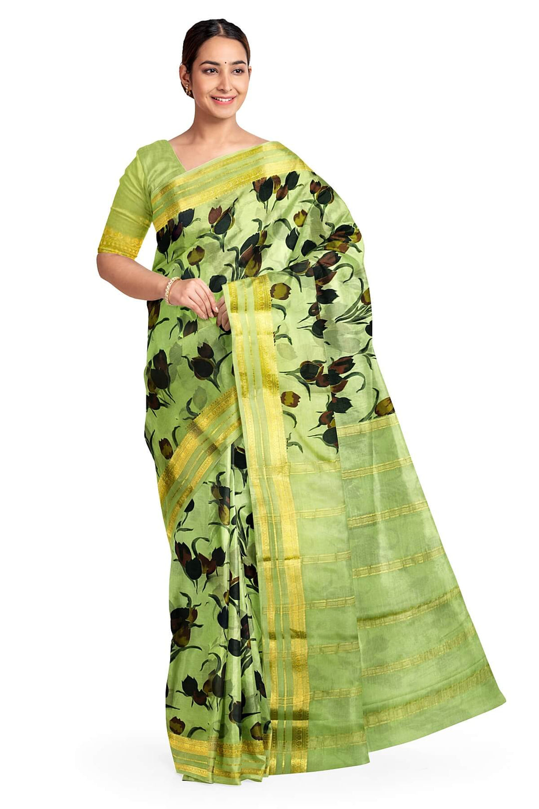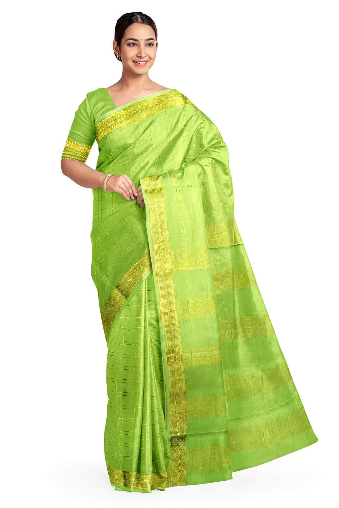 Mysore crepe pure silk saree in pista green in fine zari checks all over the body