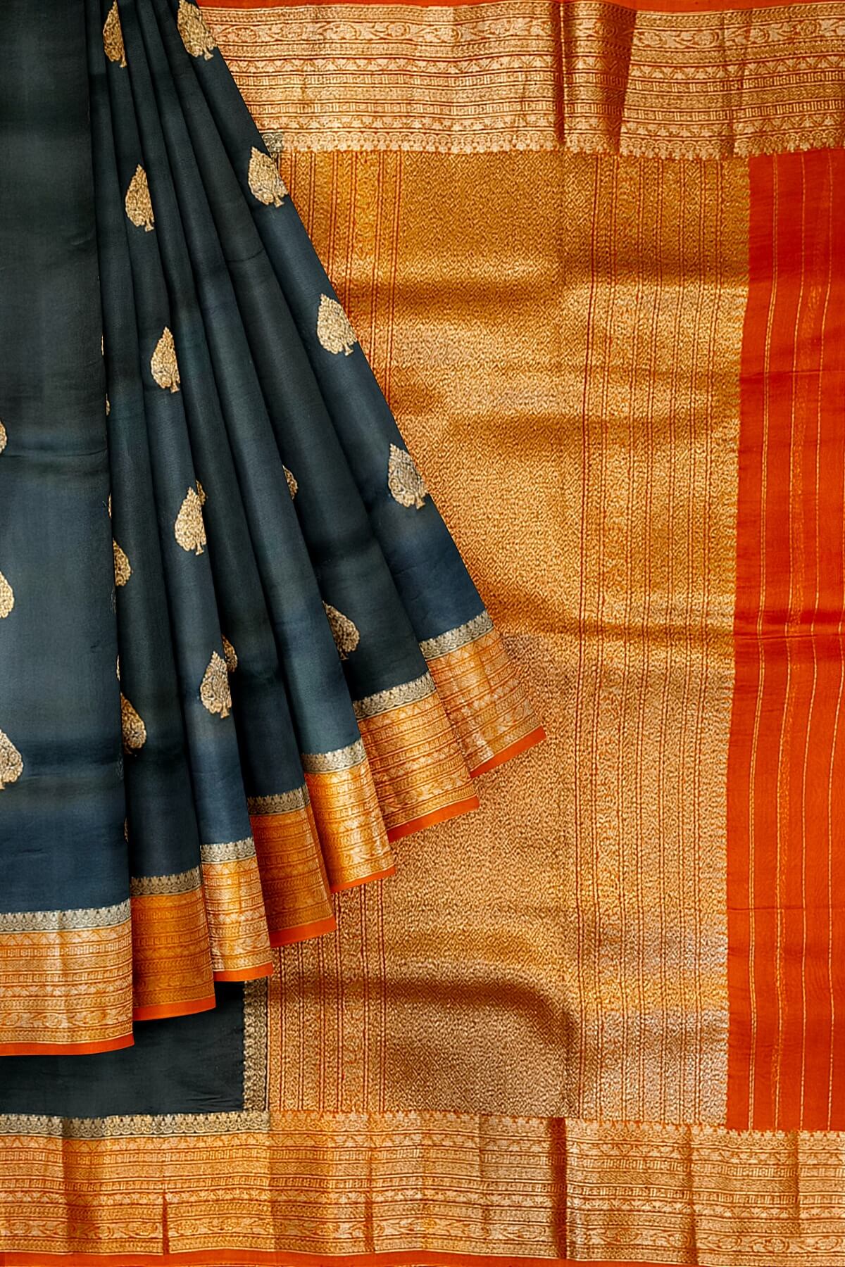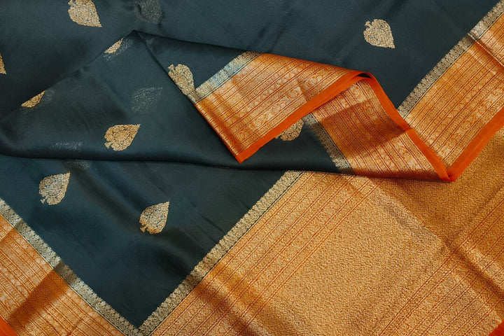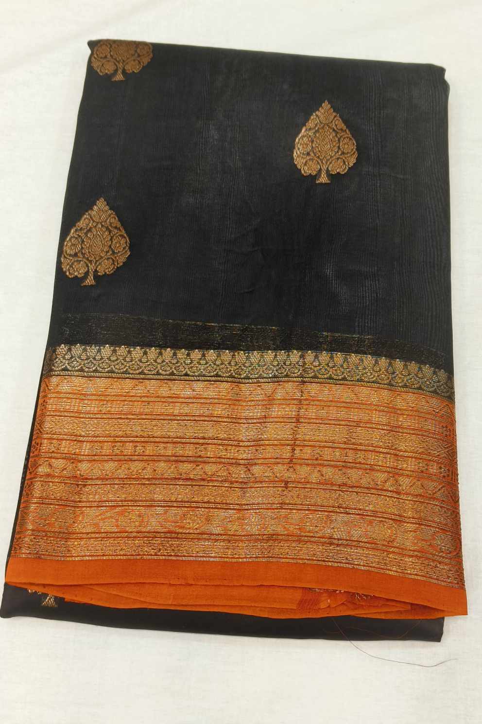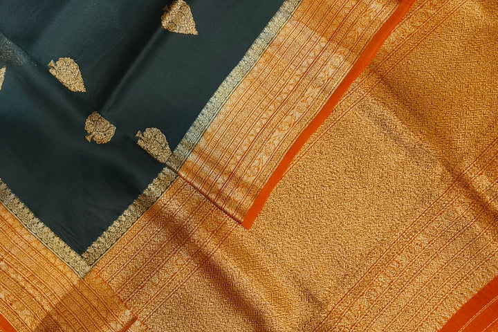 Banarasi kora ( organza) silk saree in black with gold motifs.