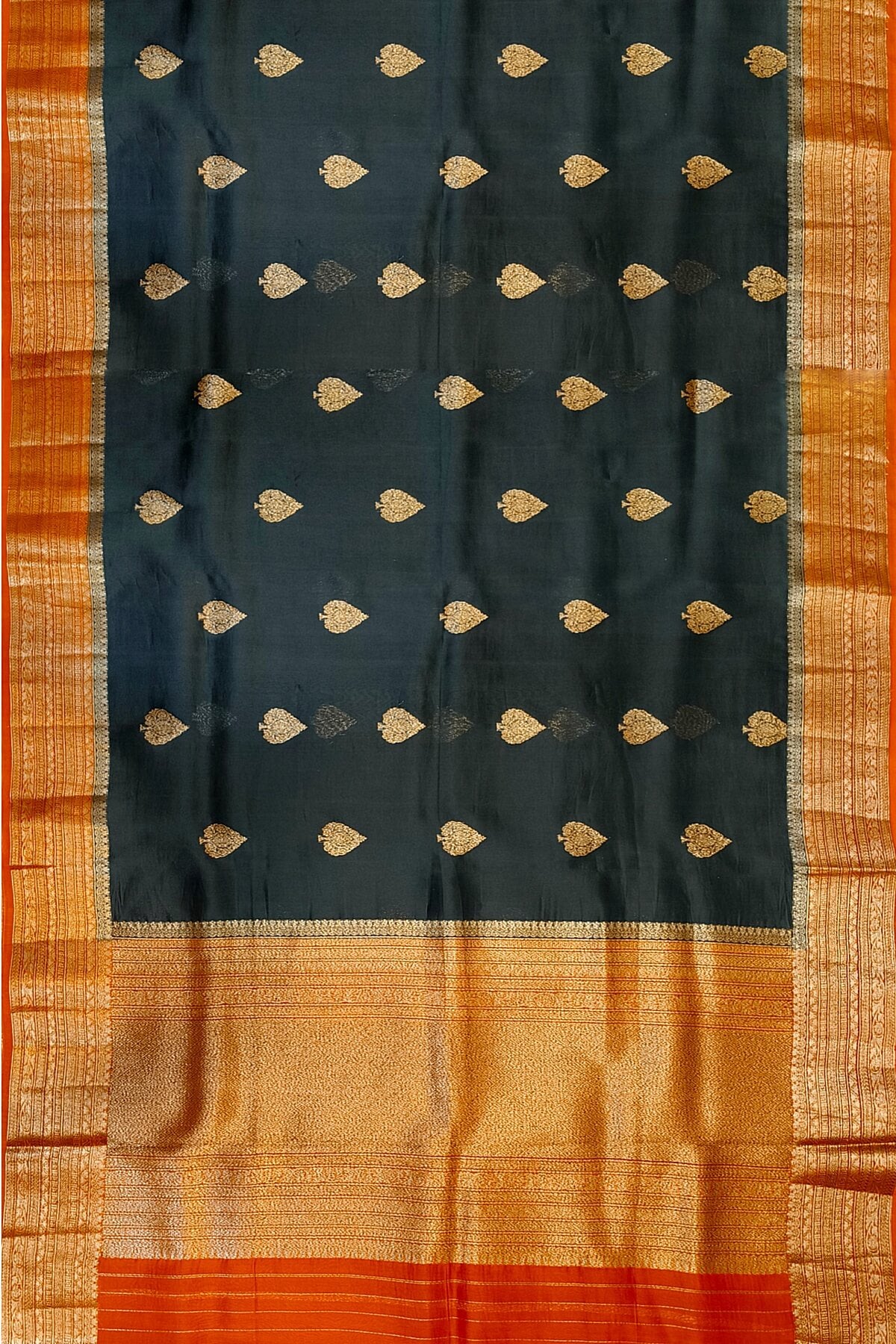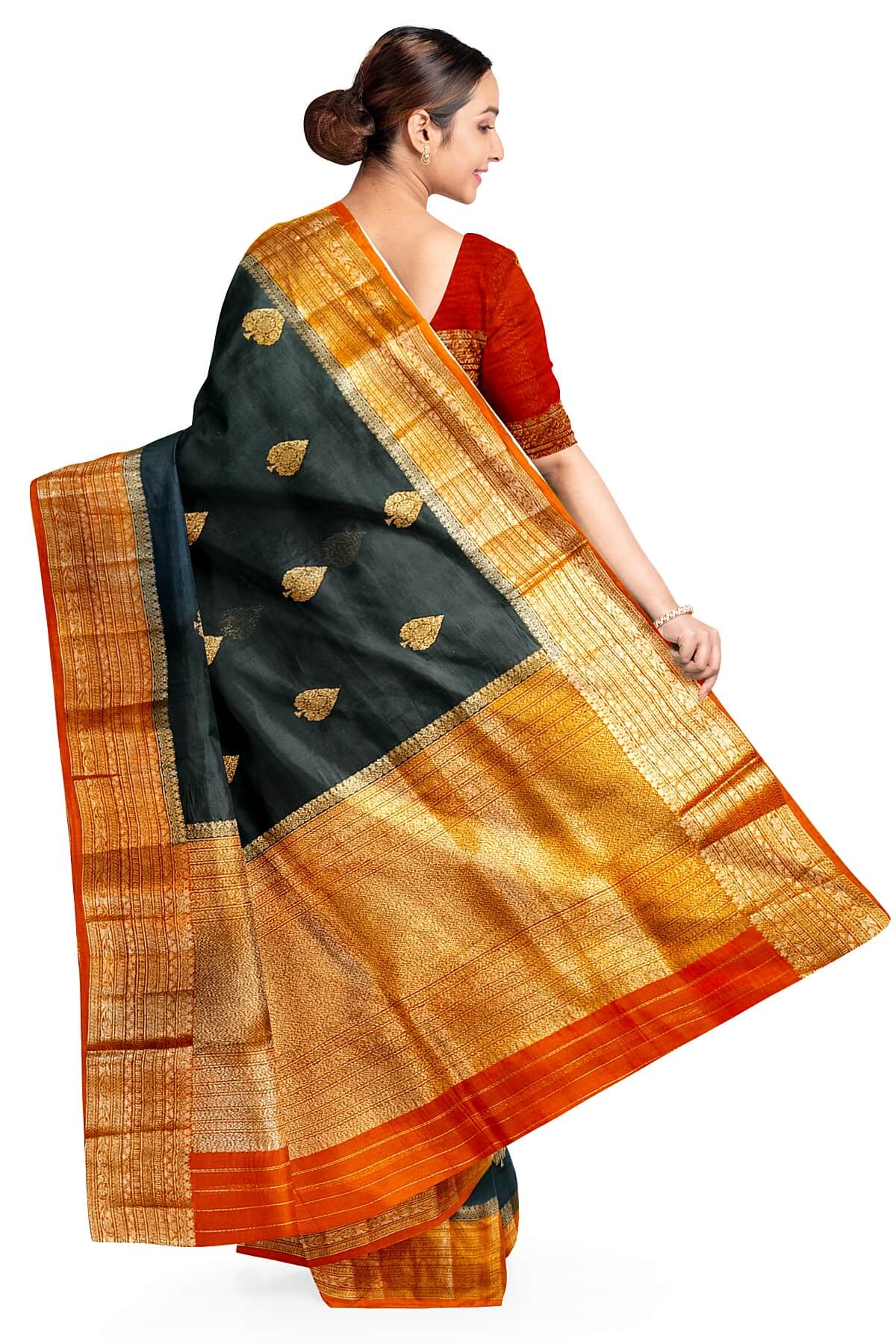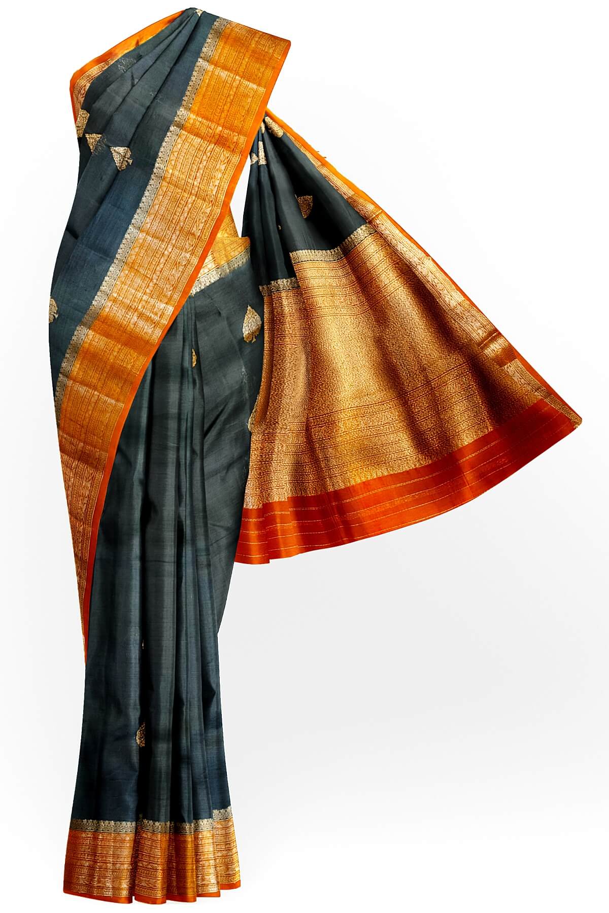 Banarasi kora ( organza) silk saree in black with gold motifs.