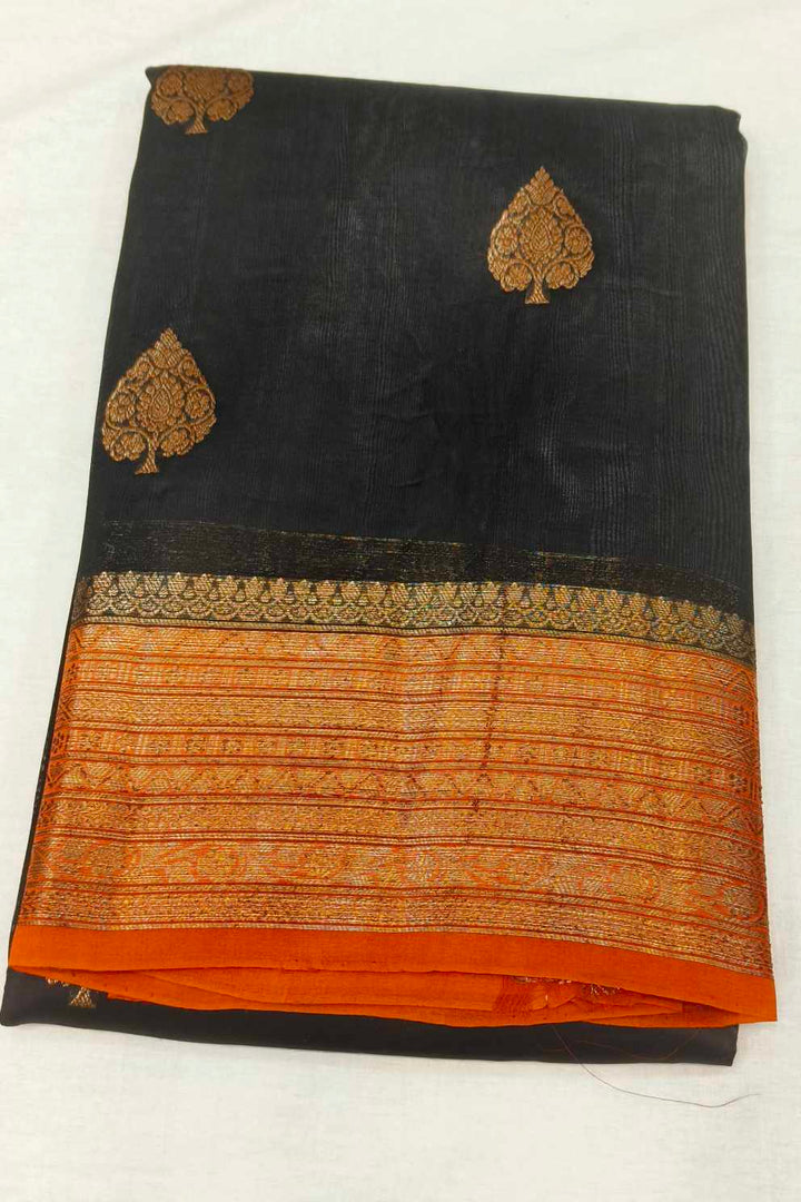 Banarasi kora ( organza) silk saree in black with  gold motifs.