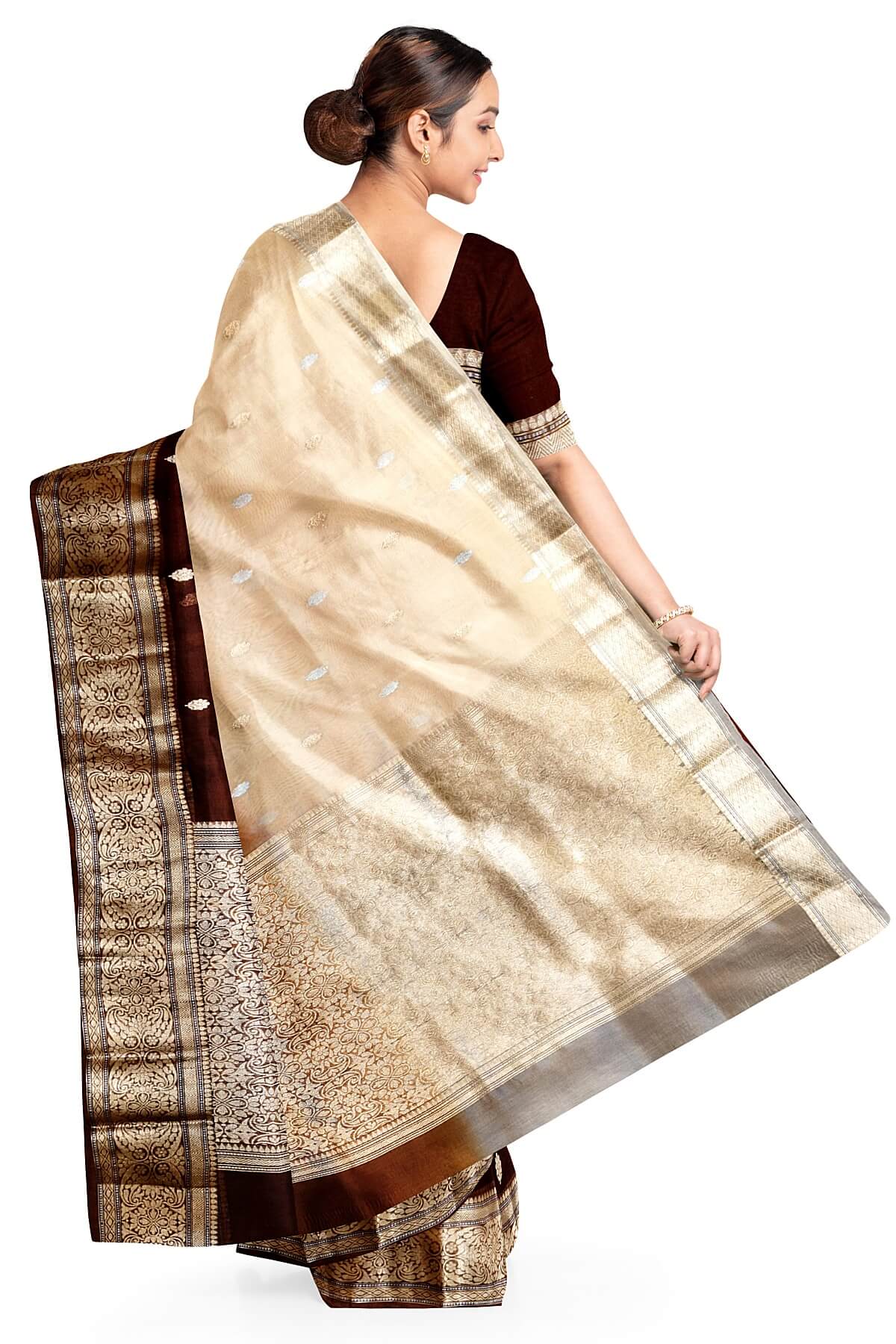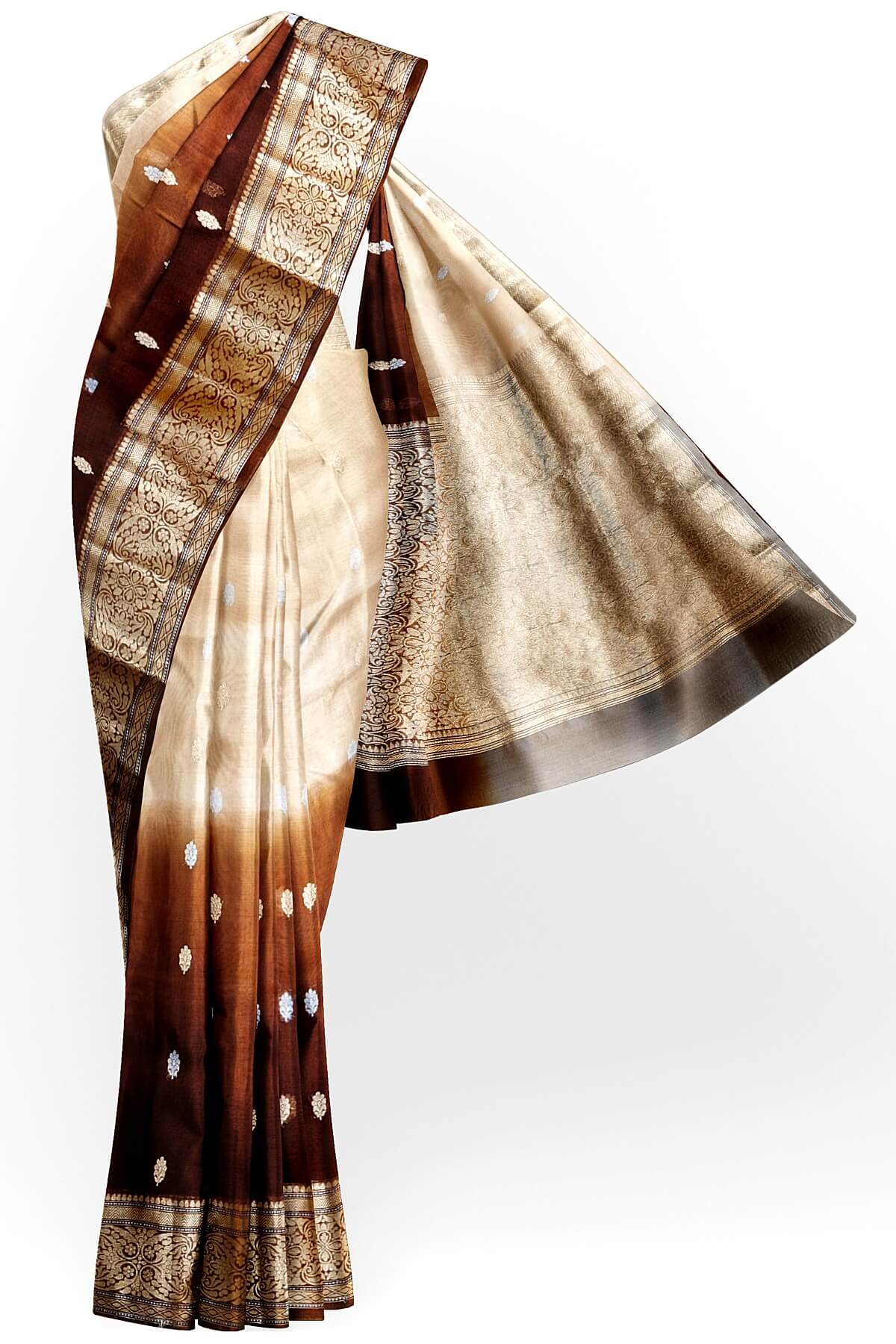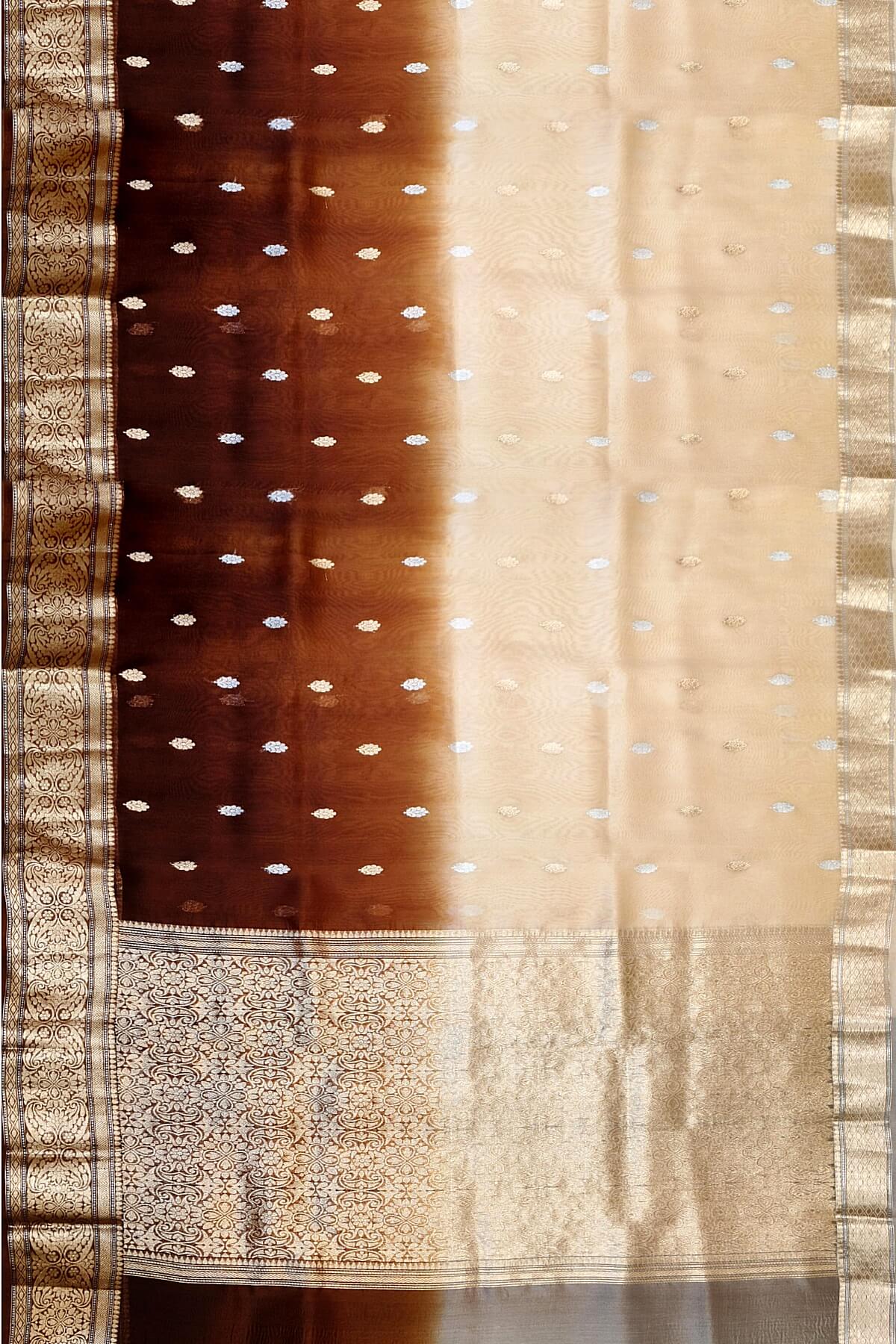 Description: Banarasi kora (organza) silk saree in brown & beige with motifs and a contrast pallu
