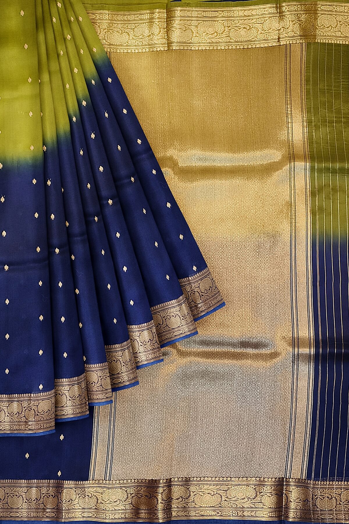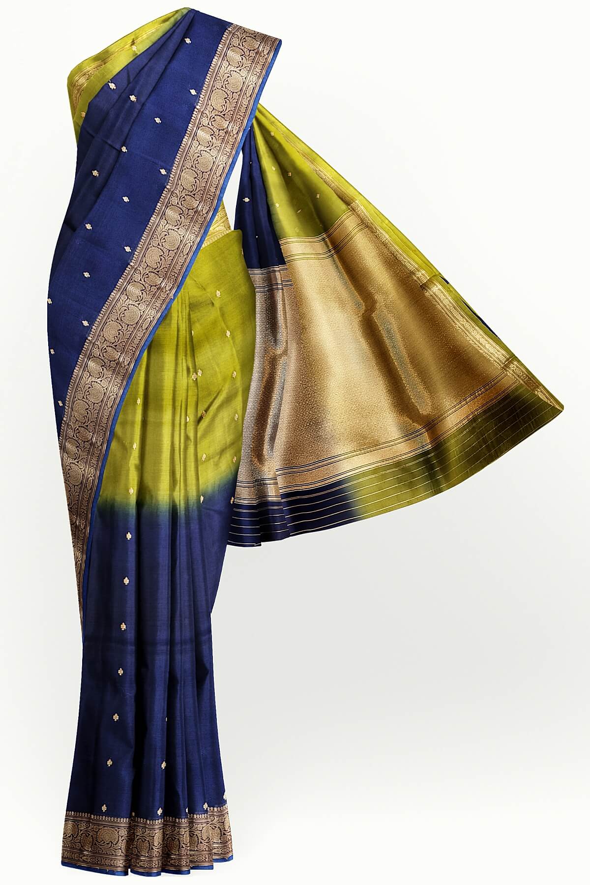 Description: Banarasi kora (organza) silk saree in mehndi green & navy blue with motifs and a contrast pallu